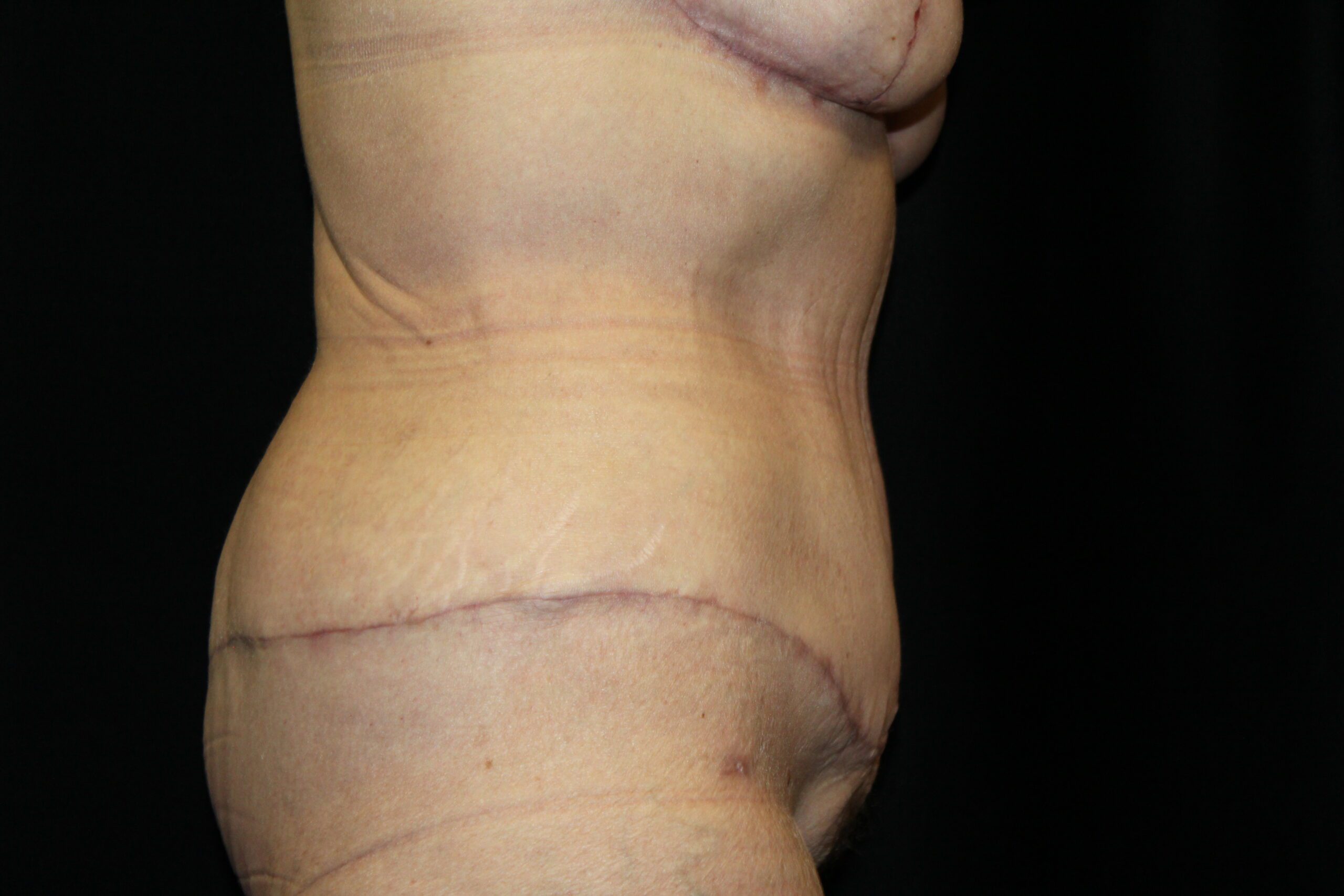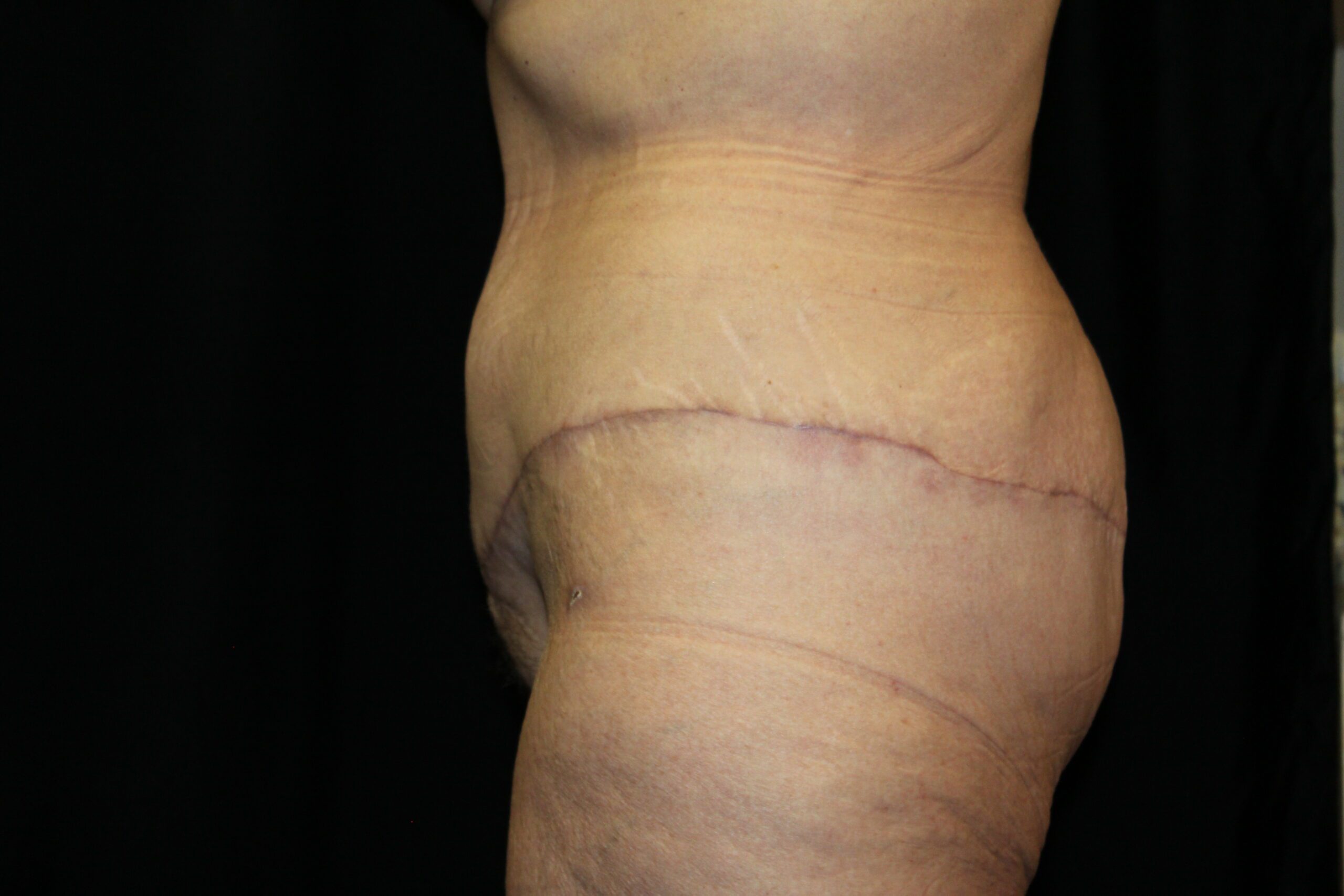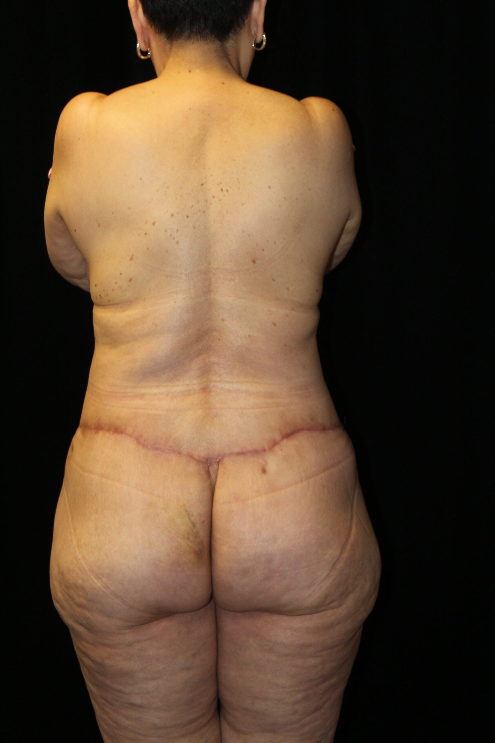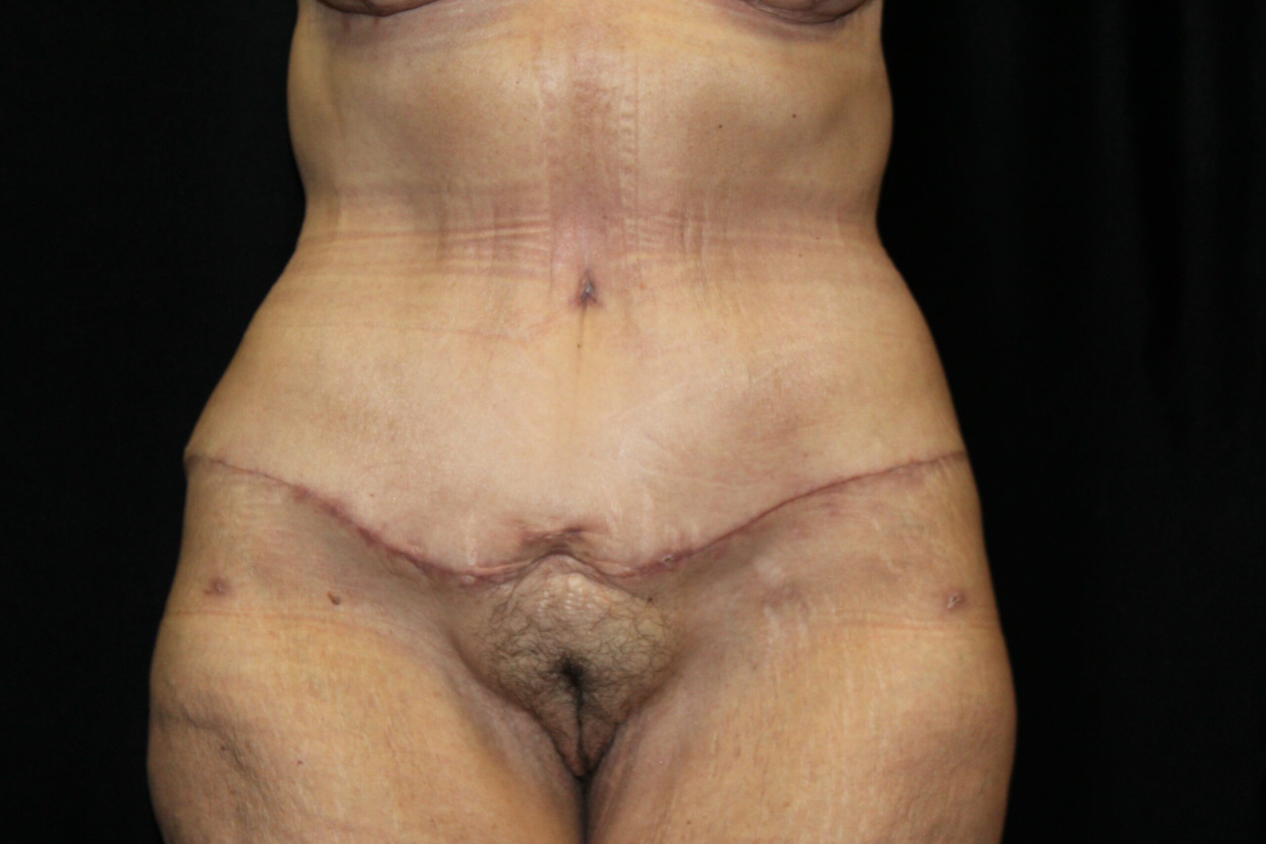 This is a middle aged woman that is 5’4” tall and weighs 140lbs. She has had several pregnancies. She developed some loose skin around her torso from the pregnancies and increase in her weight. She has stretched out abdominal muscles with a diastasis. She underwent a belt lipectomy which involved suctioning of her abdomen and flanks with excision of redundant skin on the lower abdomen and flanks. She is shown two months post op. She has gotten a striking improvement in the figure of her torso. The operation has tightened and firmed up and shaped her bottom. The scars are flat and soft. They are still red but it will improve. The operation elevated, flattened, and triangulated her mons. She has a more muscular shaped abdomen. Her post operative course was unremarkable. At some point, we plan to do an augmentation with a mastopexy. All in all, she got a really nice result.