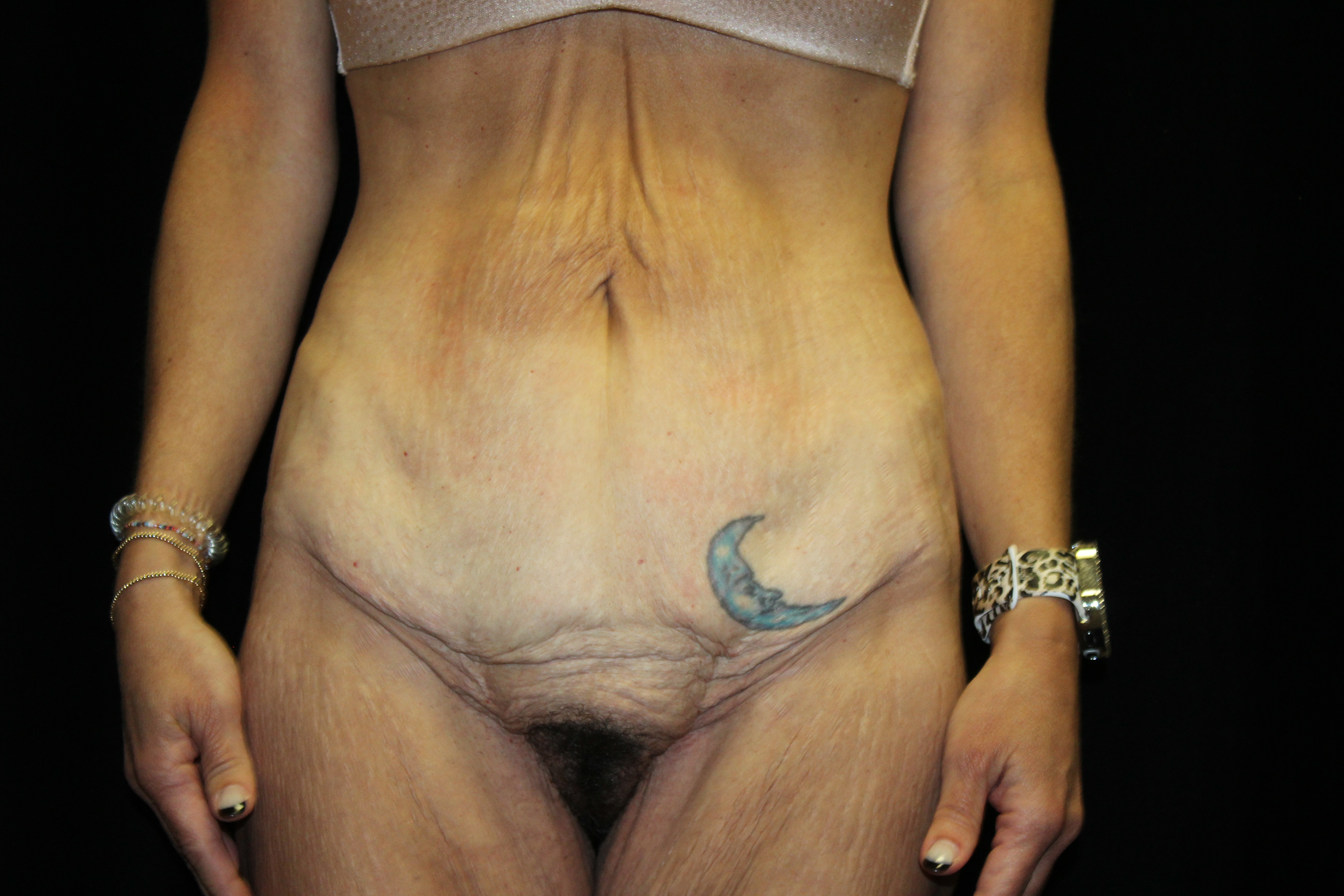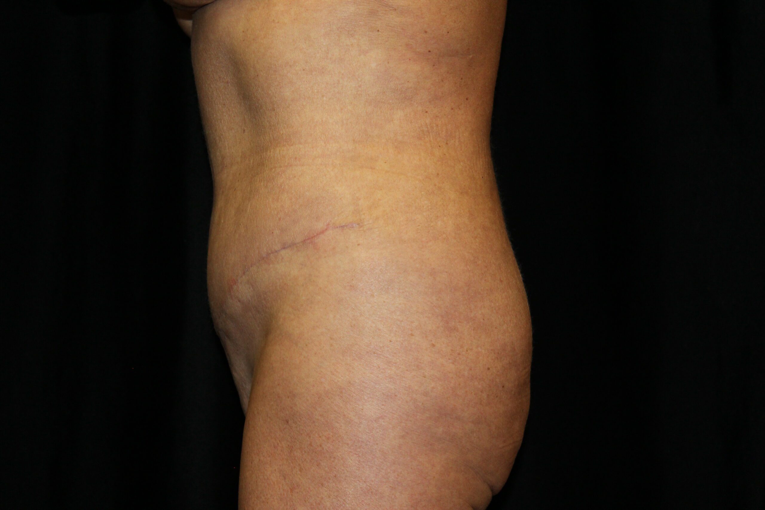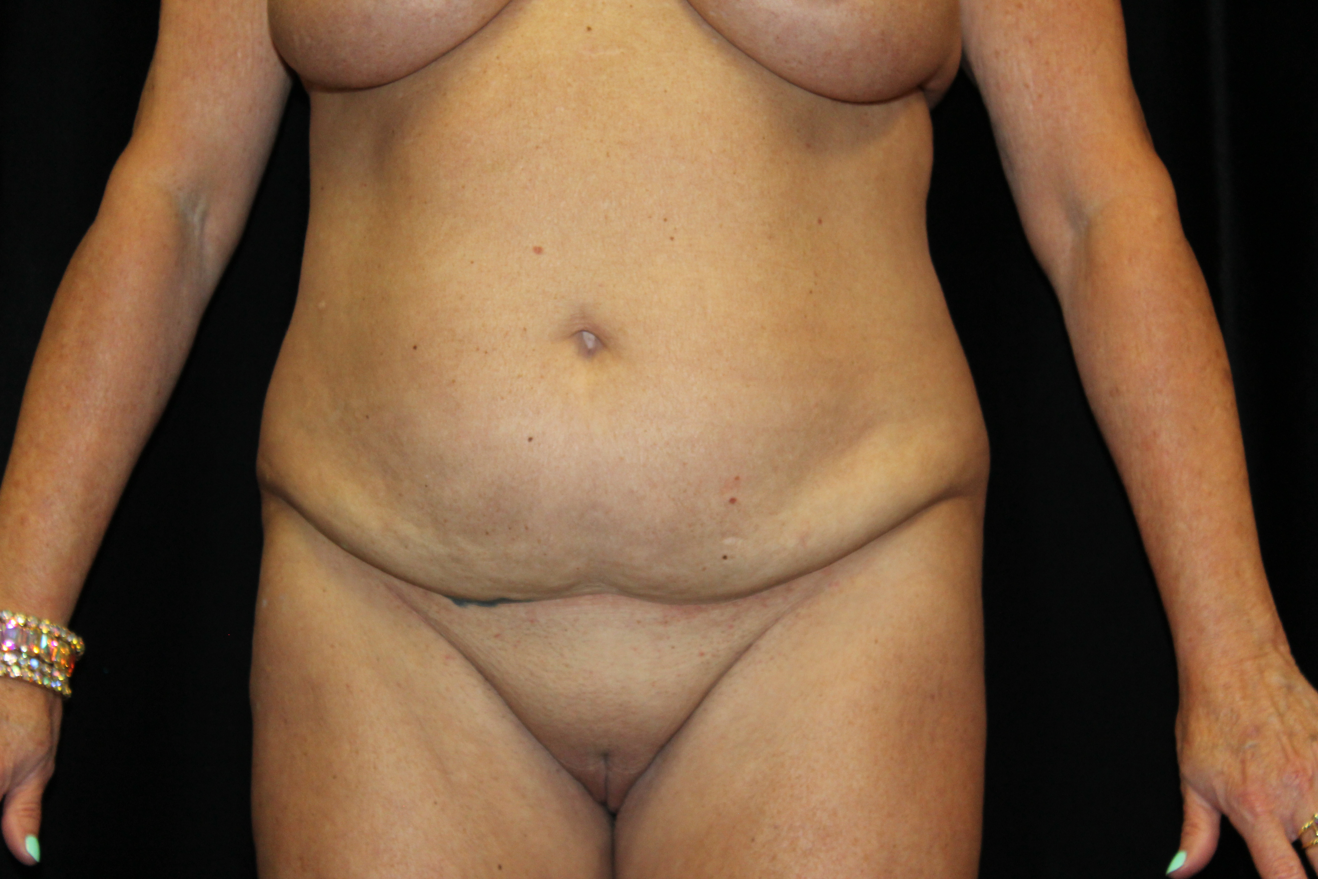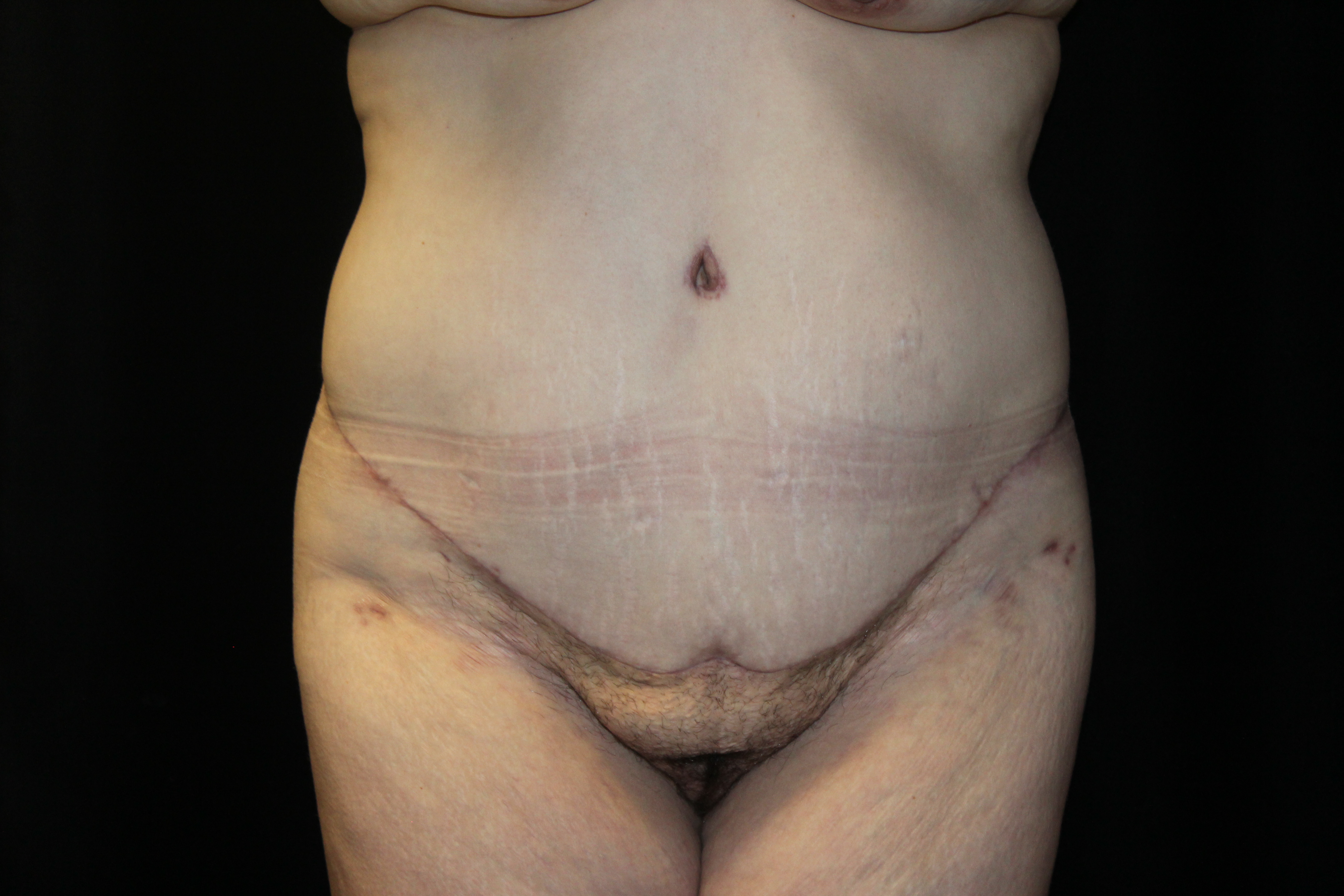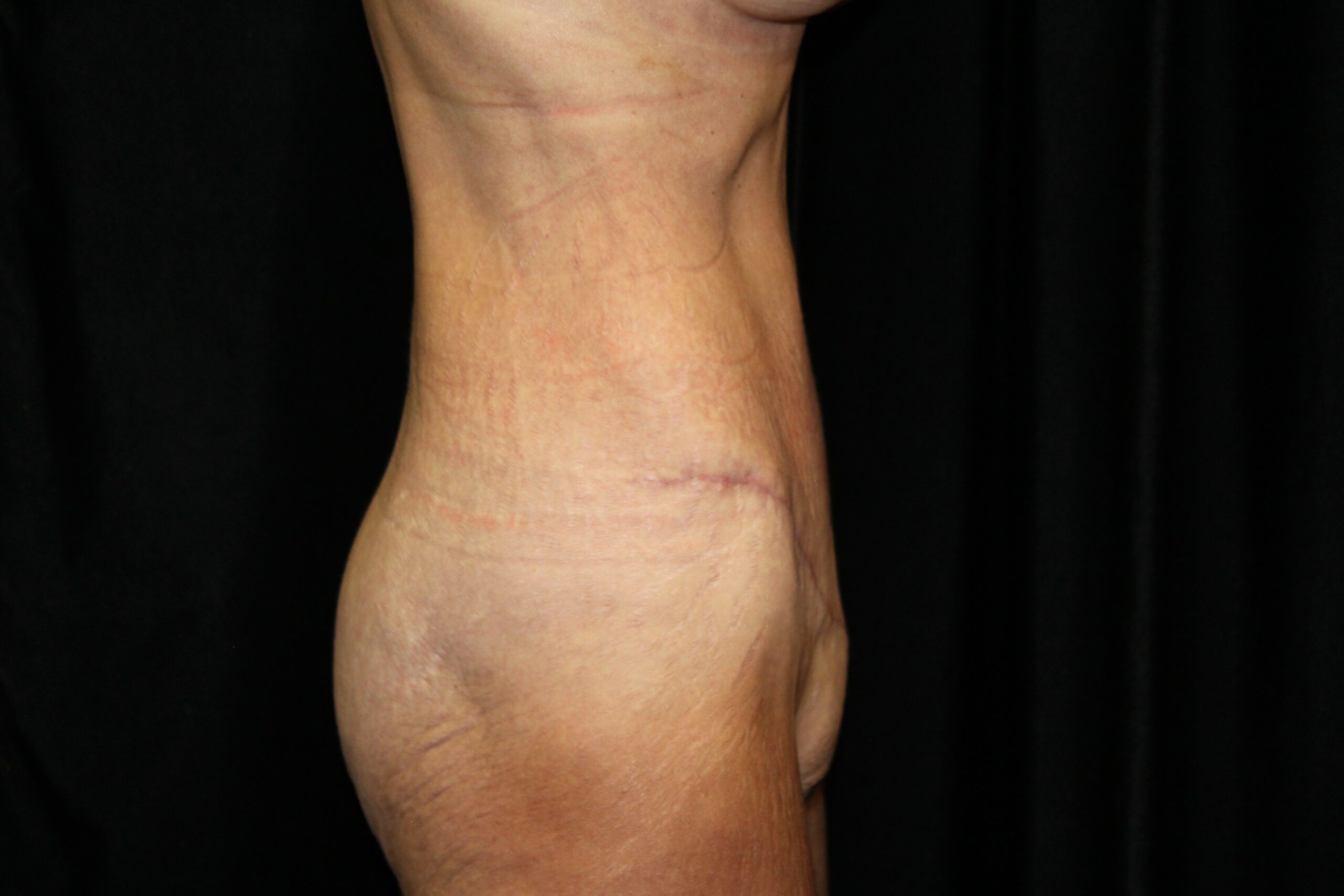 This is a middle aged woman that is 5’4” tall and weighs 140lbs. She has had several pregnancies. She developed some loose skin around her torso from the pregnancies and increase in her weight. She has stretched out abdominal muscles with a diastasis. She underwent a belt lipectomy which involved suctioning of her abdomen and flanks with excision of redundant skin on the lower abdomen and flanks. She is shown two months post op. She has gotten a striking improvement in the figure of her torso. The operation has tightened and firmed up and shaped her bottom. The scars are flat and soft. They are still red but it will improve. The operation elevated, flattened, and triangulated her mons. She has a more muscular shaped abdomen. Her post operative course was unremarkable. At some point, we plan to do an augmentation with a mastopexy. All in all, she got a really nice result.