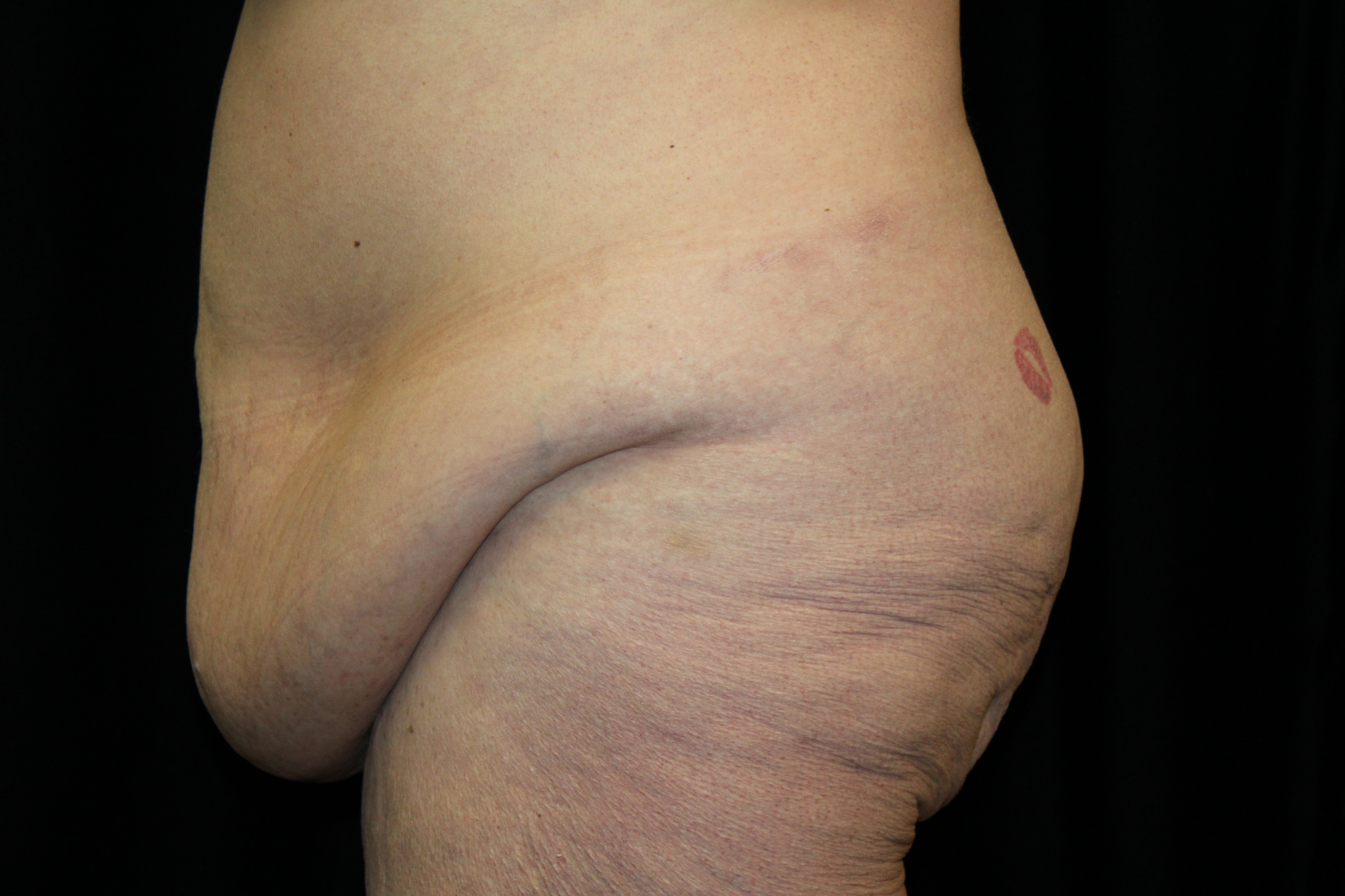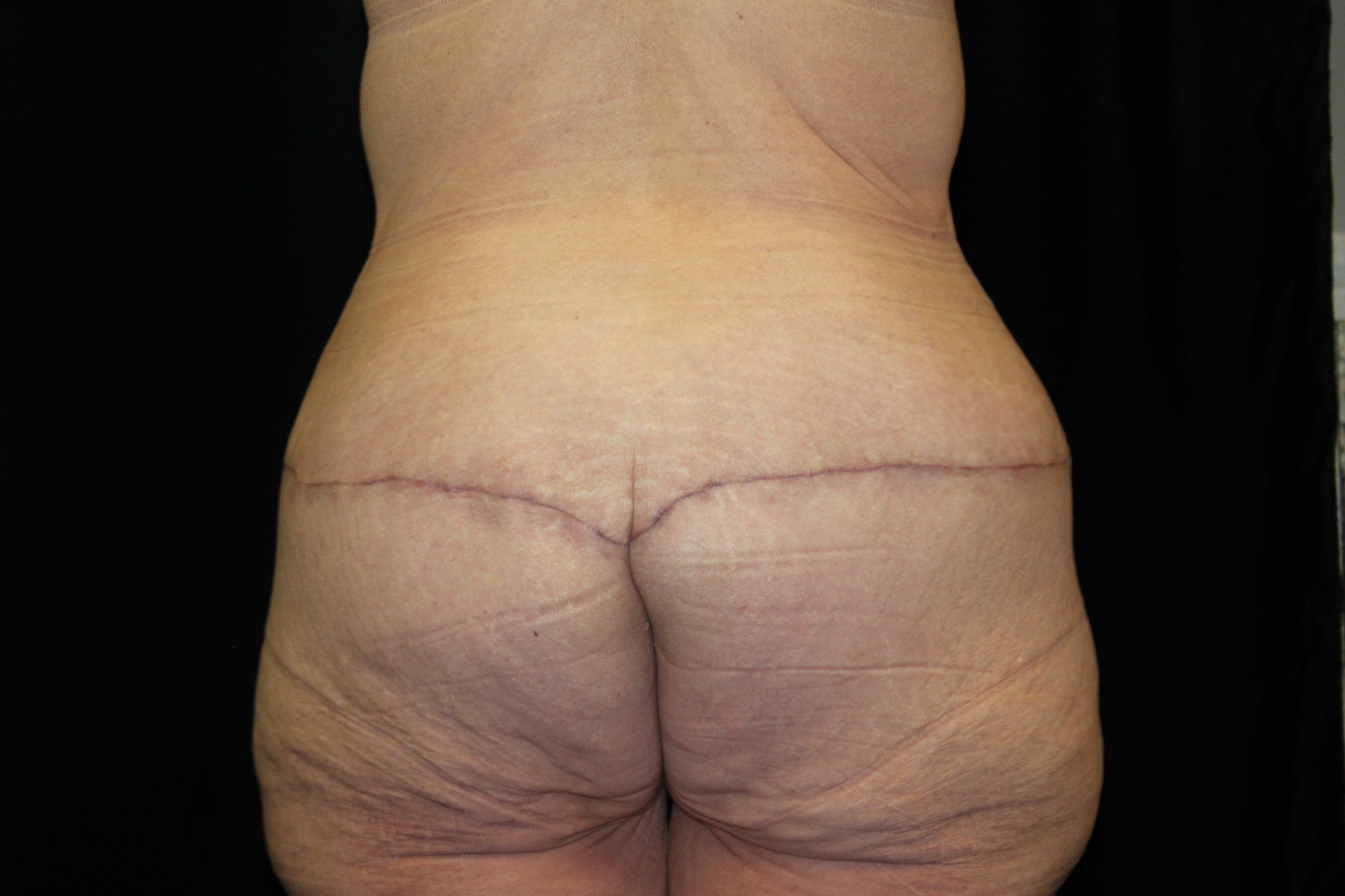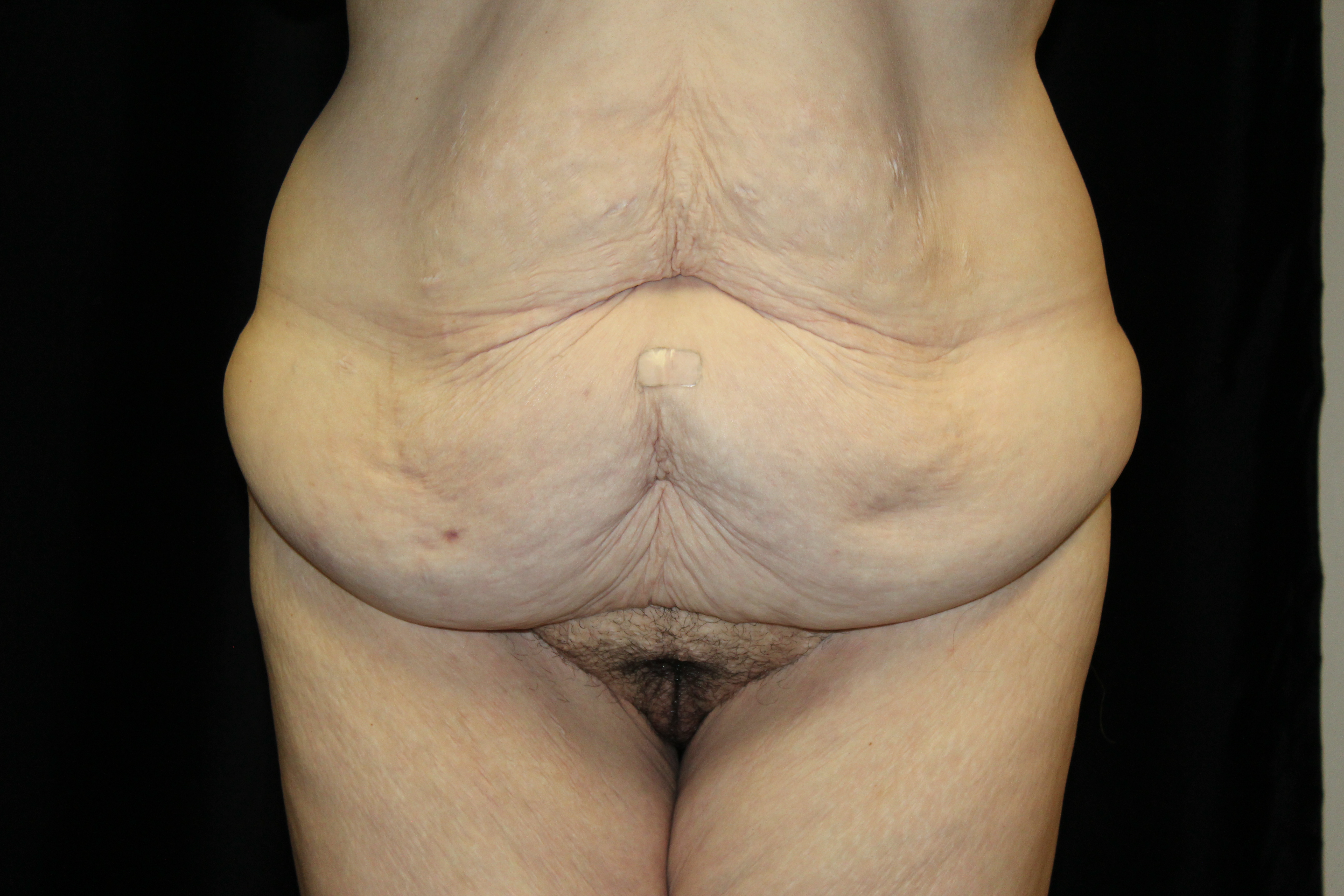 This is a middle-aged lady who wished some improvement in her truncal contour. She is 5’3″ tall and weighs 170 lbs. Preoperatively she had thick subcutaneous fat across the upper abdomen, a small panus, and the genitals were ptotic. On her backside she had a lot of fullness, fat, and excess skin across the flanks which gave her backside a square appearance. She underwent a belt lipectomy which incoperates liposuction. This converted her square shape to a more feminine “S” shape on her backside. This elevated and flattened out her mons and gave her a waistline. She had an uneventful recovery and has gotten a very gratifying result.