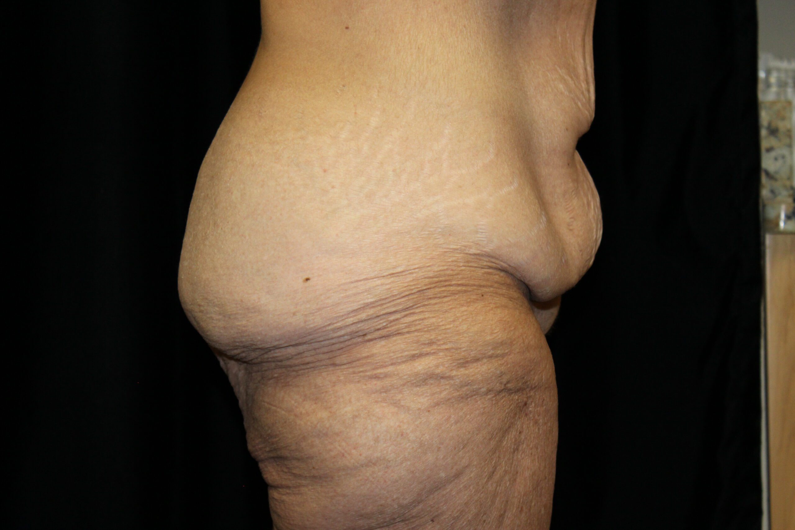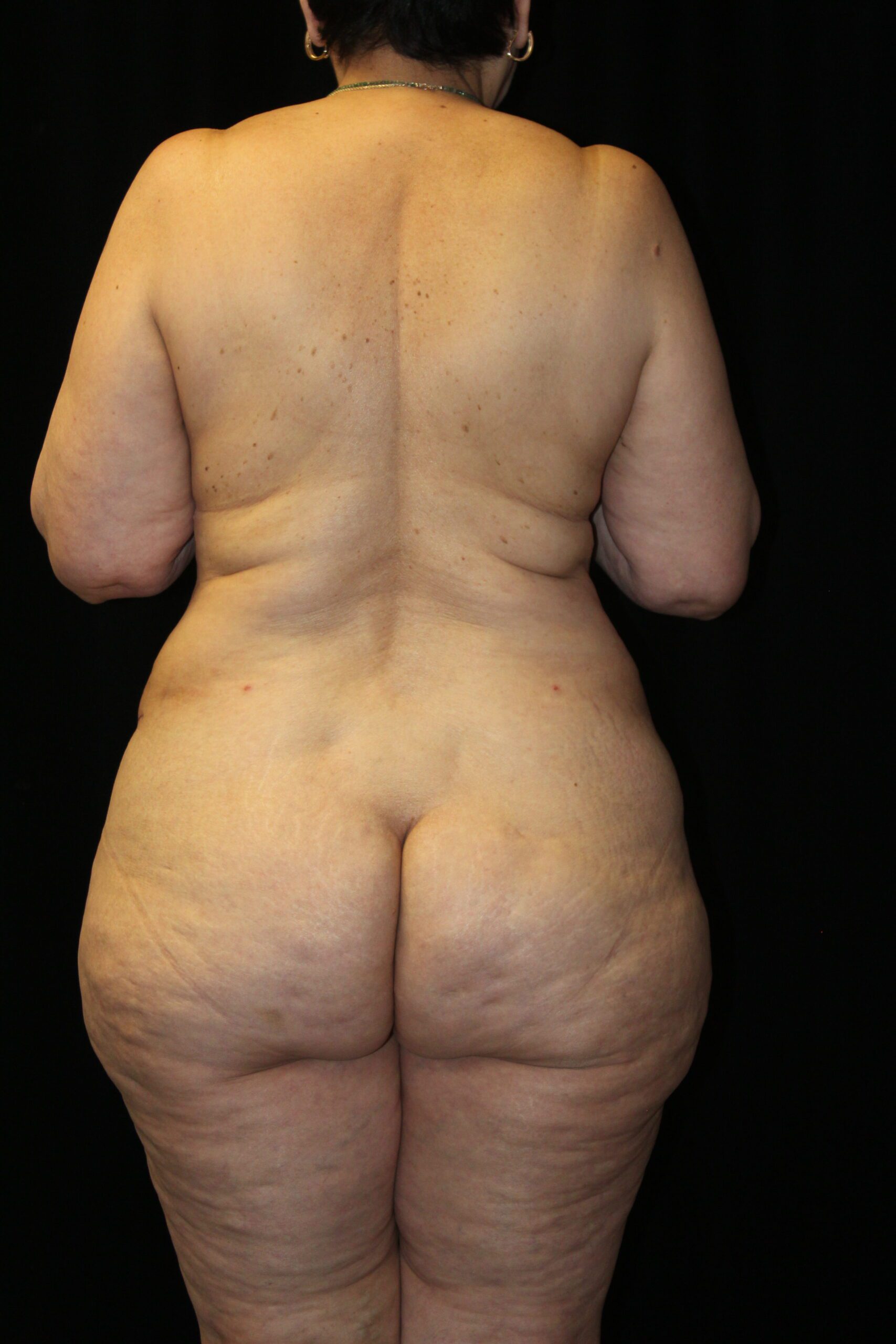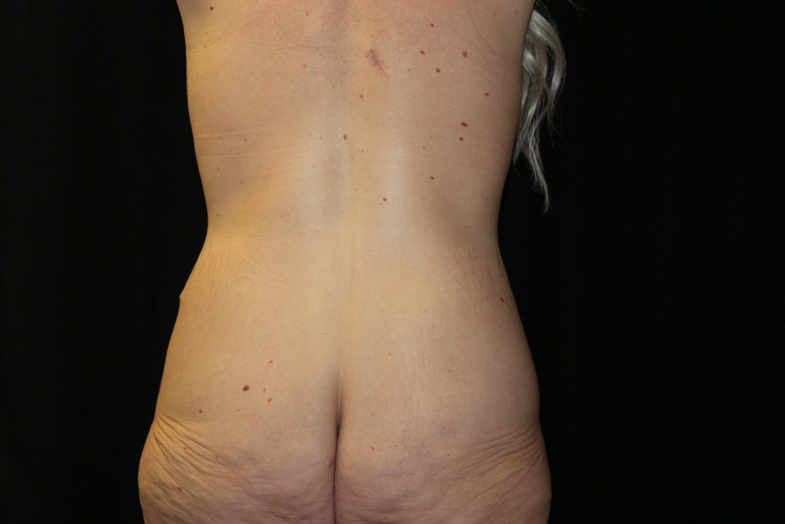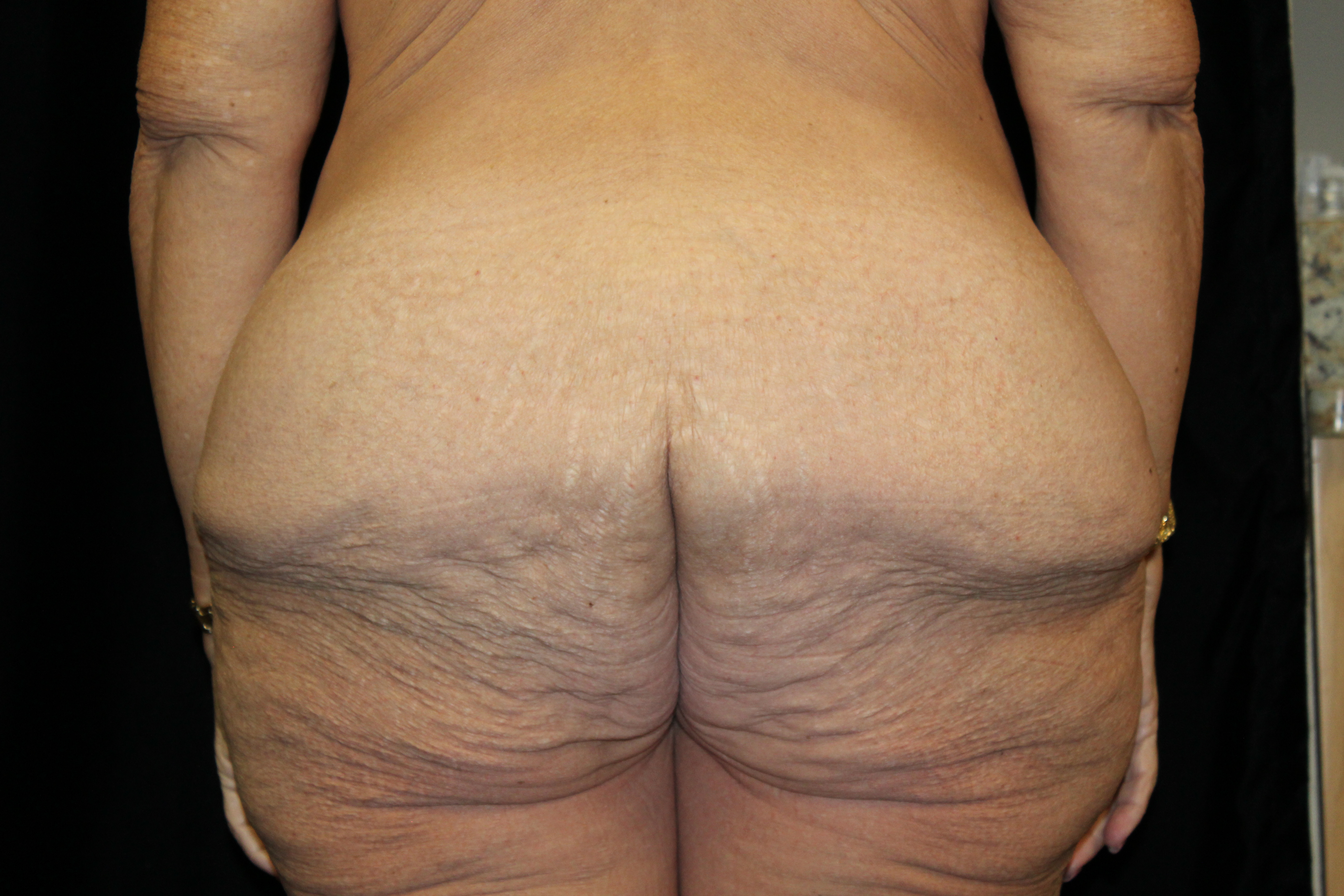 This is a middle-aged lady who wished some improvement in her truncal contour. She is 5’3″ tall and weighs 170 lbs. Preoperatively she had thick subcutaneous fat across the upper abdomen, a small panus, and the genitals were ptotic. On her backside she had a lot of fullness, fat, and excess skin across the flanks which gave her backside a square appearance. She underwent a belt lipectomy which incoperates liposuction. This converted her square shape to a more feminine “S” shape on her backside. This elevated and flattened out her mons and gave her a waistline. She had an uneventful recovery and has gotten a very gratifying result.