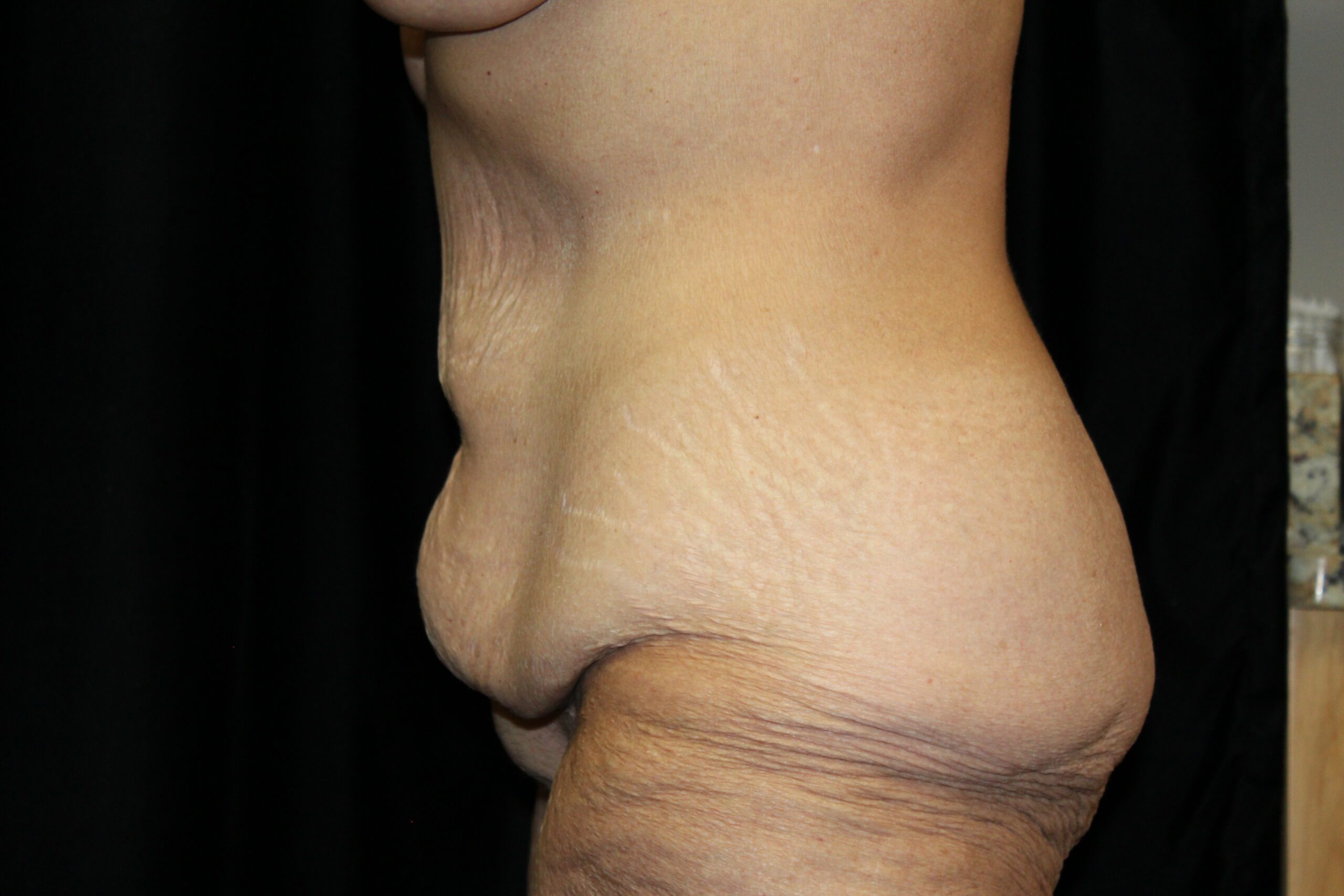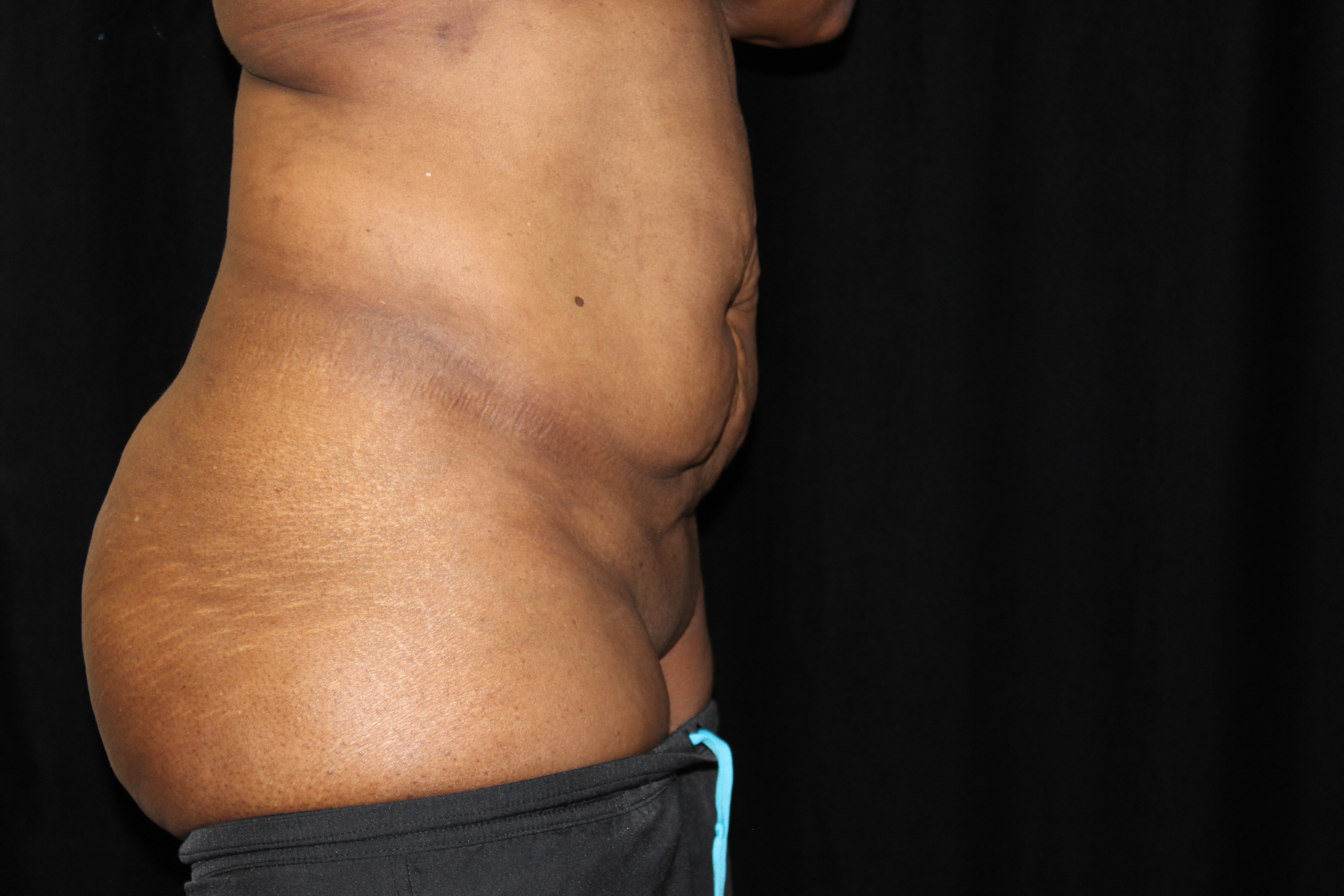 This is a young lady who has had 3 children. She is a workout person and despite all of her efforts was unable to improve the appearance of her torso specifically her abdomen. She has a protuberant rounded abdomen from her muscles being stretched. She had loose skin that extended all the way around the torso. An abdominoplasty alone would not have addressed the loose skin across her flanks and buttocks. She underwent a belt lipectomy which tightened the loose, abdominal muscles, flattened her abdomen, and also tightened the loose skin that extended around the torso. This also included suctioning of the flanks that gave her a more feminine backside shape. She had an uneventful recovery and has gotten a very nice result.