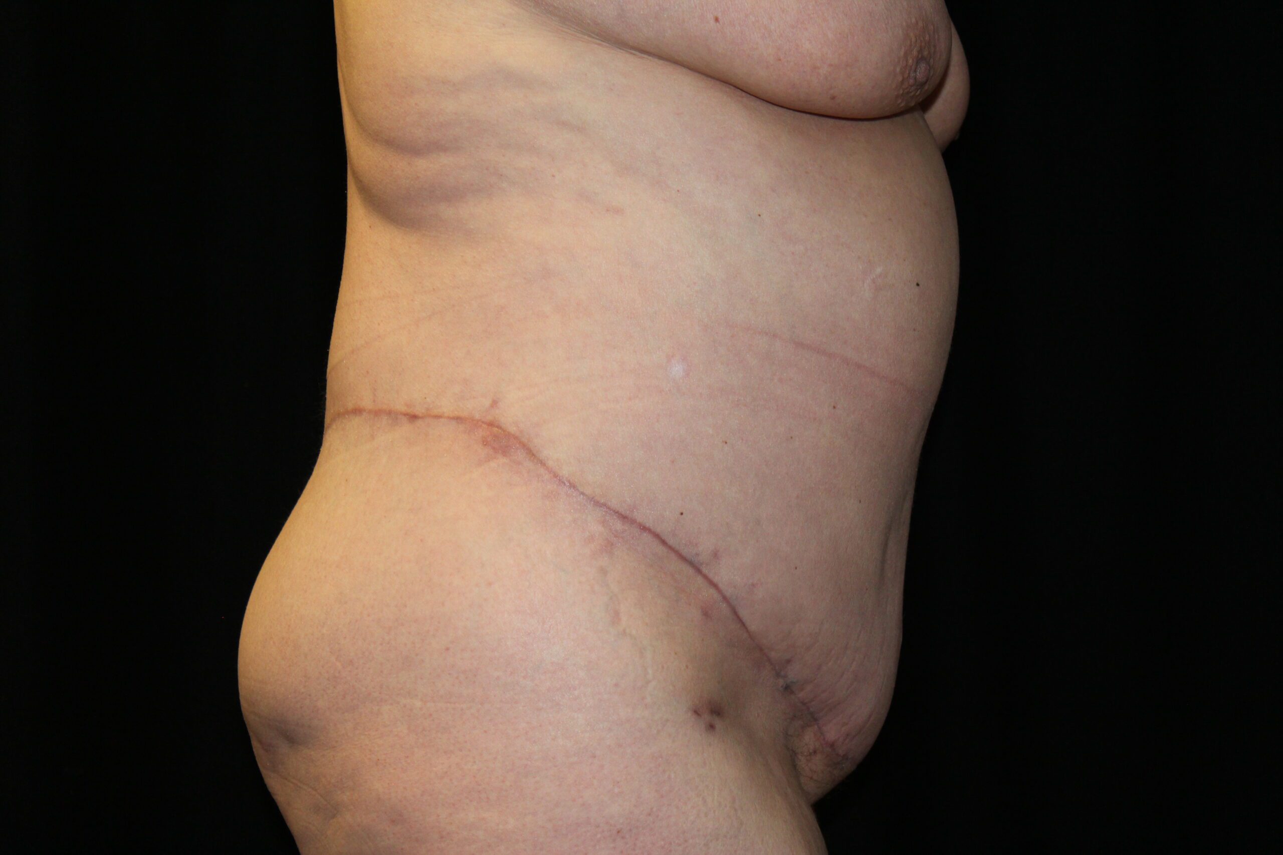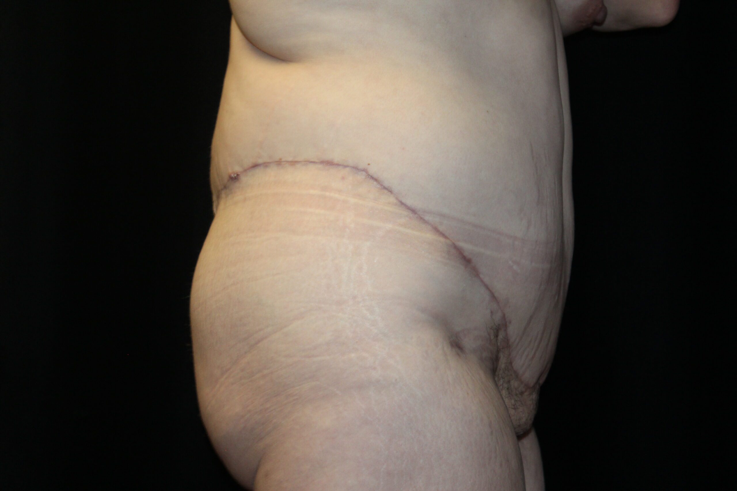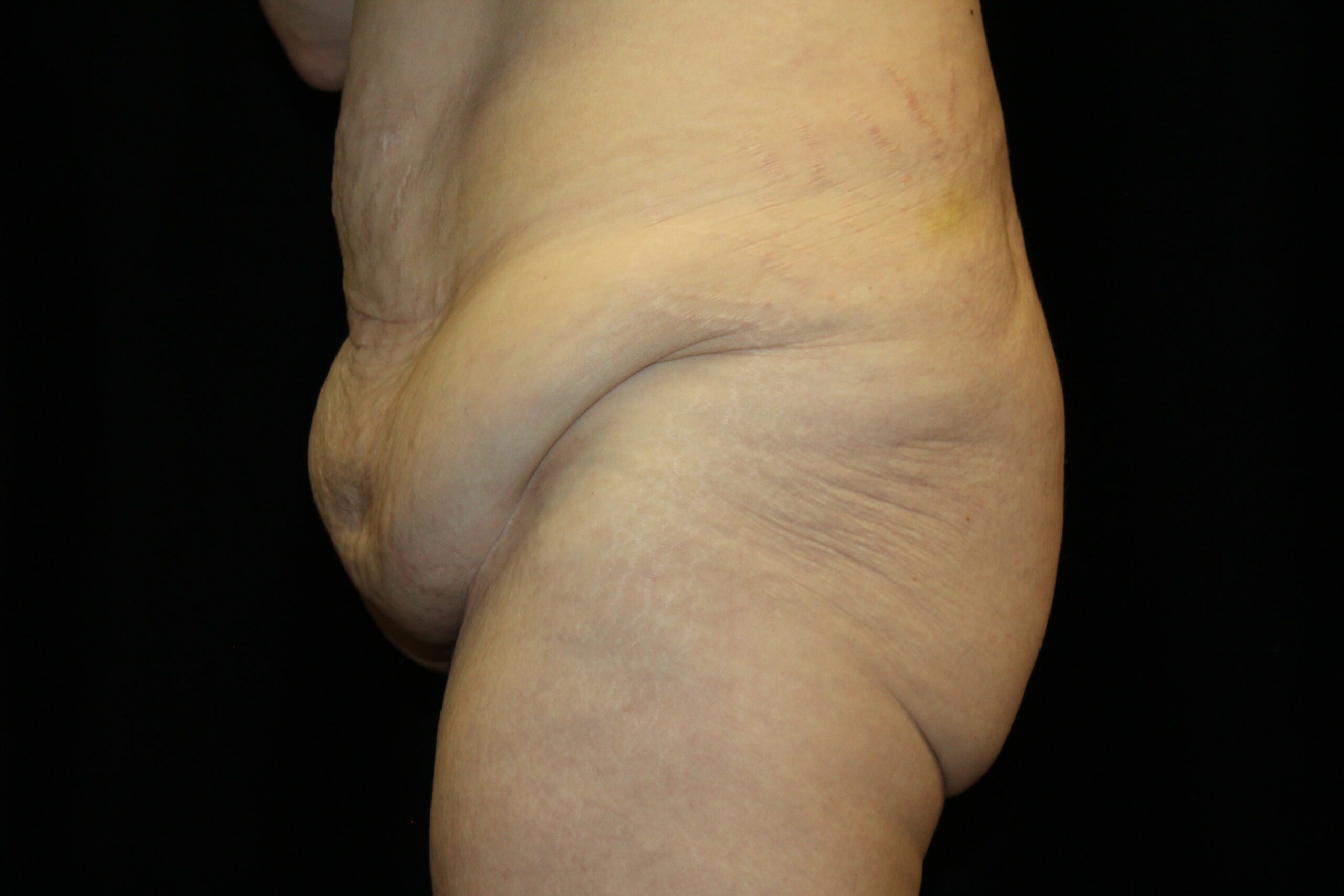 This is a lady that had a large, hanging abdominal panniculus. She underwent a belt lipectomy to remove the hanging skin and fat. Also, after removing the panniculus she was able to get more active which helped her lose some more weight. As you can see she now has a good shape to her abdomen and body.