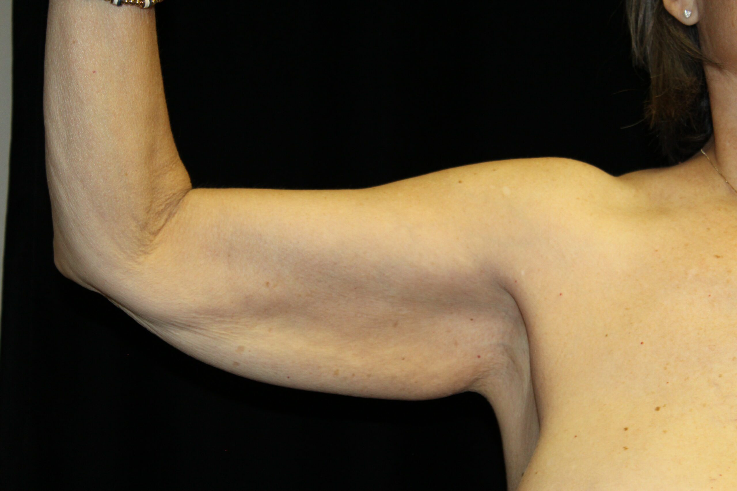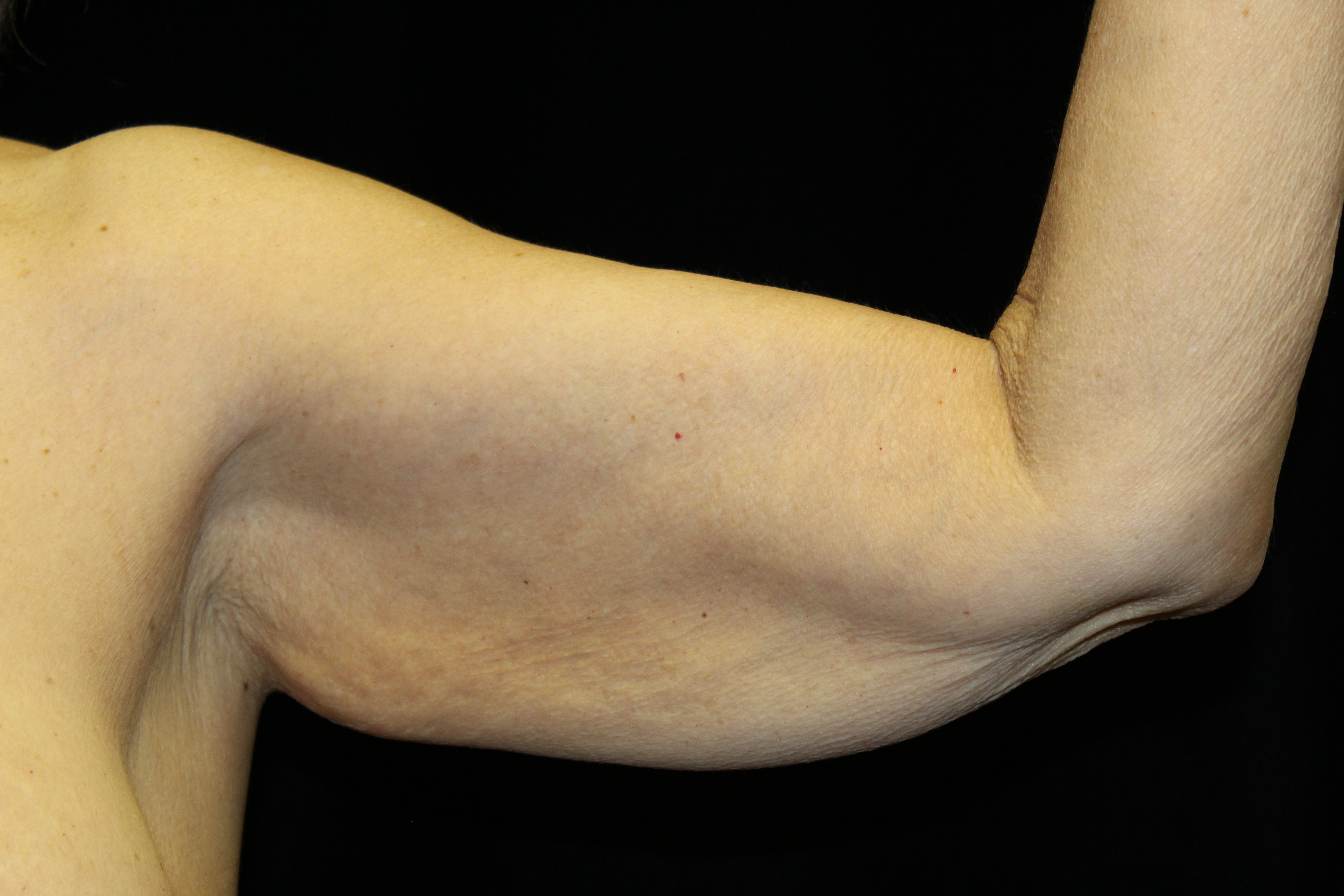 This is a 60YO lady that has some extra fat in her arms as well as hanging skin. This markedly limited the clothing that she could wear especially sleeveless shirts, dresses, and blouses. She underwent a brachioplasty. As you can see we have excised excessive skin and fat. The scar runs right in the inside of the arm so that it can be hidden with most clothing. The scar is most noticeable when the arms are raised.