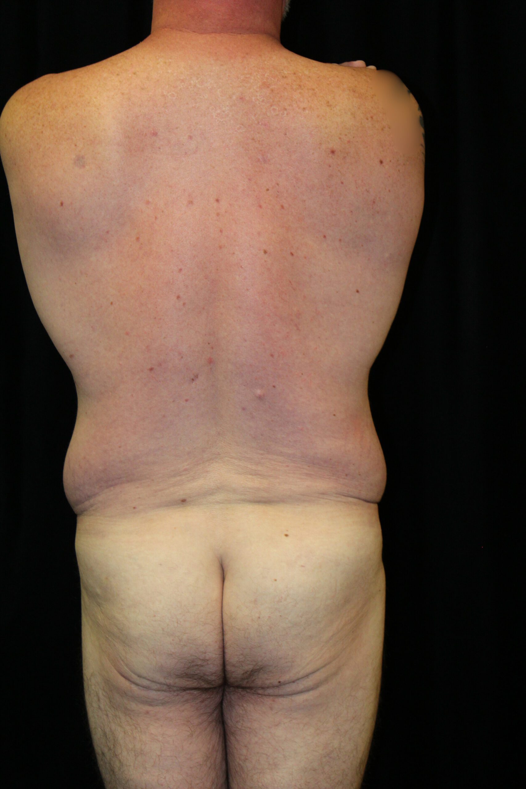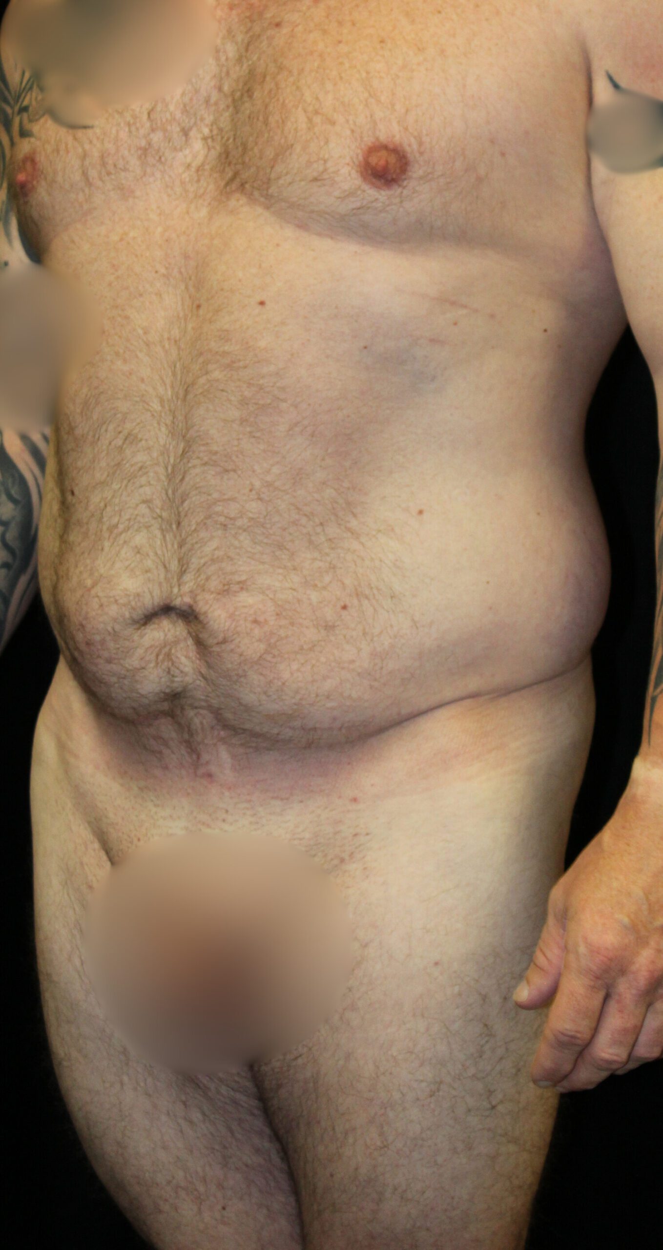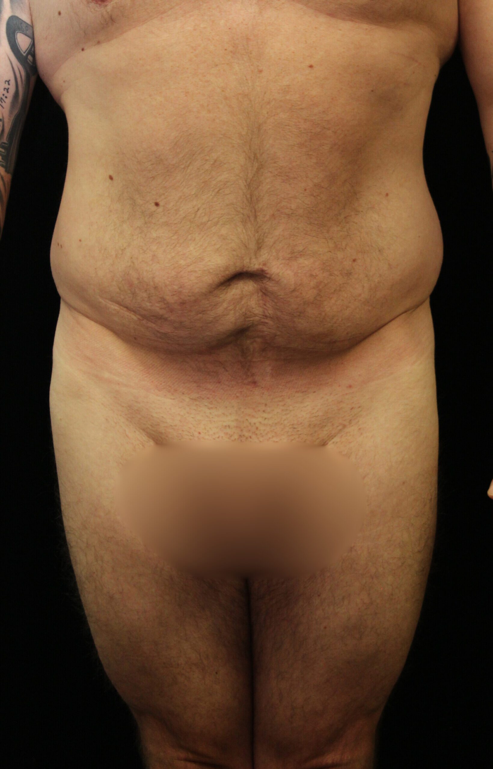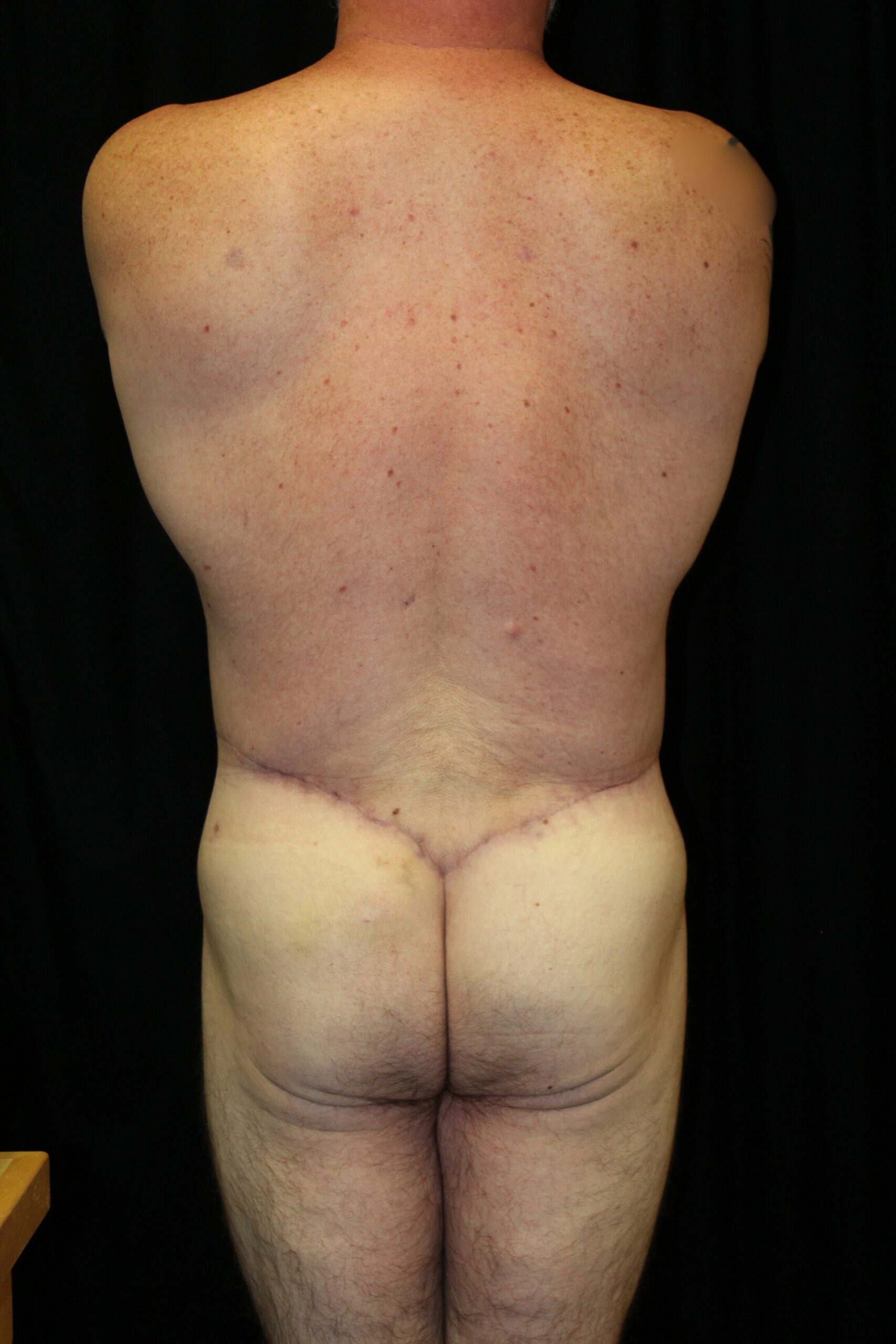 This is a healthy middle-aged gentleman that had lost a great deal of weight with diet and exercise. He has primarily loose skin which piles up around his trousers. On exam, he has a diastasis with separation of the rectus muscles in the midline. He had a rounded abdomen. The excess skin pannus is small. He underwent a belt lipectomy that involved suctioning of the flank collections and resection of the anterior skin bilaterally. I also did some suctioning on the front side. He has gotten a very nice result with a contoured torso and a much more defined waist. He now has a very aesthetic, athletic male bottom.