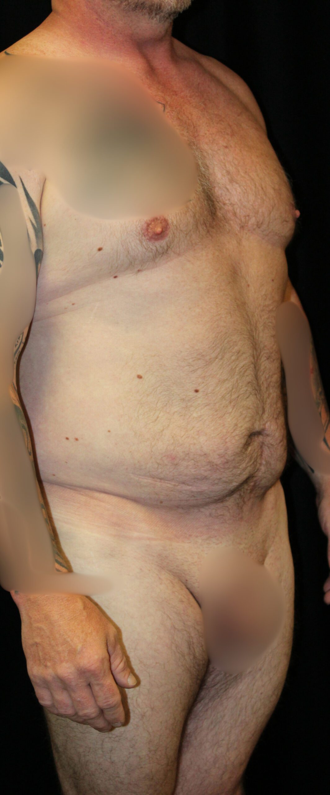This is a healthy male who wished some improvement in his truncal contour. The circumference of his abdomen at the level of the umbilicus is 40.5”. He wanted it around 36”. We carried him to the operating room and did liposuction of his lower abdomen and his flanks. Shown are before and about 2-3 months post op. The biggest change is the large flank collections on either side which are basically gone. His measurement around the circumference of his abdomen at the umbilicus is now 36”. He has gotten a nice result. This deep fat that forms the flank collections once removed will usually not come back.