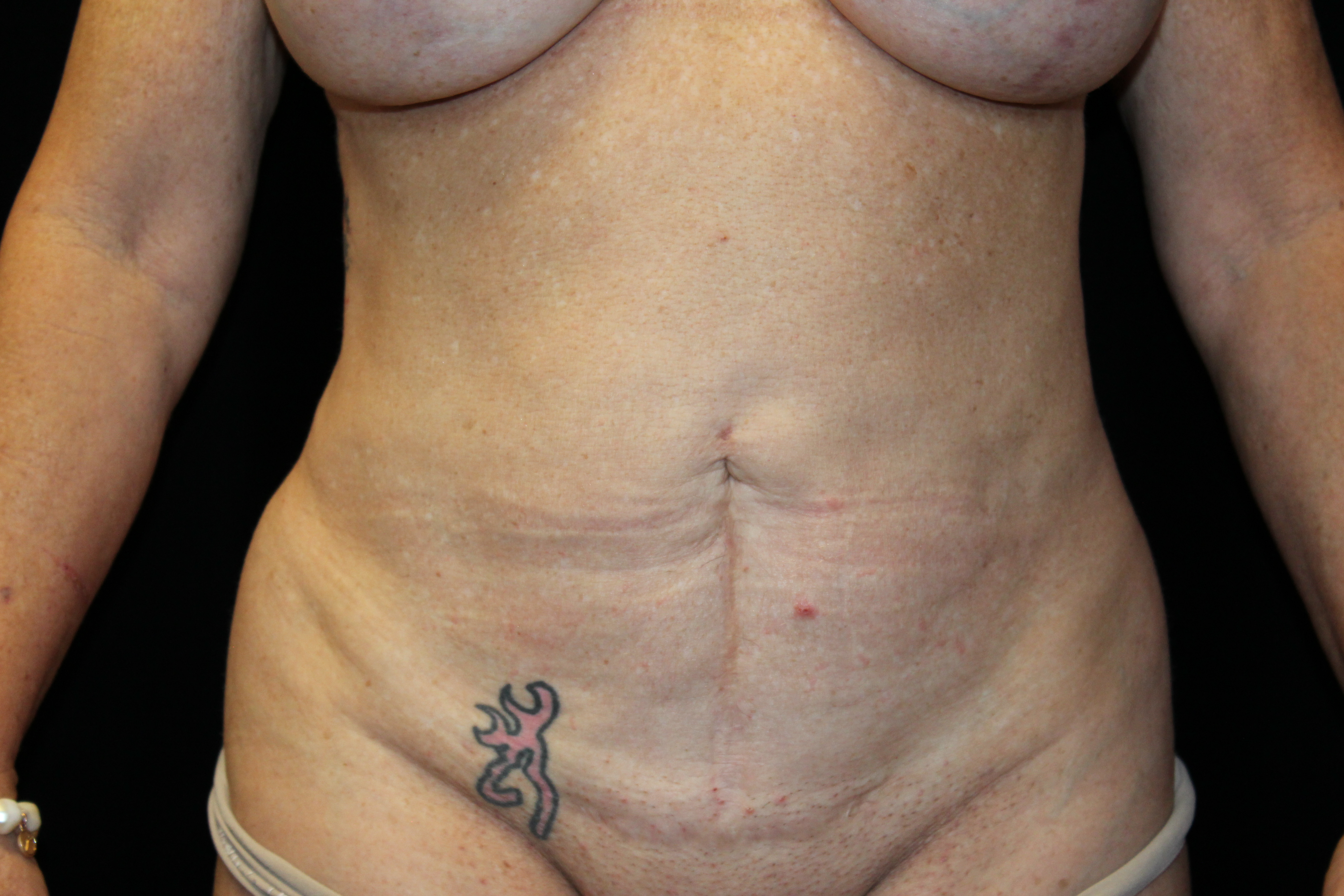 This is a lady that had tight muscles of her abdomen and did not need a formal abdominoplasty. I was able to do a skin excision on the abdomen instead of doing an abdominoplasty. This is a much more benign procedure done through outpatient. As you can see, she now has a very tight abdomen. The scars will be red for about 9 months and when the redness fades they will not be very noticeable.
