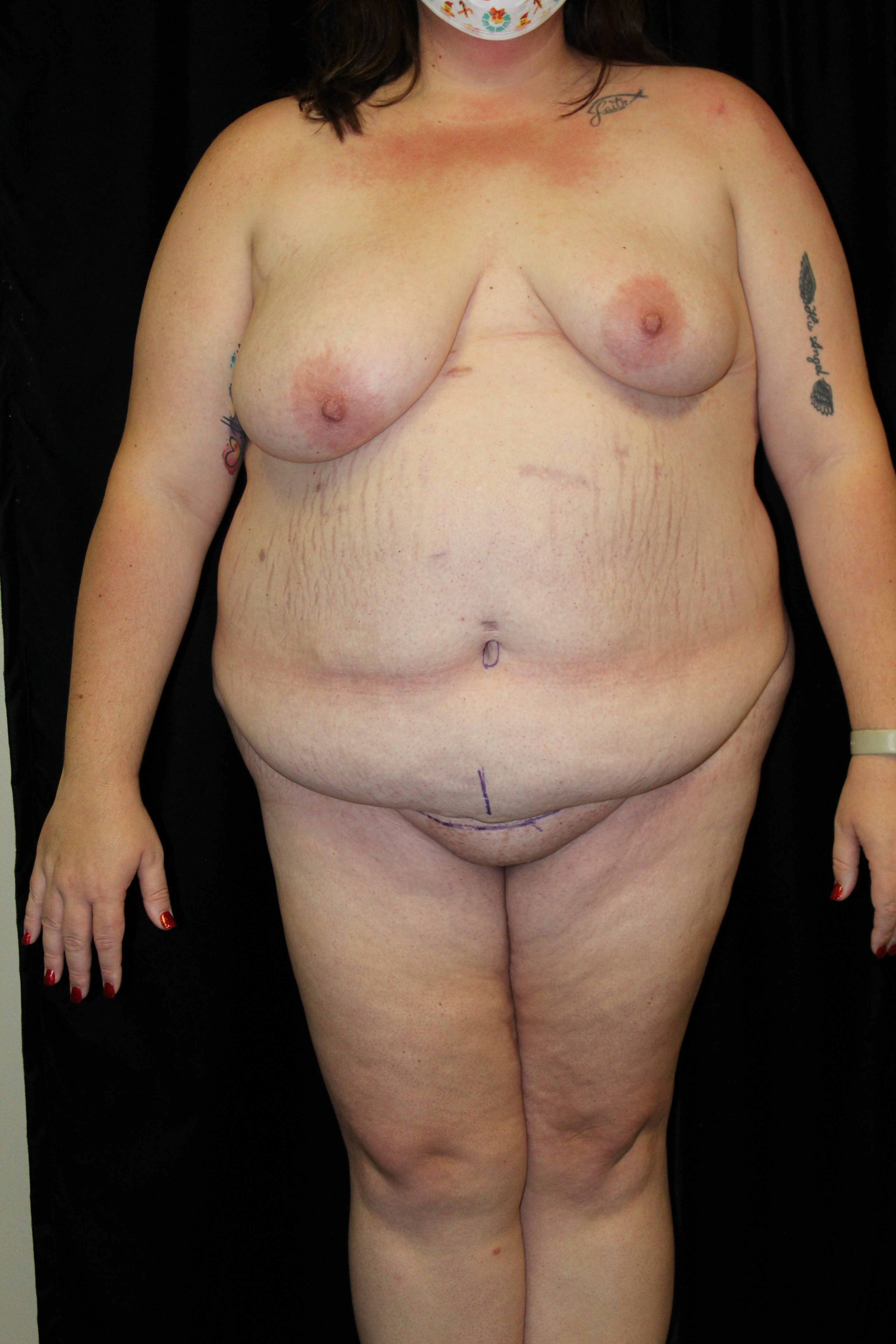 These are pre and post op photos on a lady that had a family history of breast cancer. Her odds of contracting breast cancer in her lifetime was about 30%. In the consultation with her general surgeon, she opted for bilateral mastectomies with reconstruction. She is 5’8” tall and weighs 215lbs. Her breast size was a 38C. She wished to be considerably larger than her present size and her breasts back up on her chest. She underwent bilateral mastectomies with staged reconstruction using tissue expanders and dermal matrix. She ultimately had 800cc silicone gel implants placed with fat grafting for symmetry. The breasts are nicely shaped and symmetrical. She has some upper pole fullness. The nipple areolar complexes have good projection. All in all, she got a very nice result.