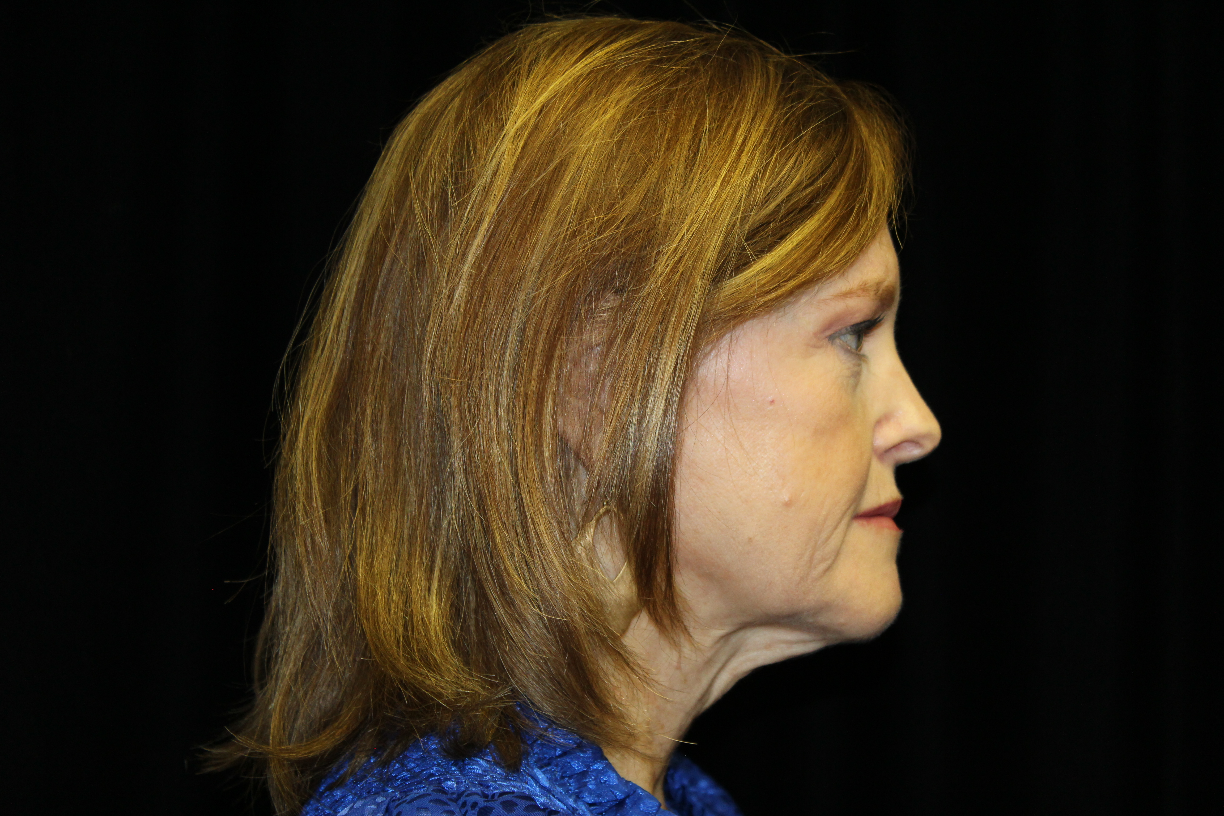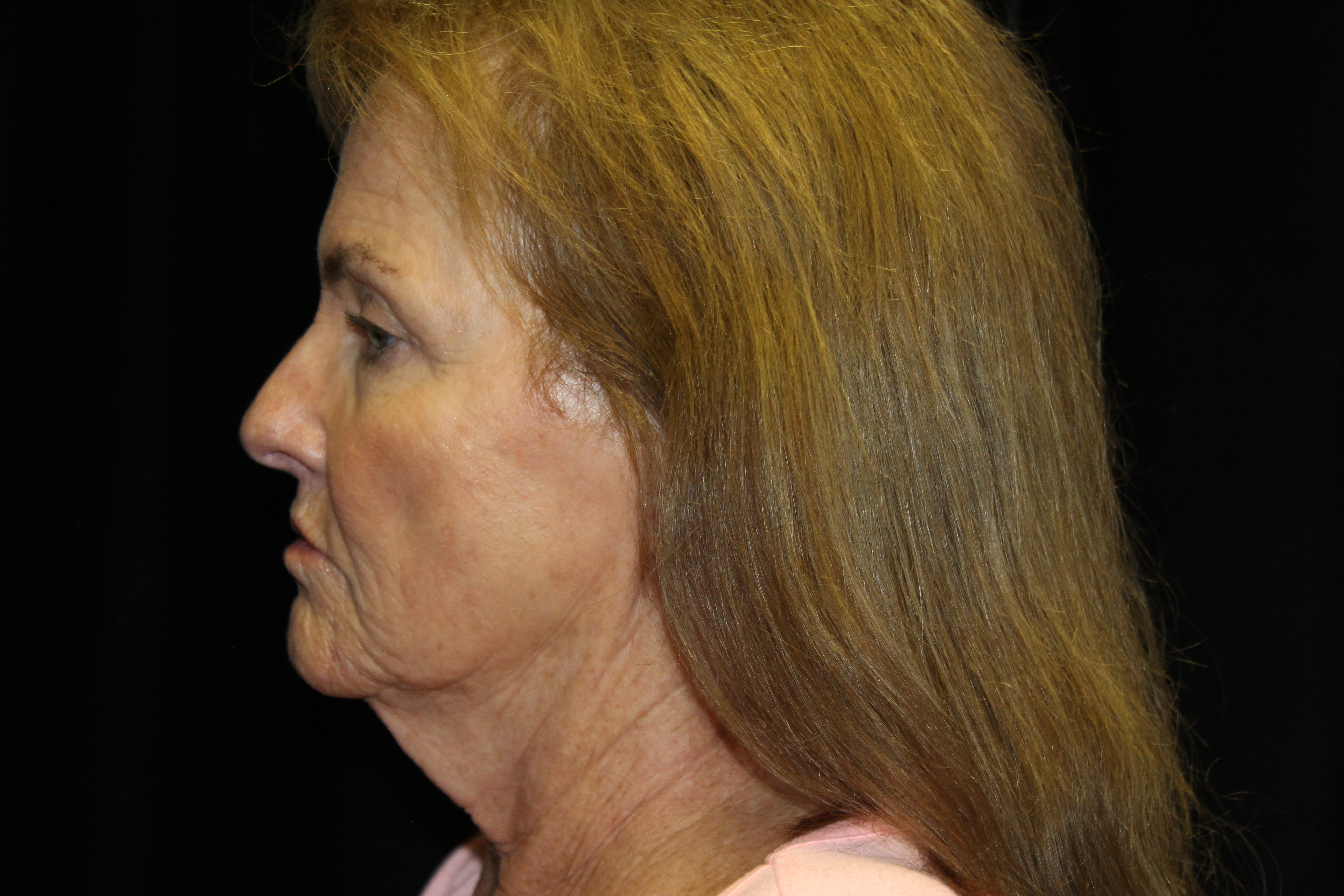 This is a lady that desired some facial and neck rejuvenation. When I examined her preoperatively, she had banding in the neck and loss of the mandibular border. She has some jowling and loss of fat between the chin and jowl. There is generalized looseness of her face and neck with low brows. She underwent face, neck, and brow rejuvenation. She now has a defined mandibular border and a more youthful appearance. This procedure is done in the office with IV sedation.