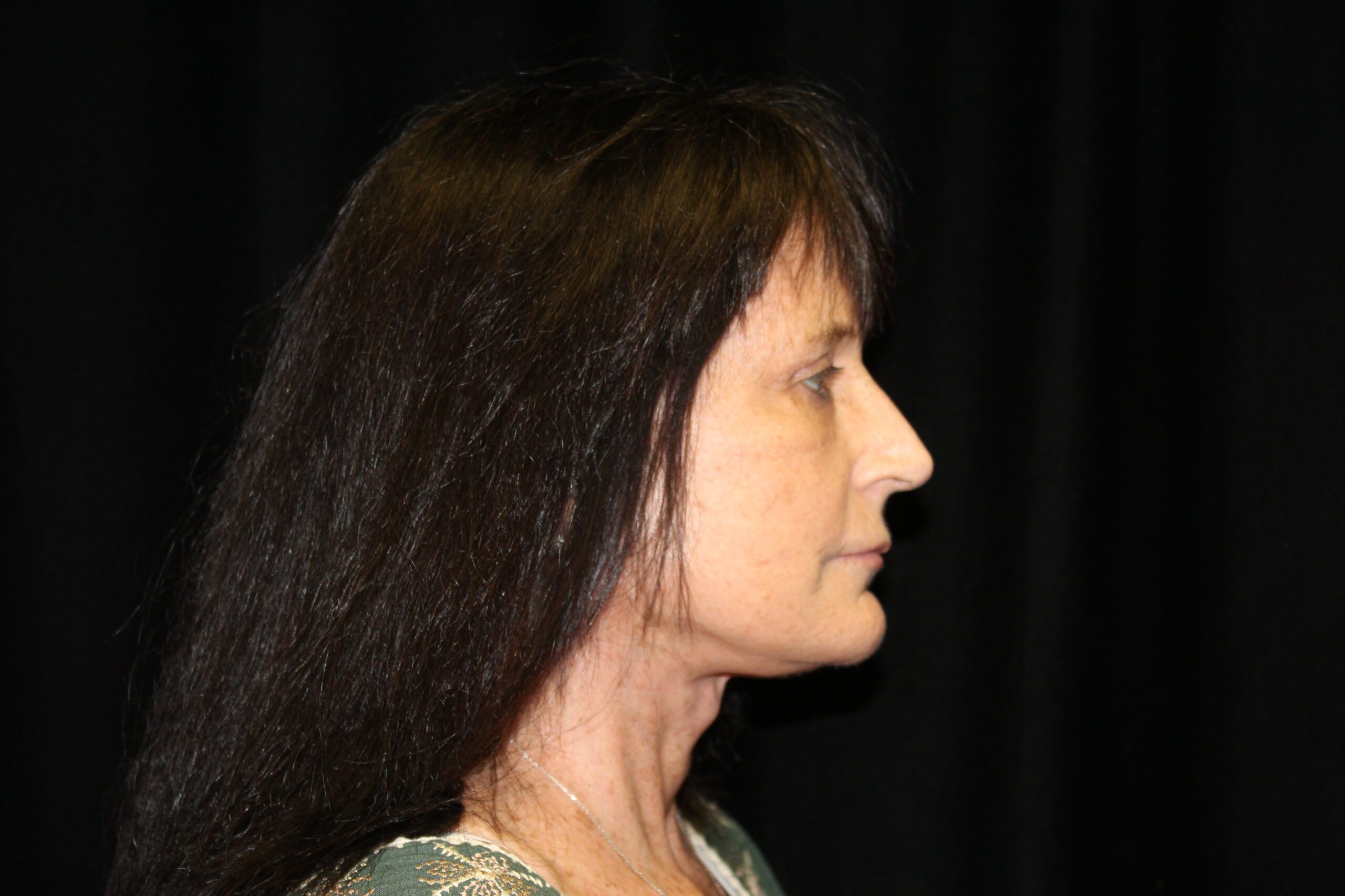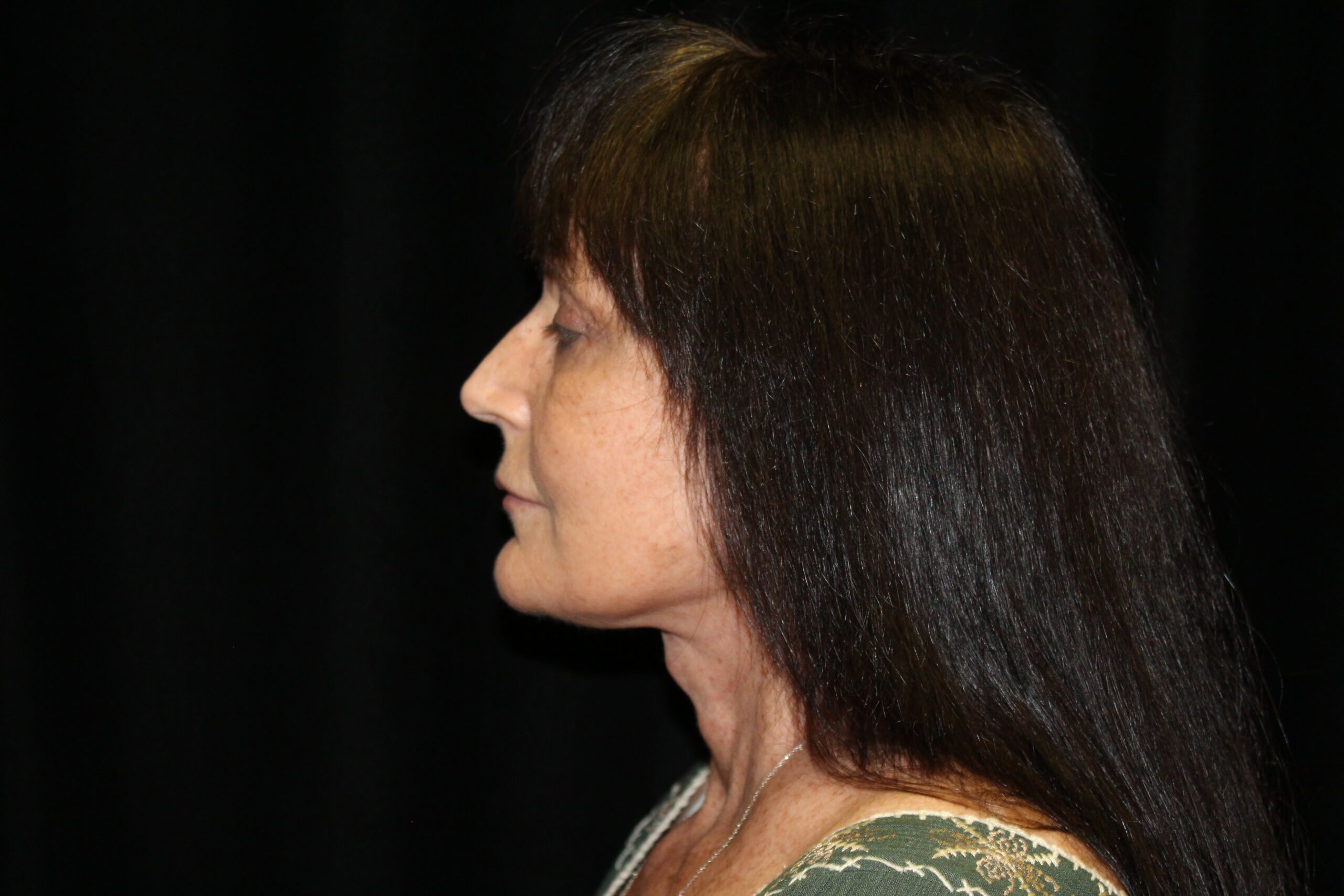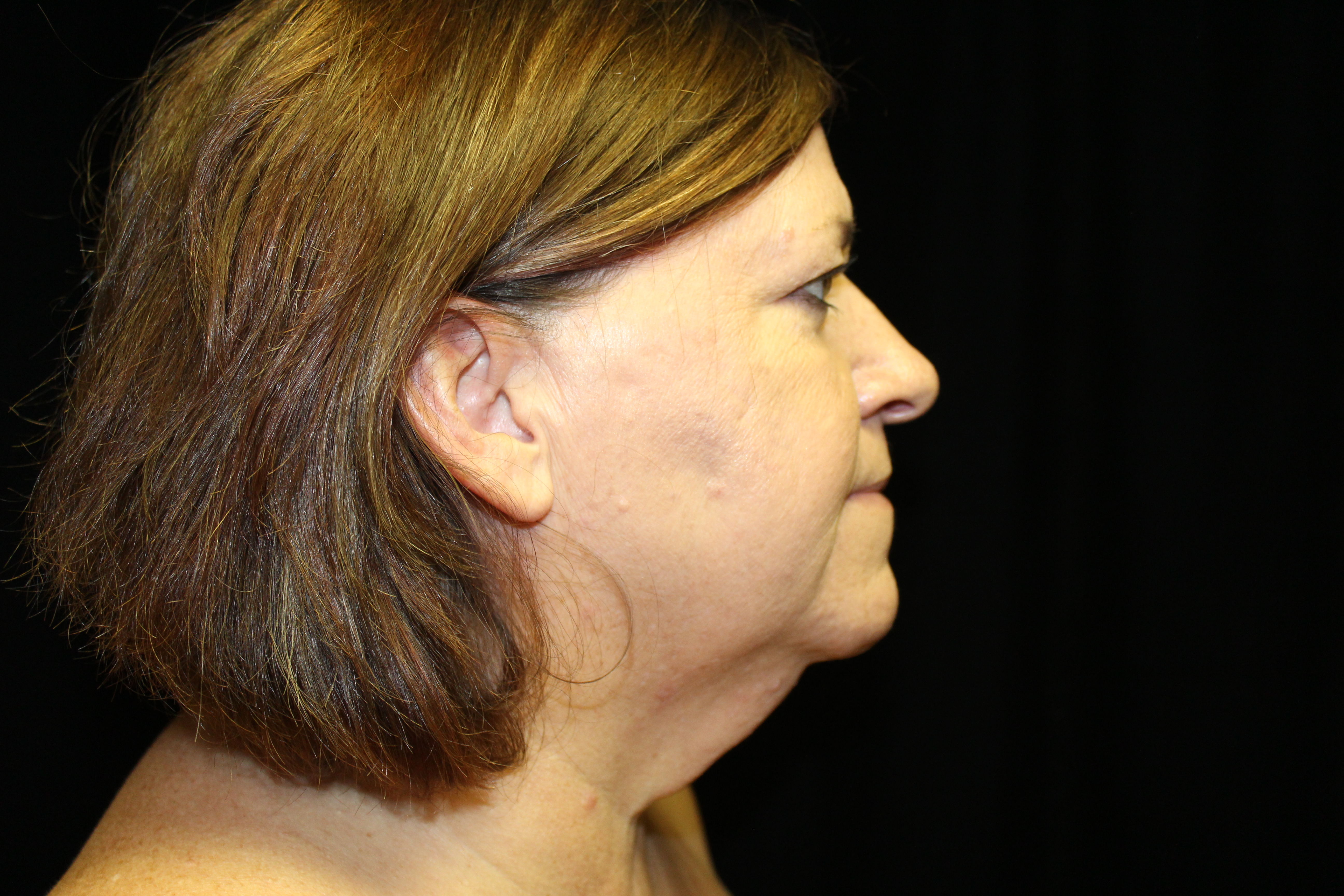 This is a 60 year old lady who has been self conscious of her excessive fat in her neck and loss of jaw line. She also has generalized looseness of the face and jaw area. She had some indentations where she had loss of fat in the lateral chin area. She underwent facial and neck rejuvenation in the office with IV sedation. The fat removed from the neck is permanently removed as long as there is no fluctuance in weight gain.