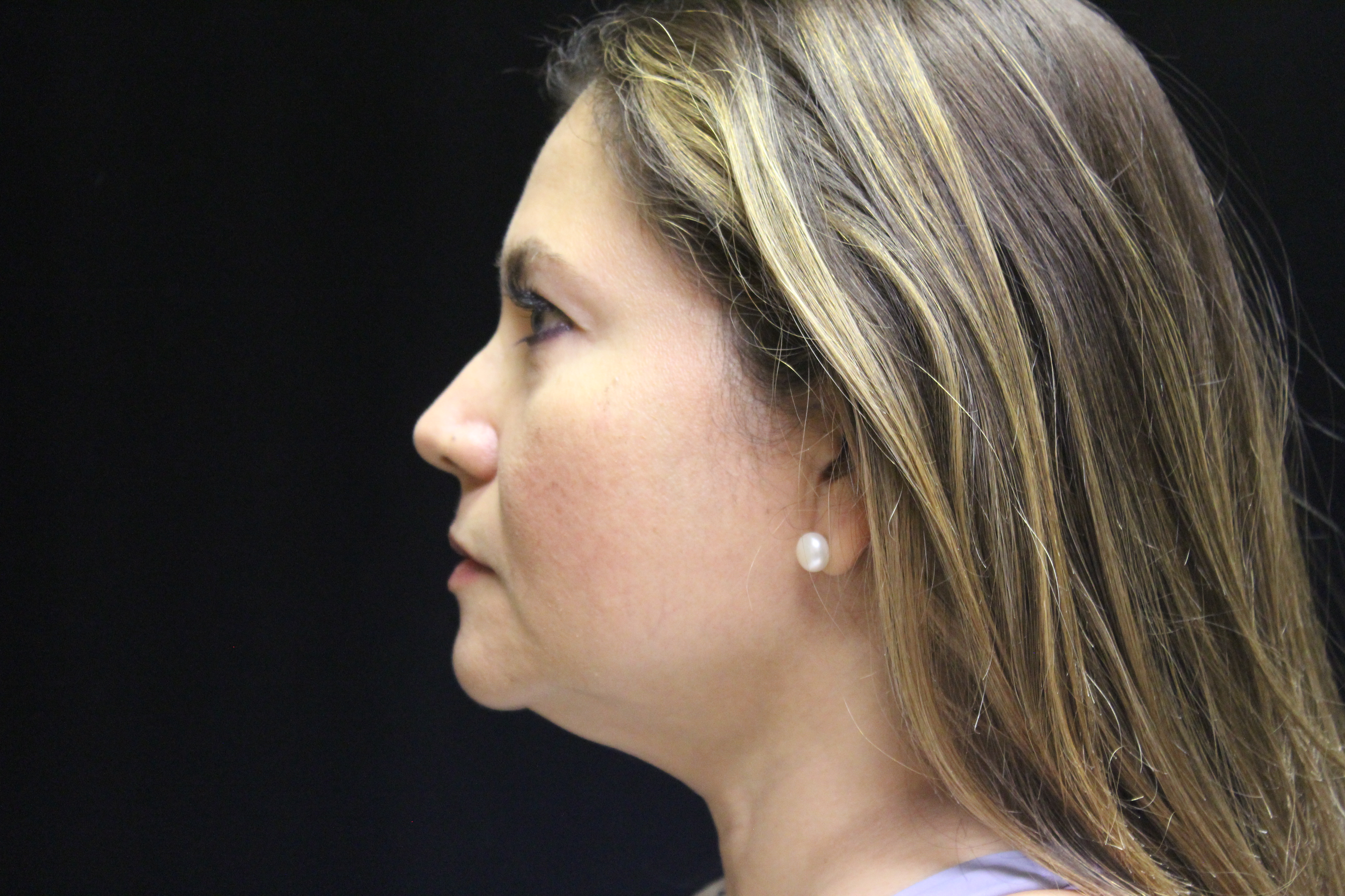 This is a 41 year old lady that was concerned with the fullness that she had in her neck. Also, she had lost her jaw line. Preoperatively you can see she has no distinct margin between the face and her neck. Also, there is a lot of excessive fat in the neck. The neck has a very obtuse angle. It is straight down from her clavicle going to her chin. Postoperatively you can see that she now has the definition of the jaw line. She has a nice acute angle to the neck. This procedure is done in the office with IV sedation.
