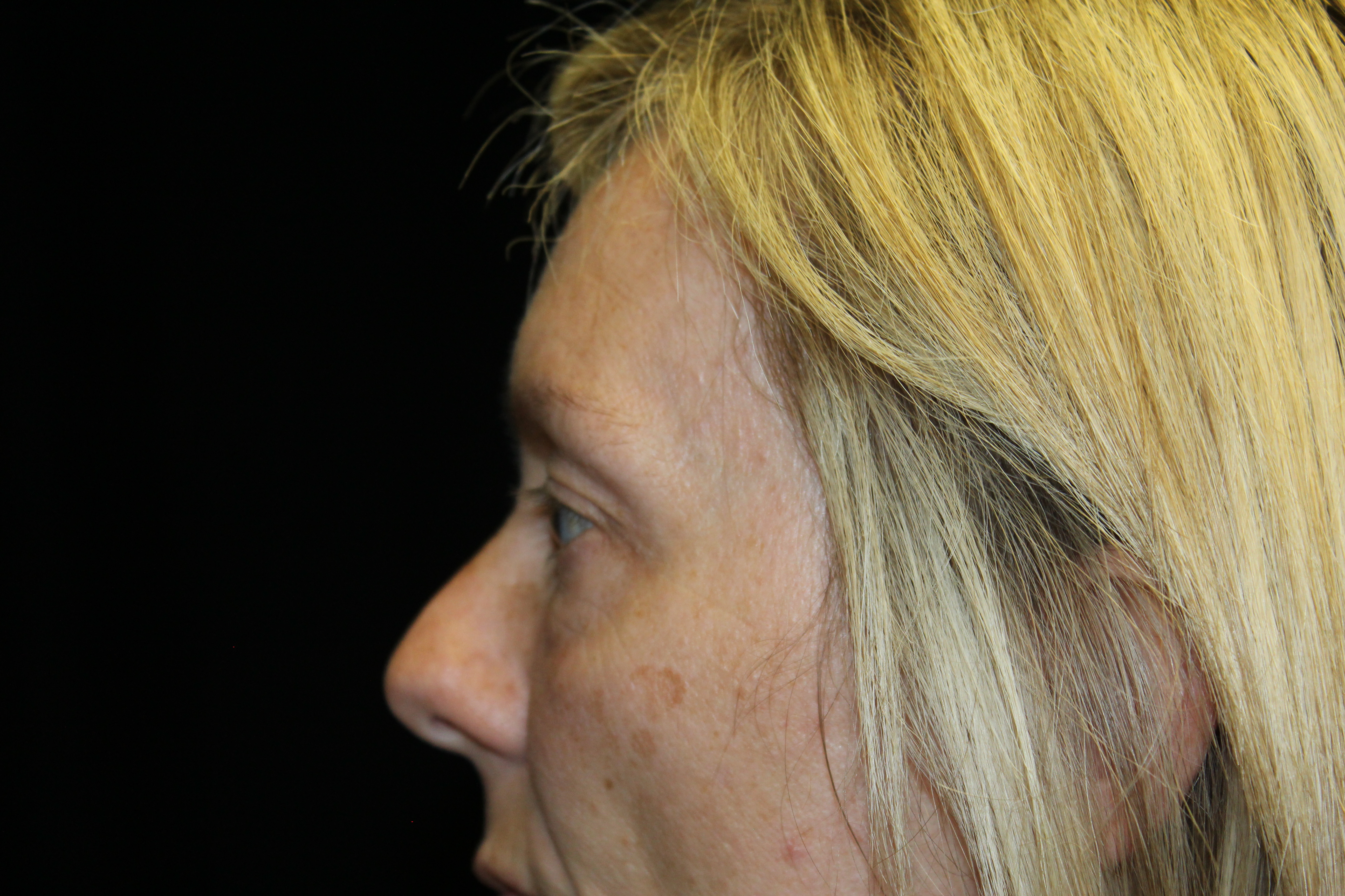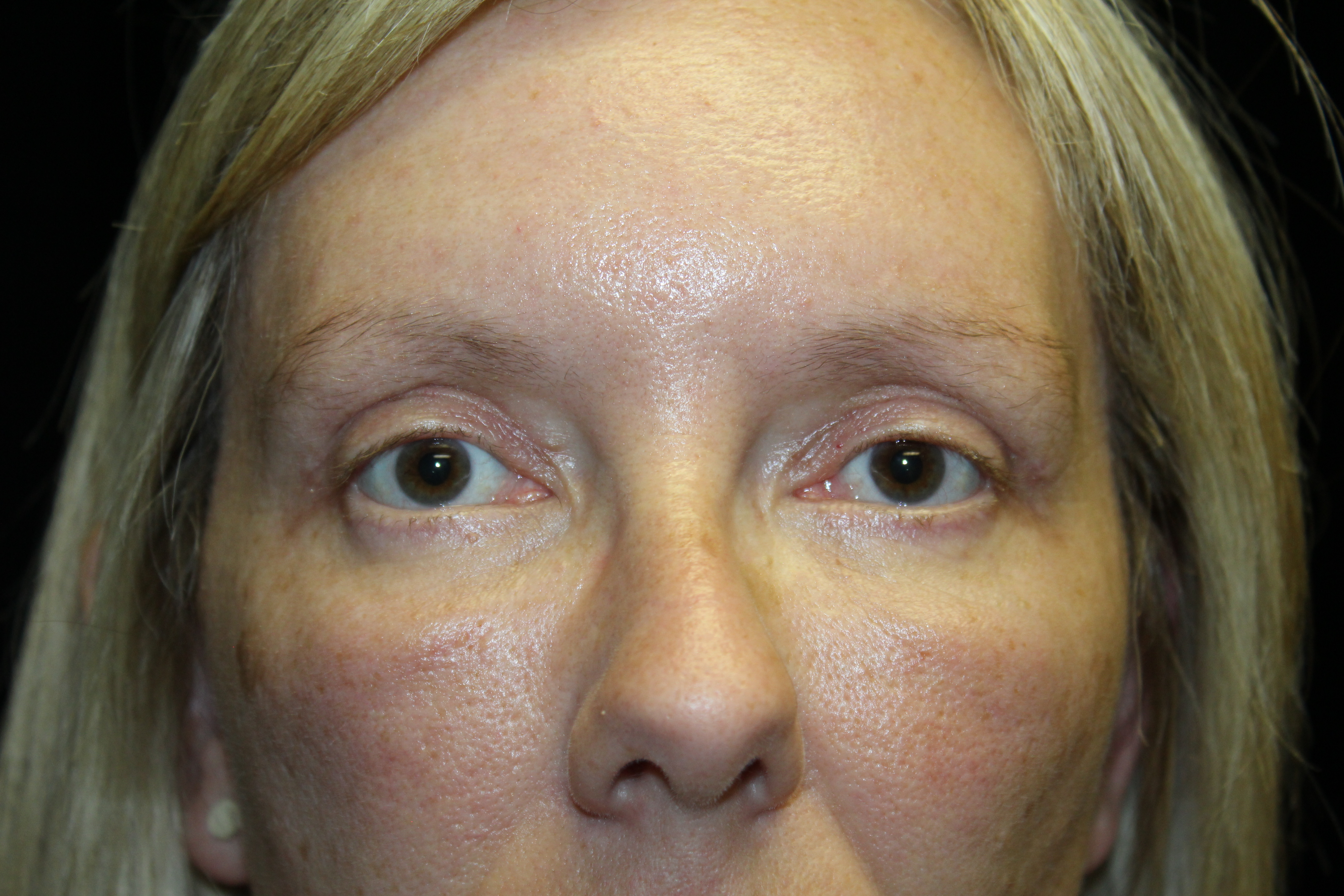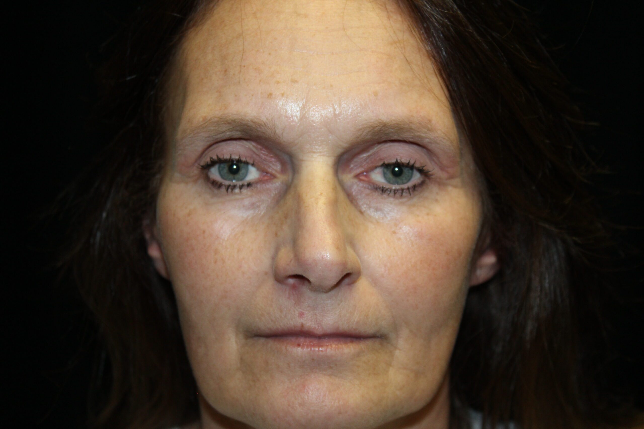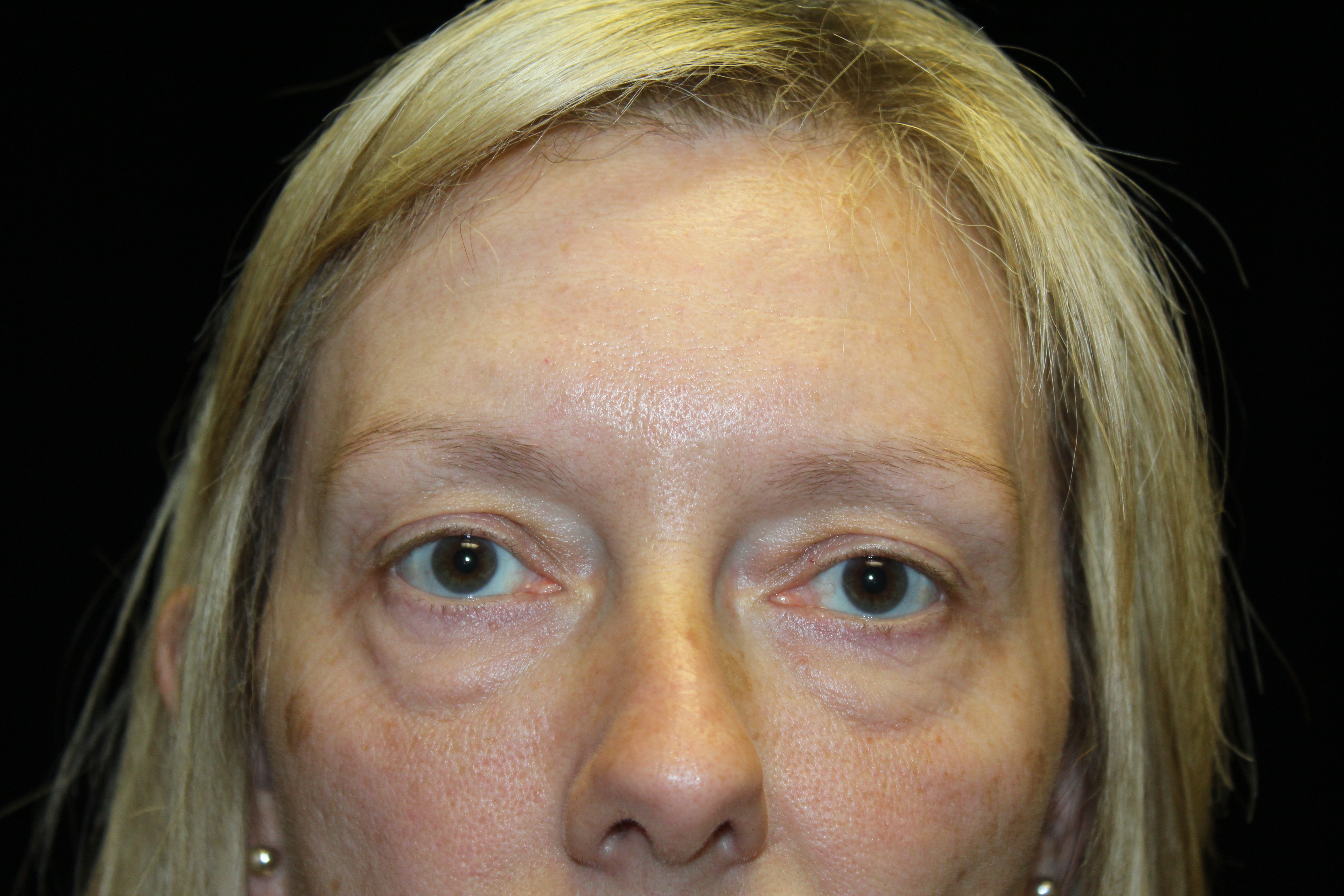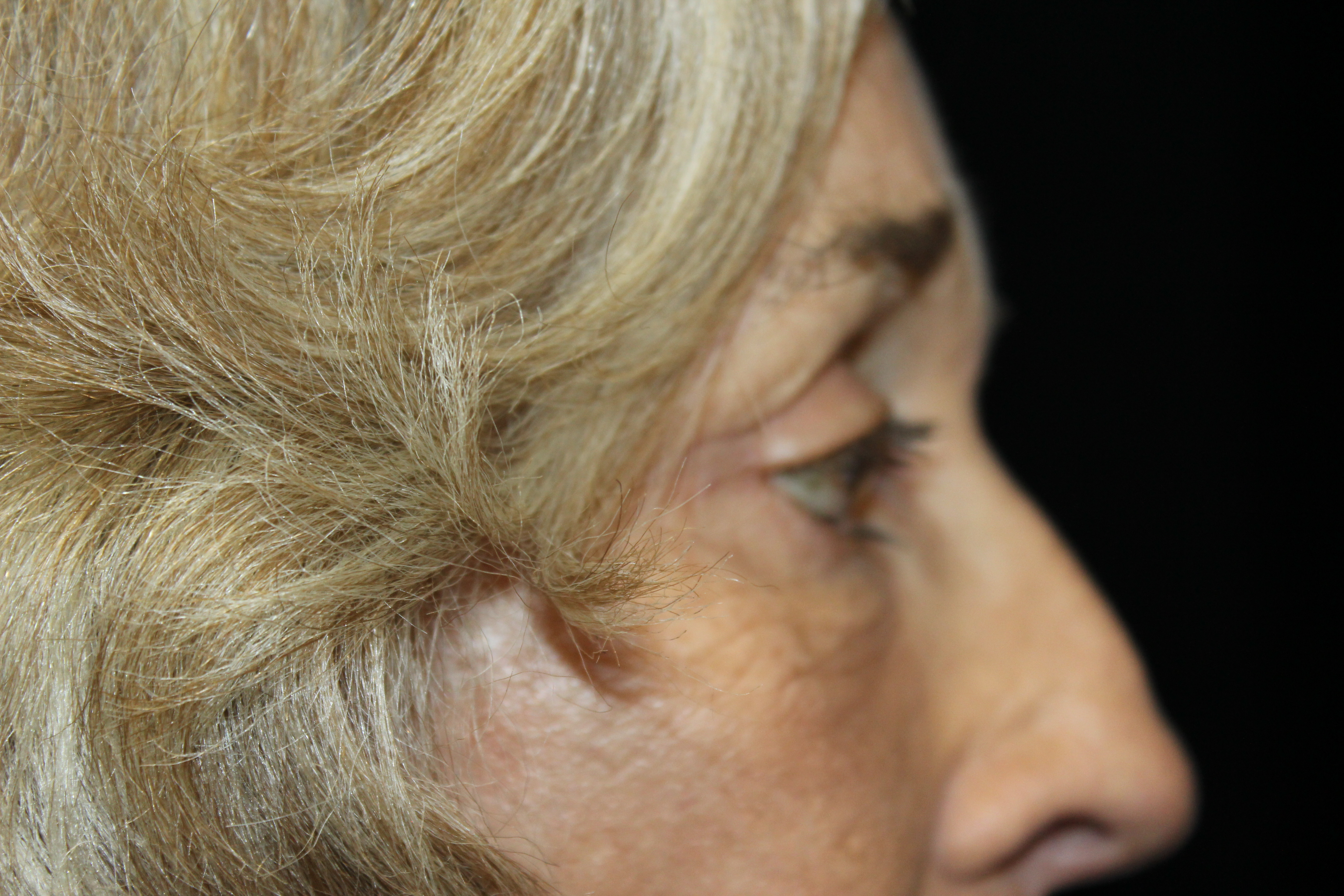 This is a 50 year old lady that had some excessive hooding in her upper lids. Also, she had puffiness in the lower lids. As you can tell, she has darkness in the lower lids as well. The darkness in the lower lids is caused by some hollowness due to the excessive fat in the lower lids forming a trough. Also there is some excessive pigment in the lower lids. She underwent an upper and lower blepharoplasty followed by a chemical peel on the lower lids. The chemical peel helps fine wrinkling and bleaches out the darkness. All in all, she has gotten a nice result.