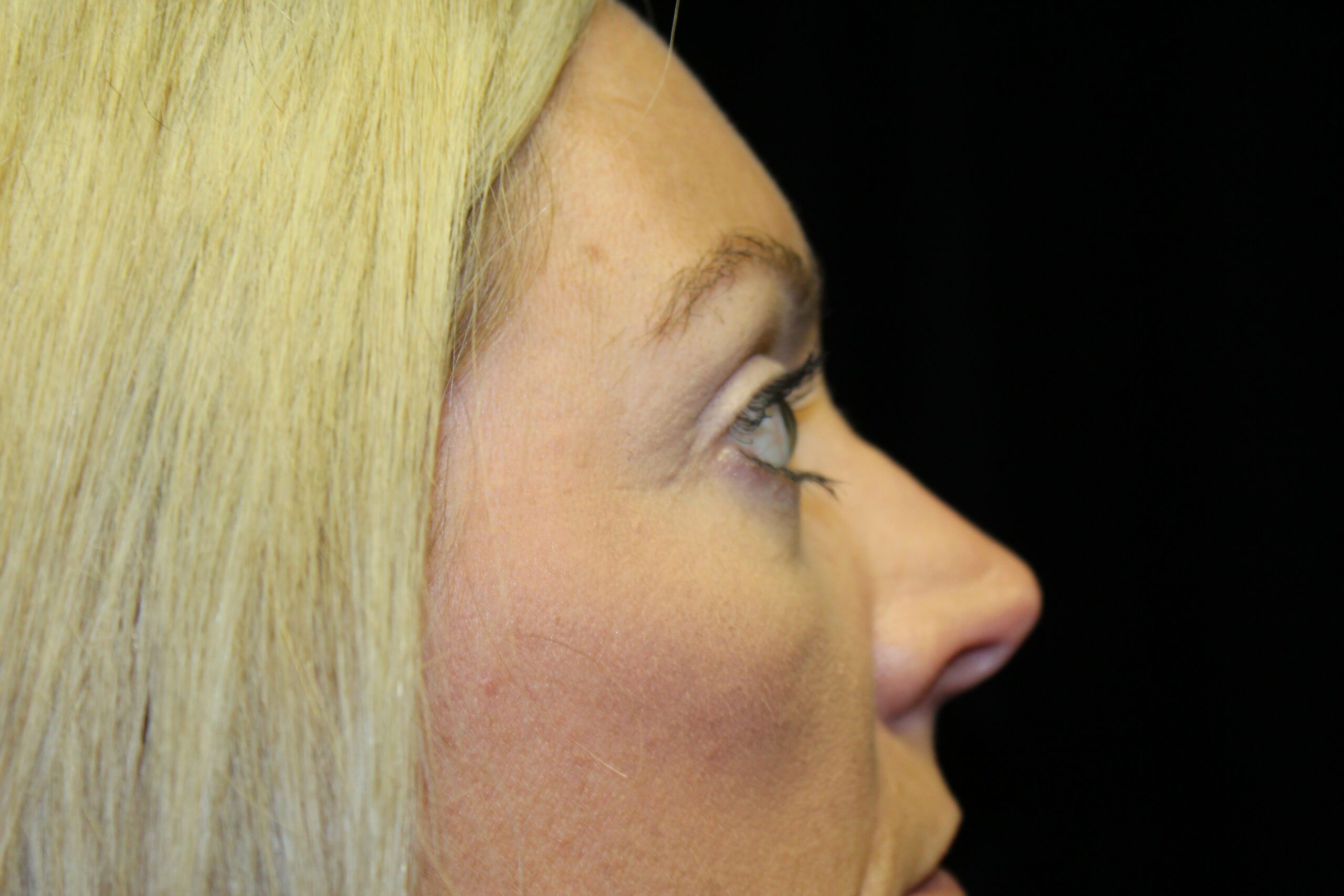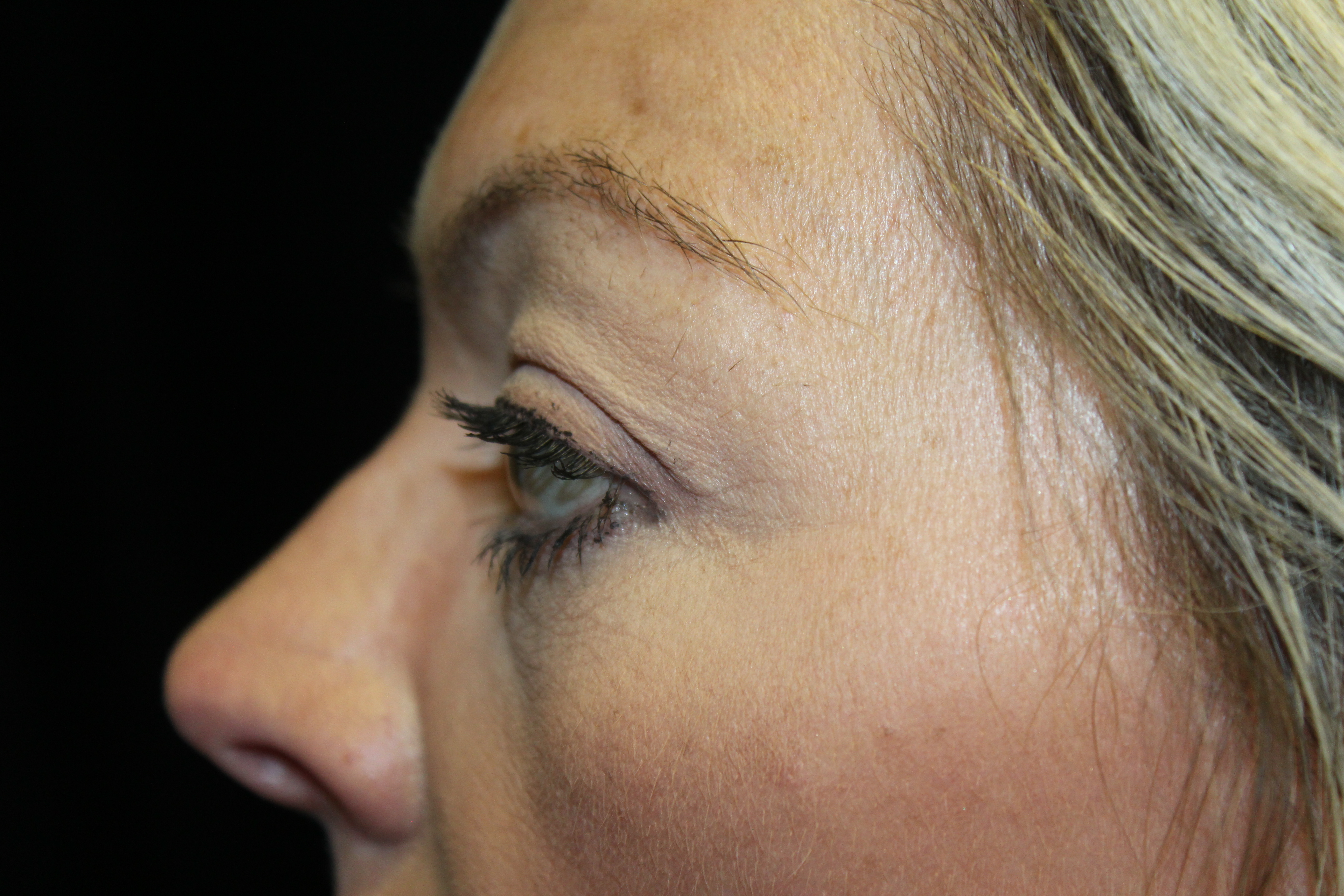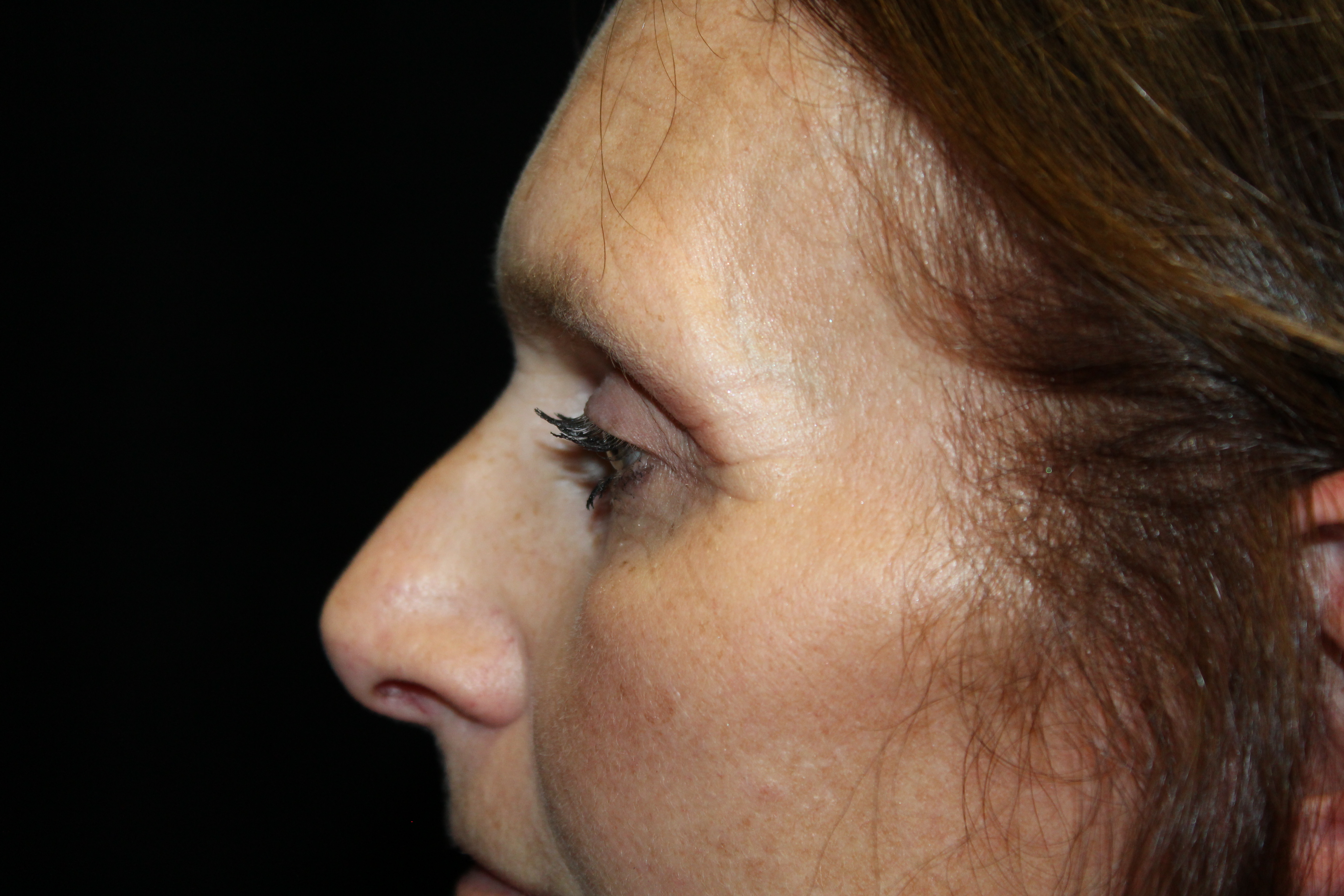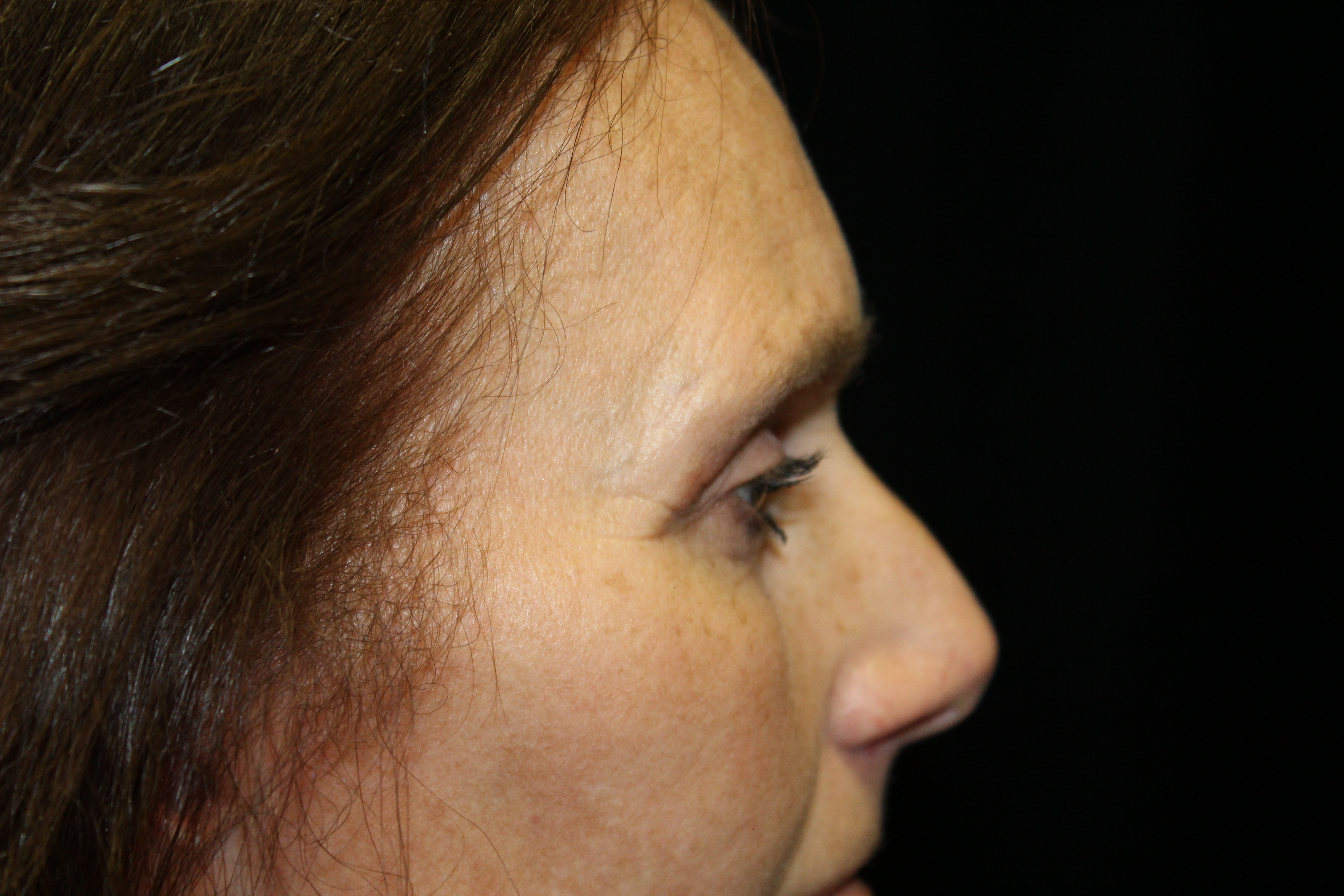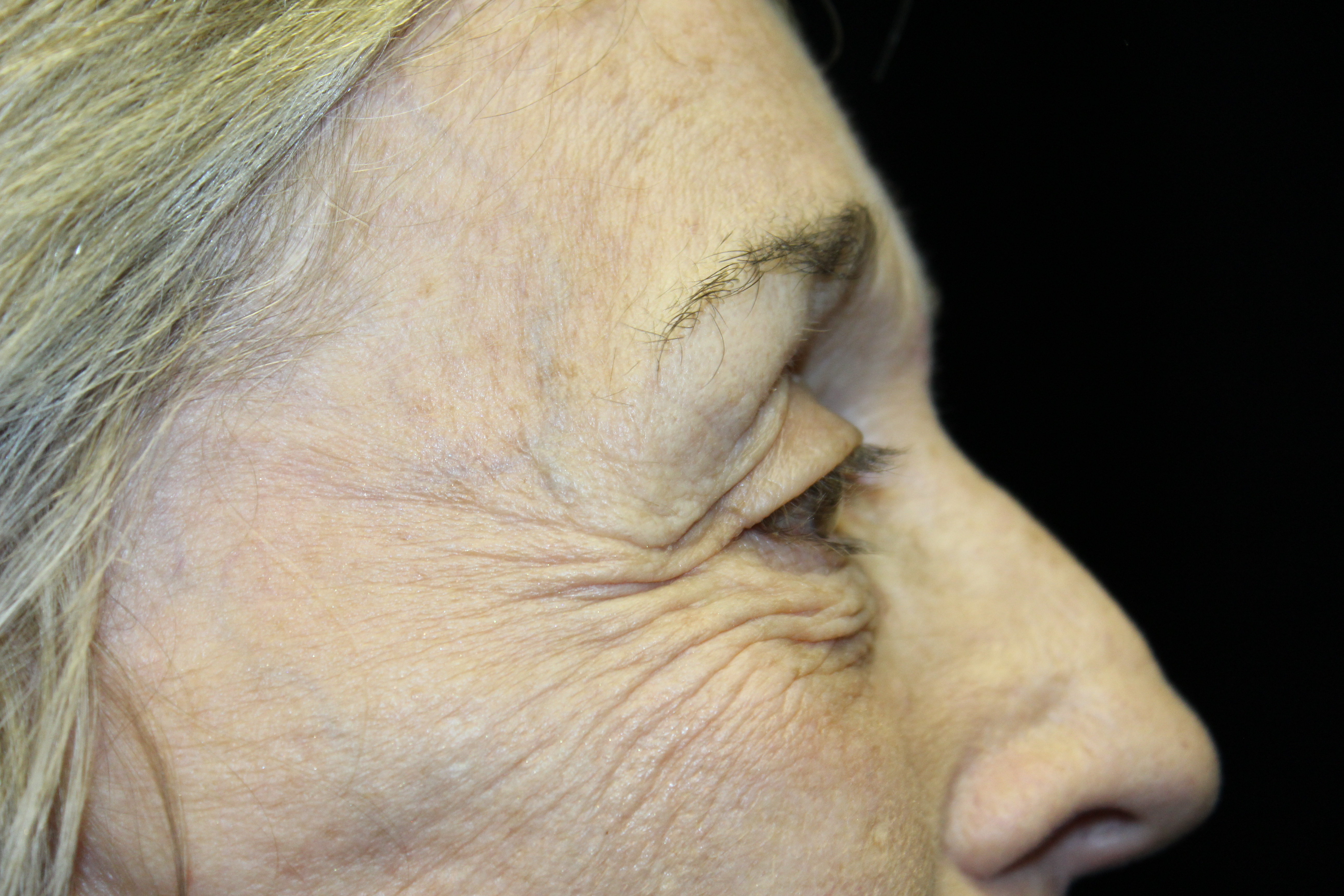 This is a 50 year old lady that had some excessive hooding in her upper lids. Also, she had puffiness in the lower lids. As you can tell, she has darkness in the lower lids as well. The darkness in the lower lids is caused by some hollowness due to the excessive fat in the lower lids forming a trough. Also there is some excessive pigment in the lower lids. She underwent an upper and lower blepharoplasty followed by a chemical peel on the lower lids. The chemical peel helps fine wrinkling and bleaches out the darkness. All in all, she has gotten a nice result.
