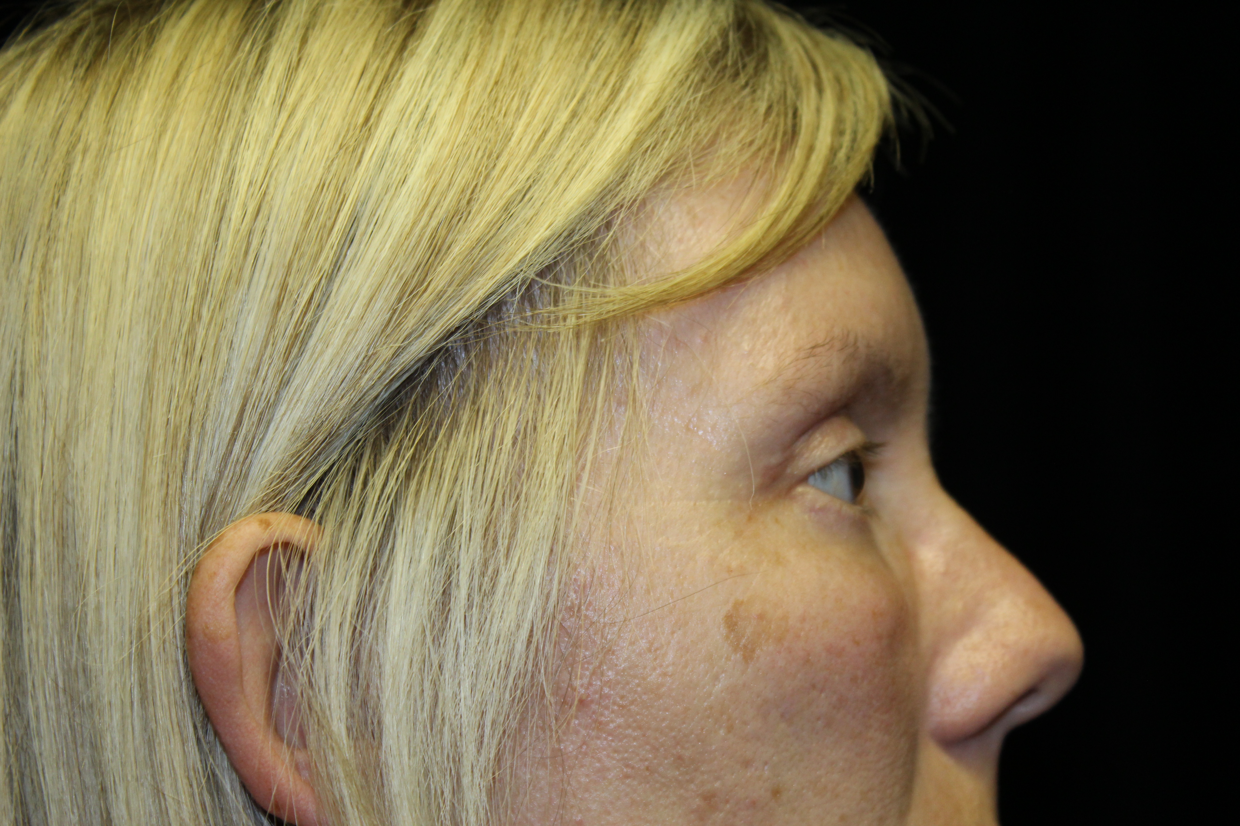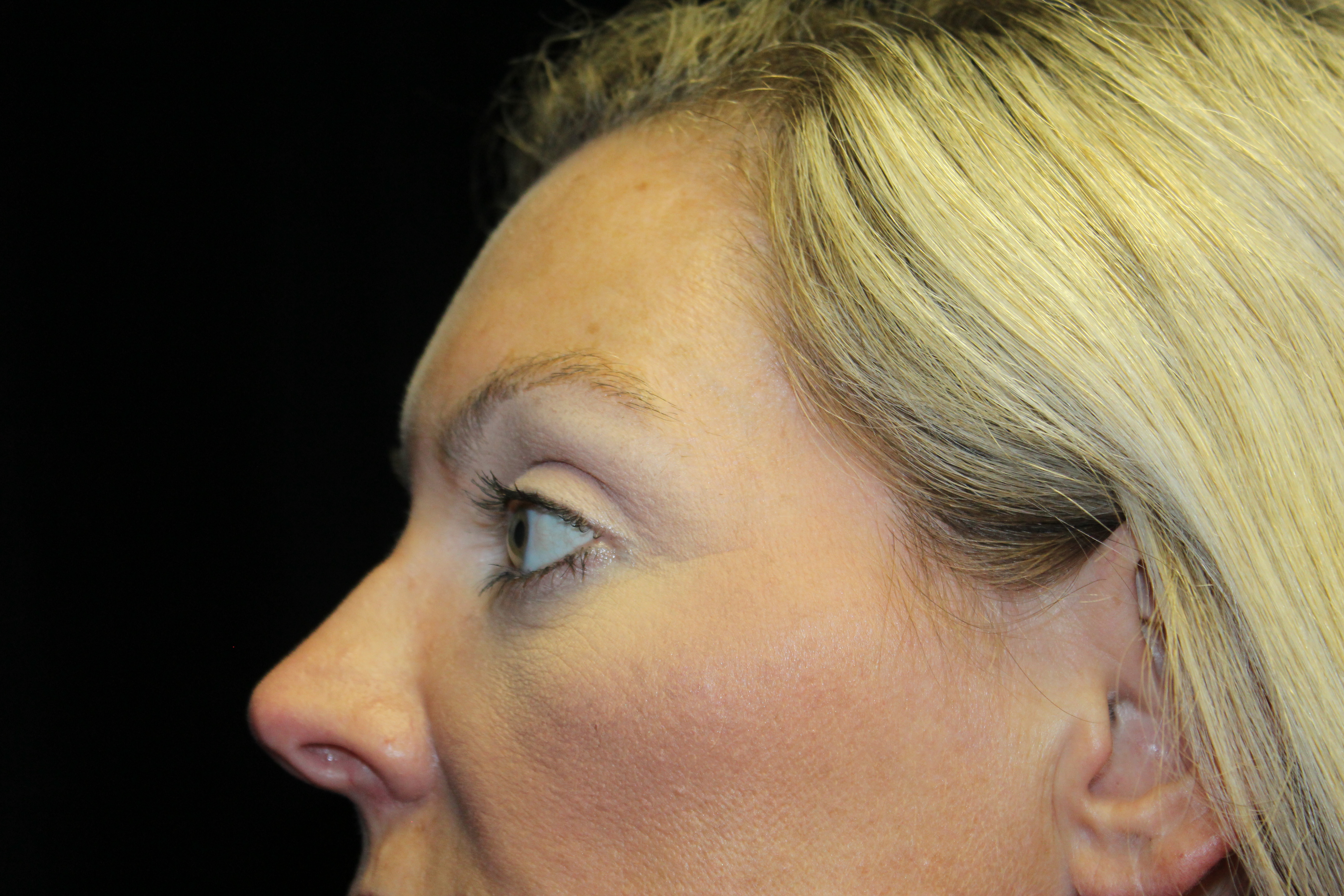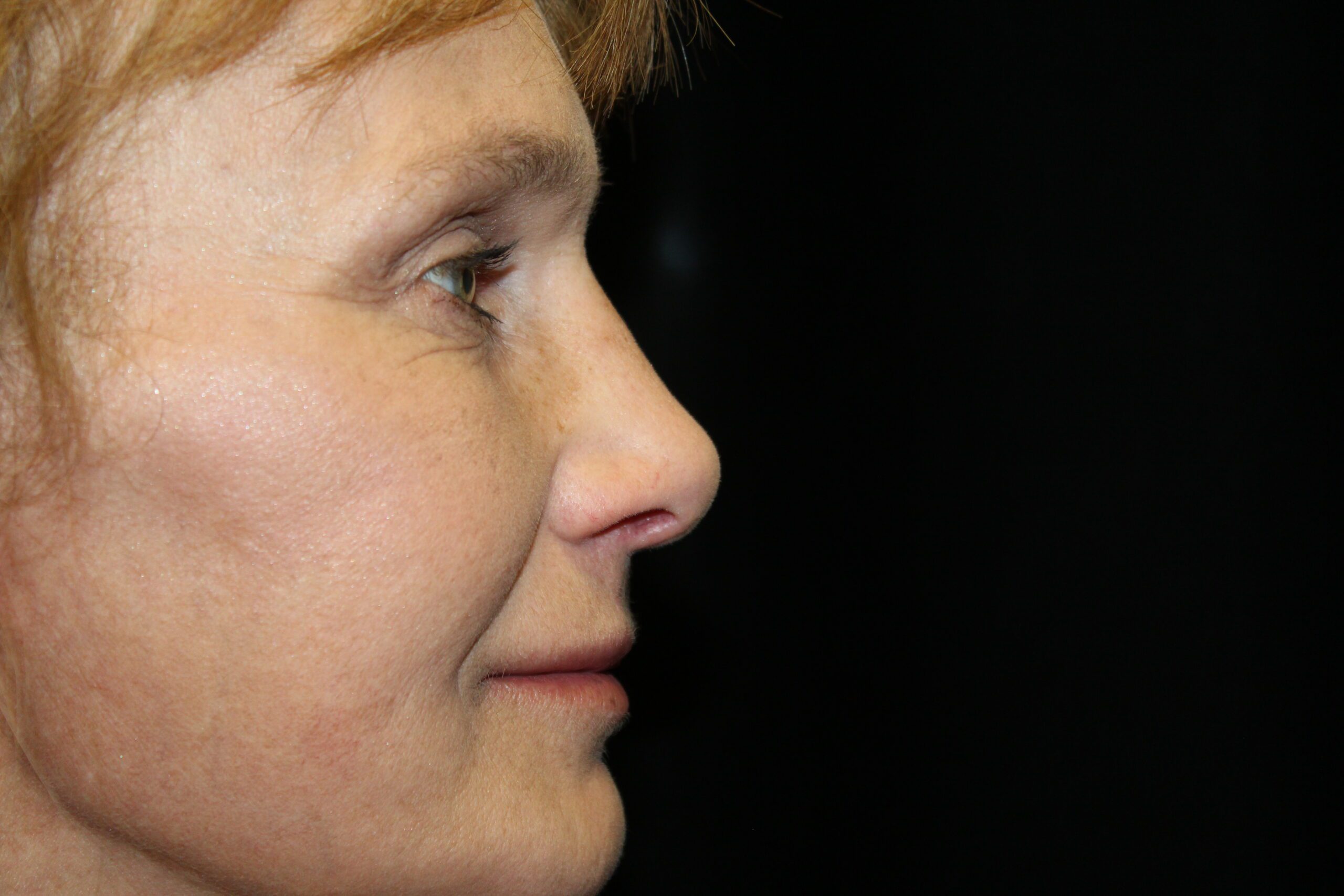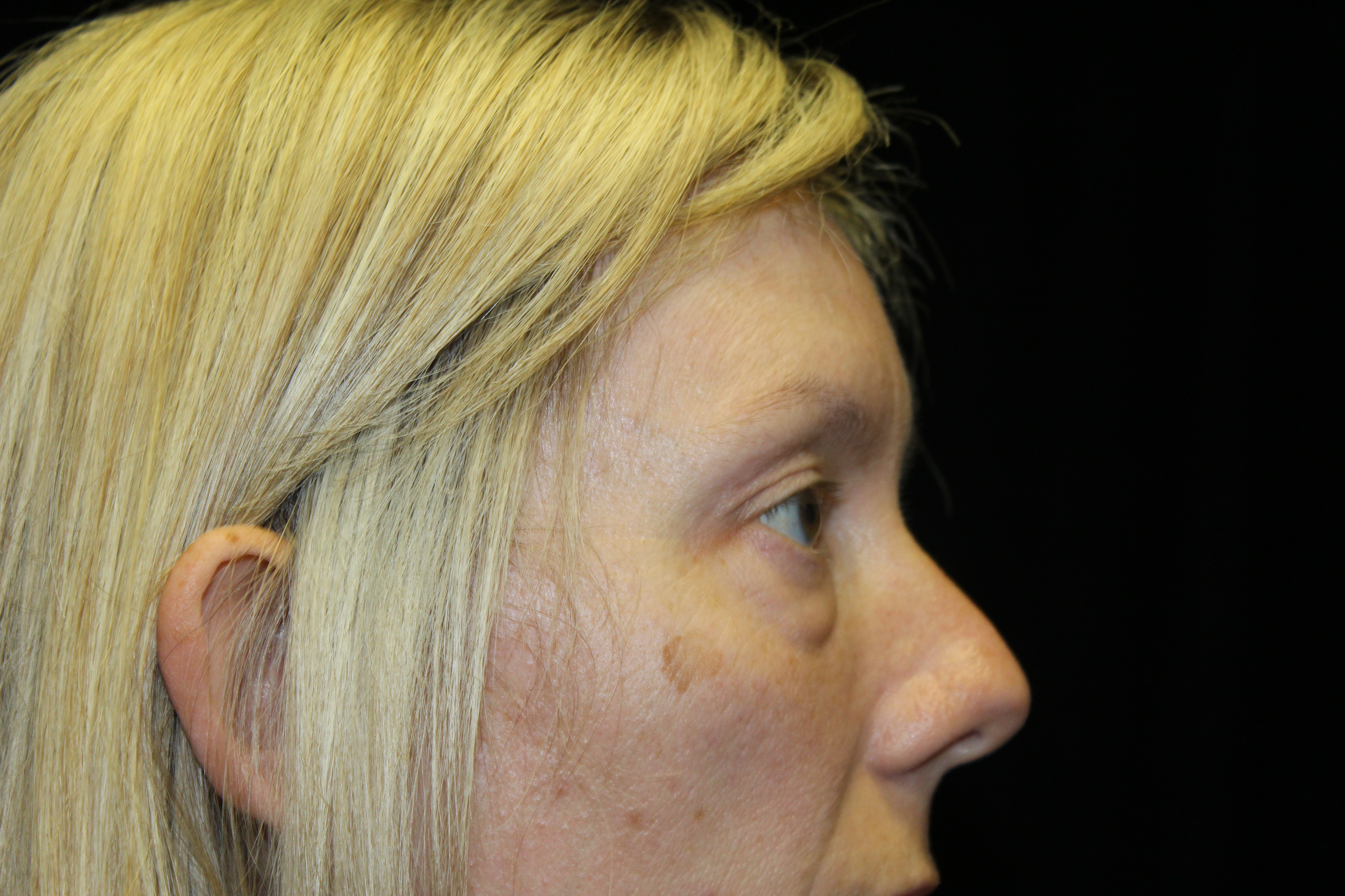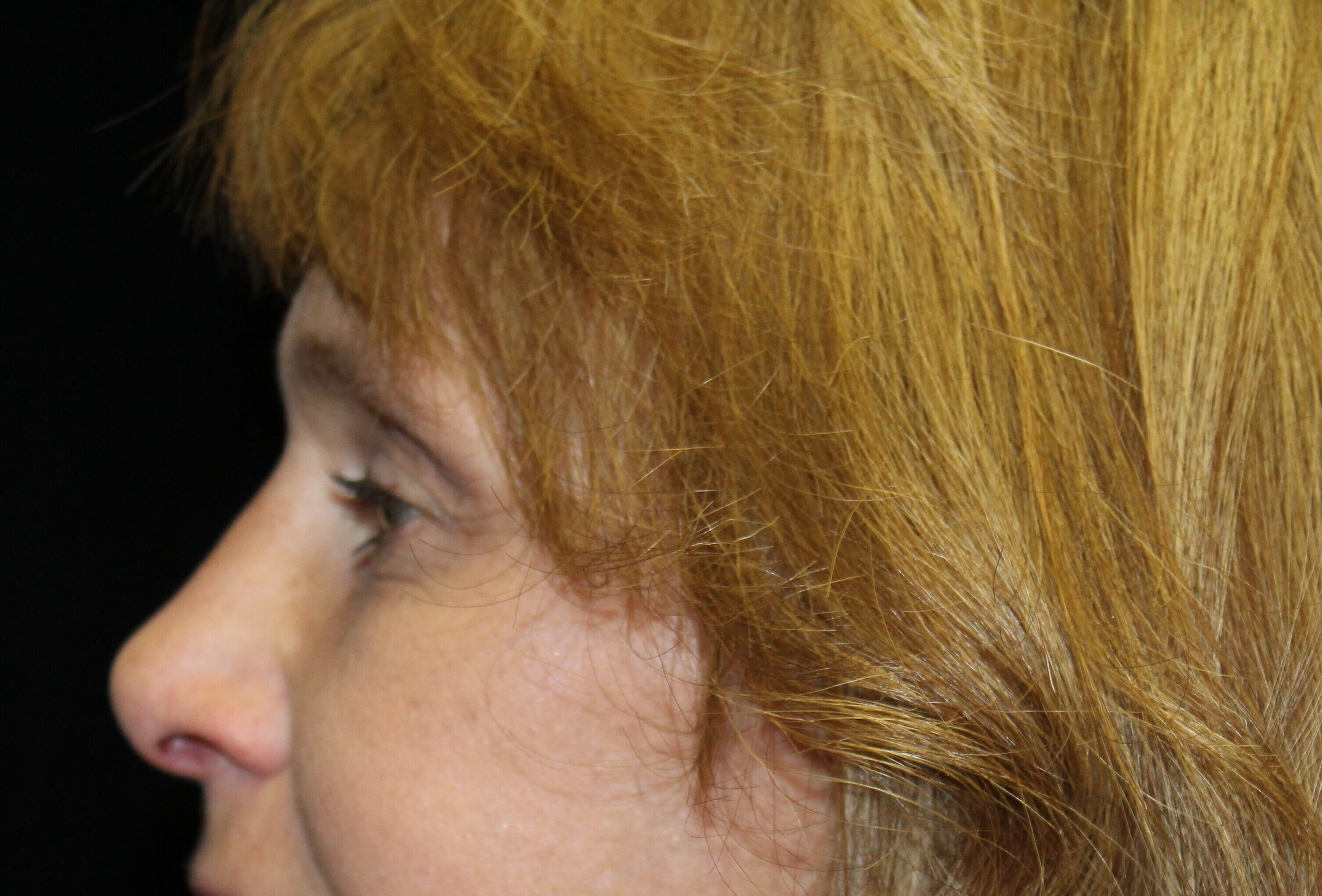 This is a 50 year old lady that had some excessive hooding in her upper lids. Also, she had puffiness in the lower lids. As you can tell, she has darkness in the lower lids as well. The darkness in the lower lids is caused by some hollowness due to the excessive fat in the lower lids forming a trough. Also there is some excessive pigment in the lower lids. She underwent an upper and lower blepharoplasty followed by a chemical peel on the lower lids. The chemical peel helps fine wrinkling and bleaches out the darkness. All in all, she has gotten a nice result.