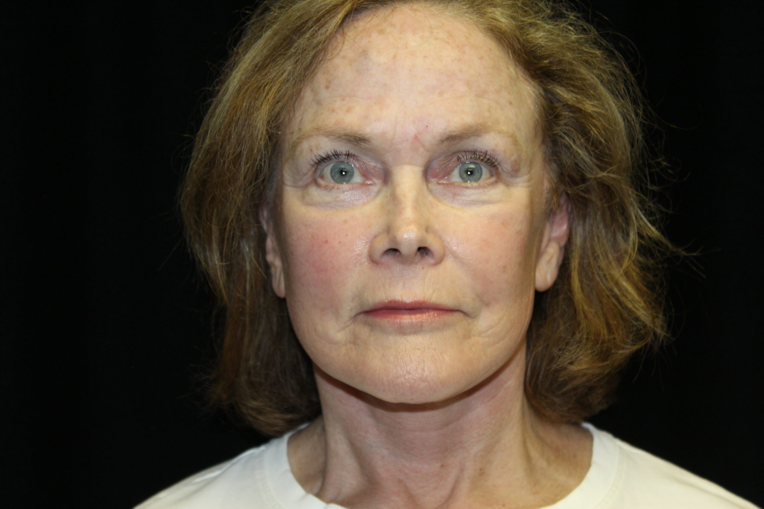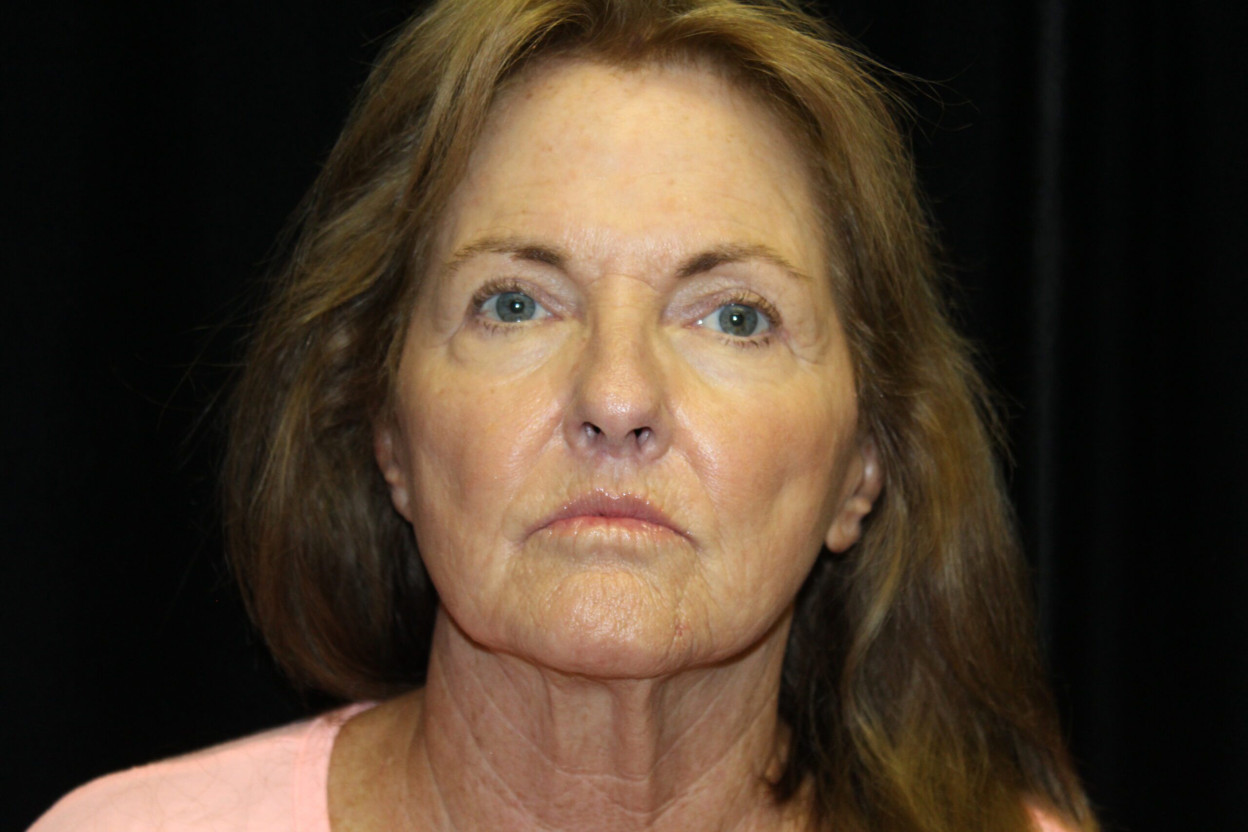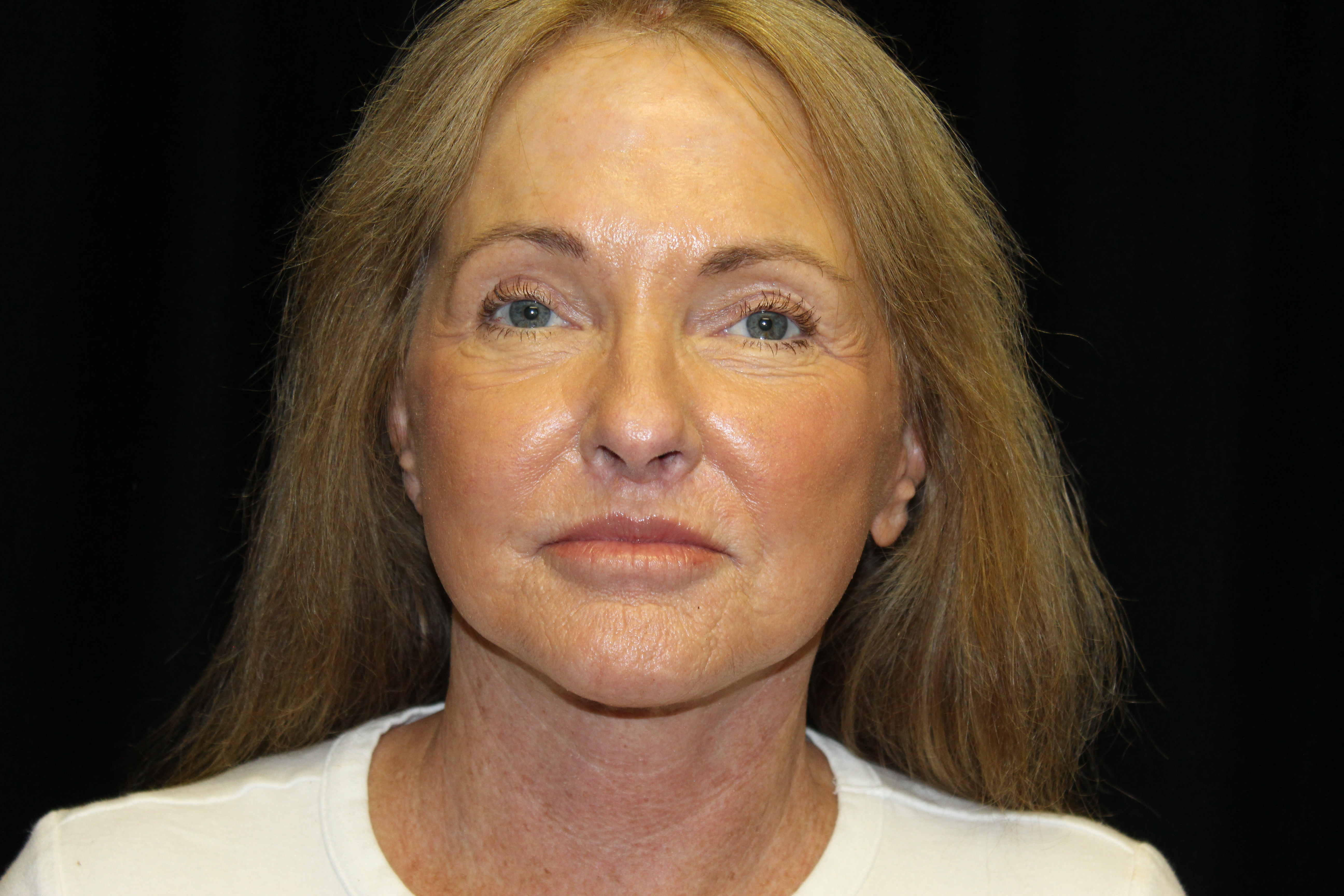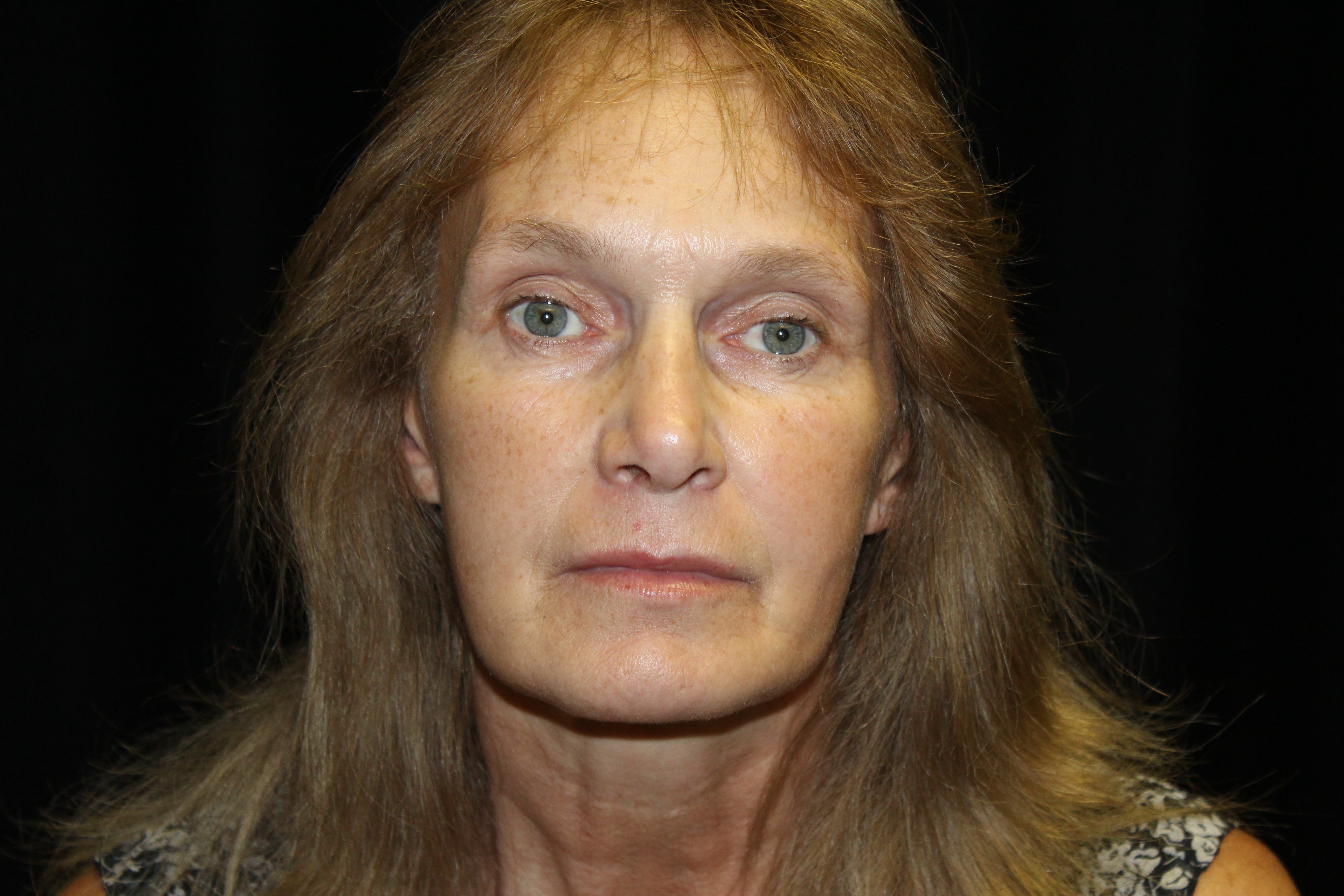 This is a 63 year old lady that is getting generalized looseness of skin and tissue in her face and brow as well as excessive fat in her neck. She has lost her jaw line and volume in the lips and the area around her eyes and mouth. She underwent facial rejuvenation with fat grafting. She now has a much more refreshed look. We have defined her mandibular border and filled fat in the areas around her mouth and eyes. This procedure is done in the office with IV sedation.