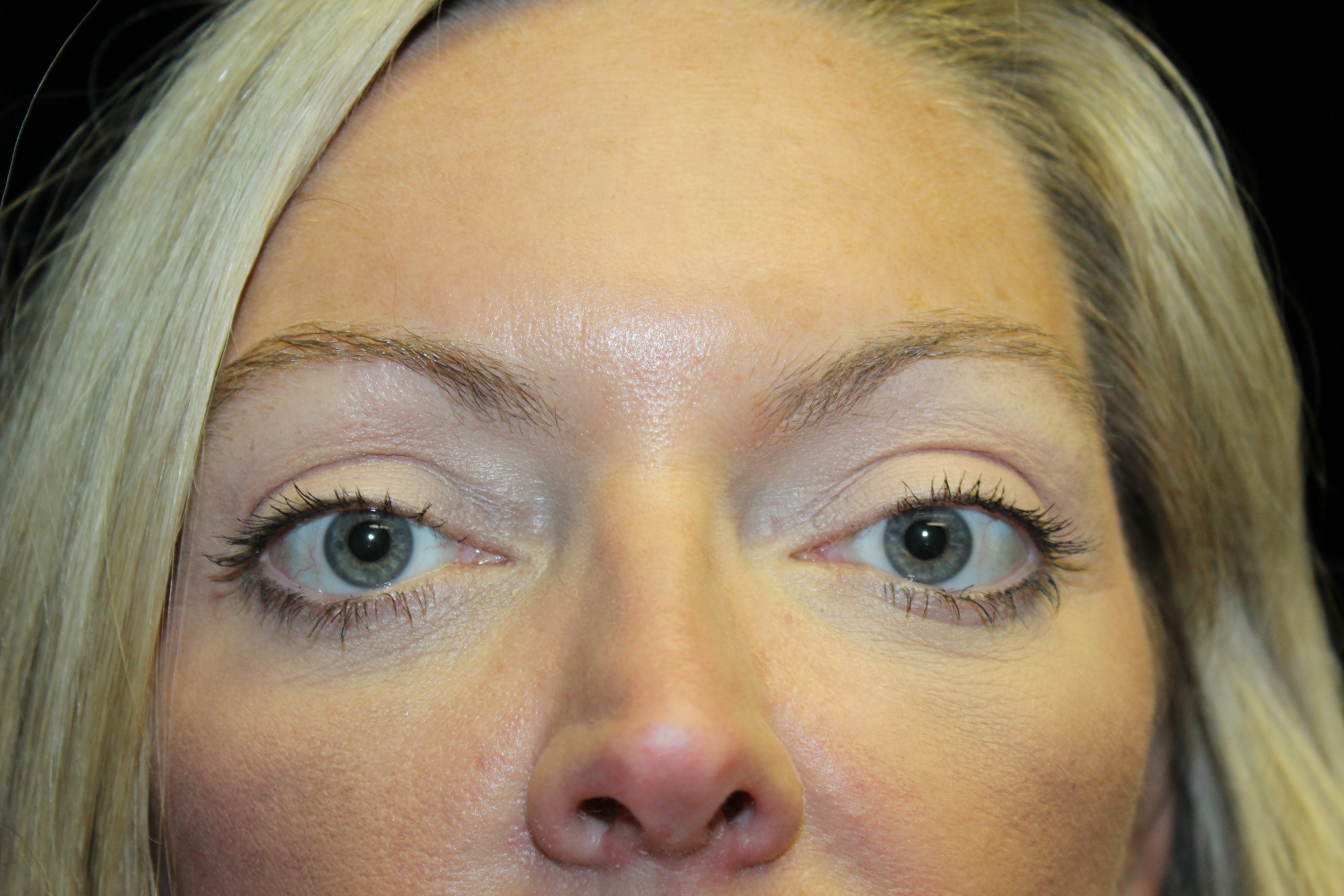 This is a lady who had a lot of asymmetry of the eyes. She had some fat medially on each eye but did not have any centrally. Her eyes were somewhat hollow. On the right eye, she hooded all the way over to the lateral portion of the orbital rim. On the left side, she hooded all the way over about 1cm or more lateral to the lateral canthus. As you can see she has a nice result post operatively and is pleased with her results.