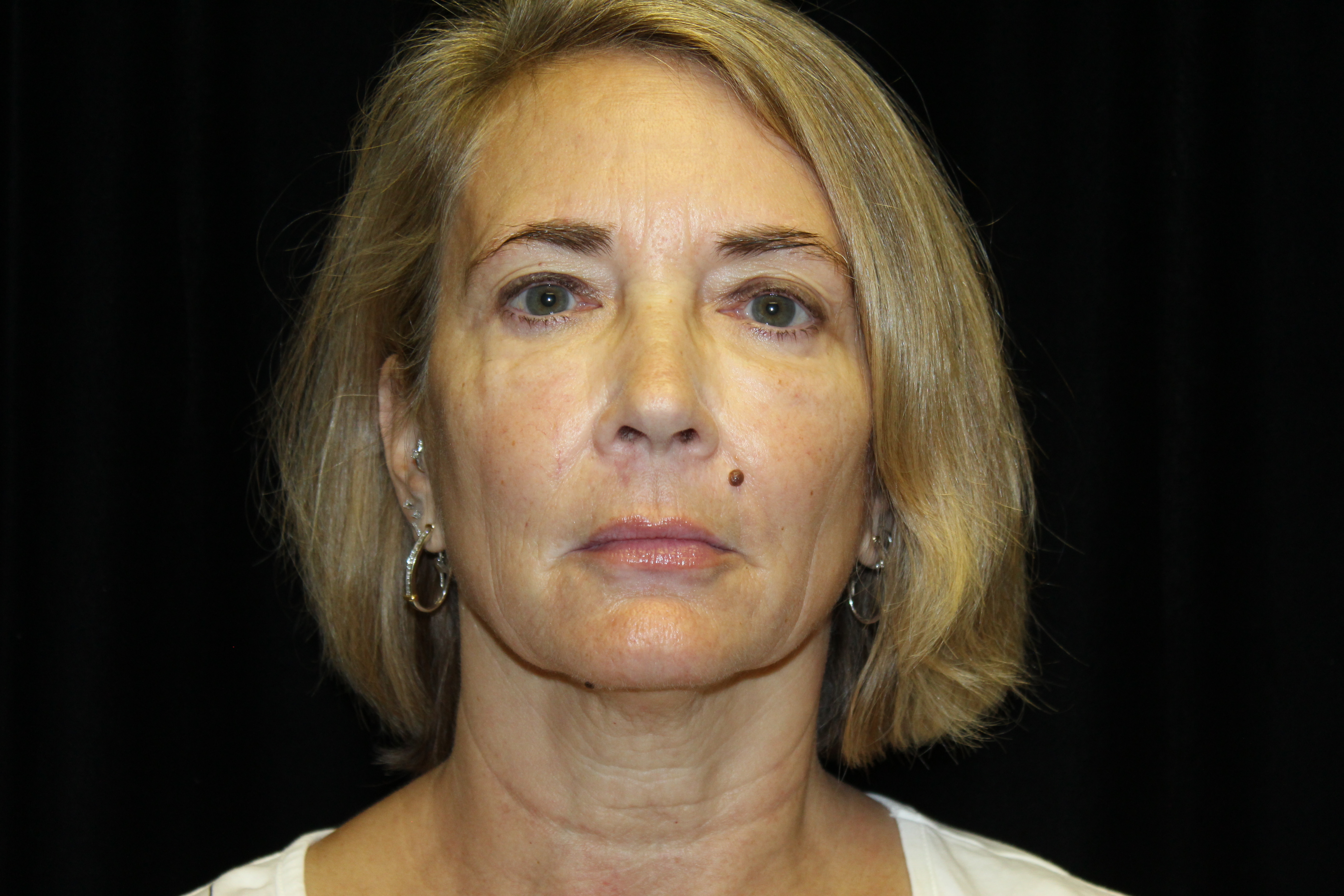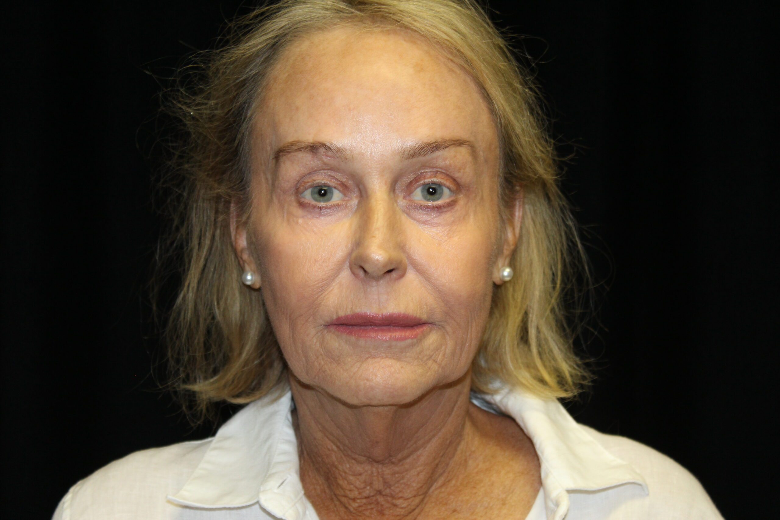 This is a 63 year old lady that is getting generalized looseness of skin and tissue in her face and brow as well as excessive fat in her neck. She has lost her jaw line and volume in the lips and the area around her eyes and mouth. She underwent facial rejuvenation with fat grafting. She now has a much more refreshed look. We have defined her mandibular border and filled fat in the areas around her mouth and eyes. This procedure is done in the office with IV sedation.
