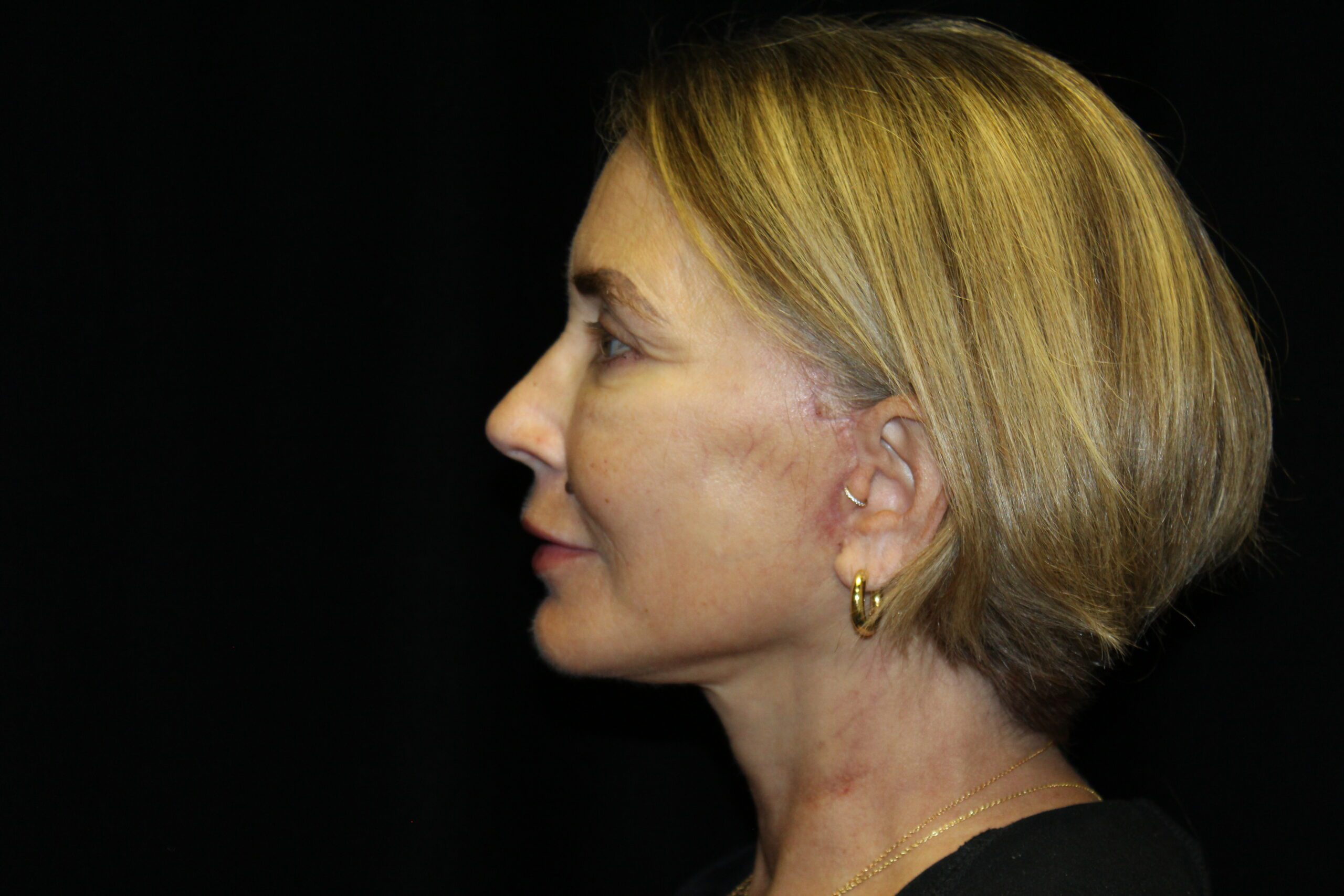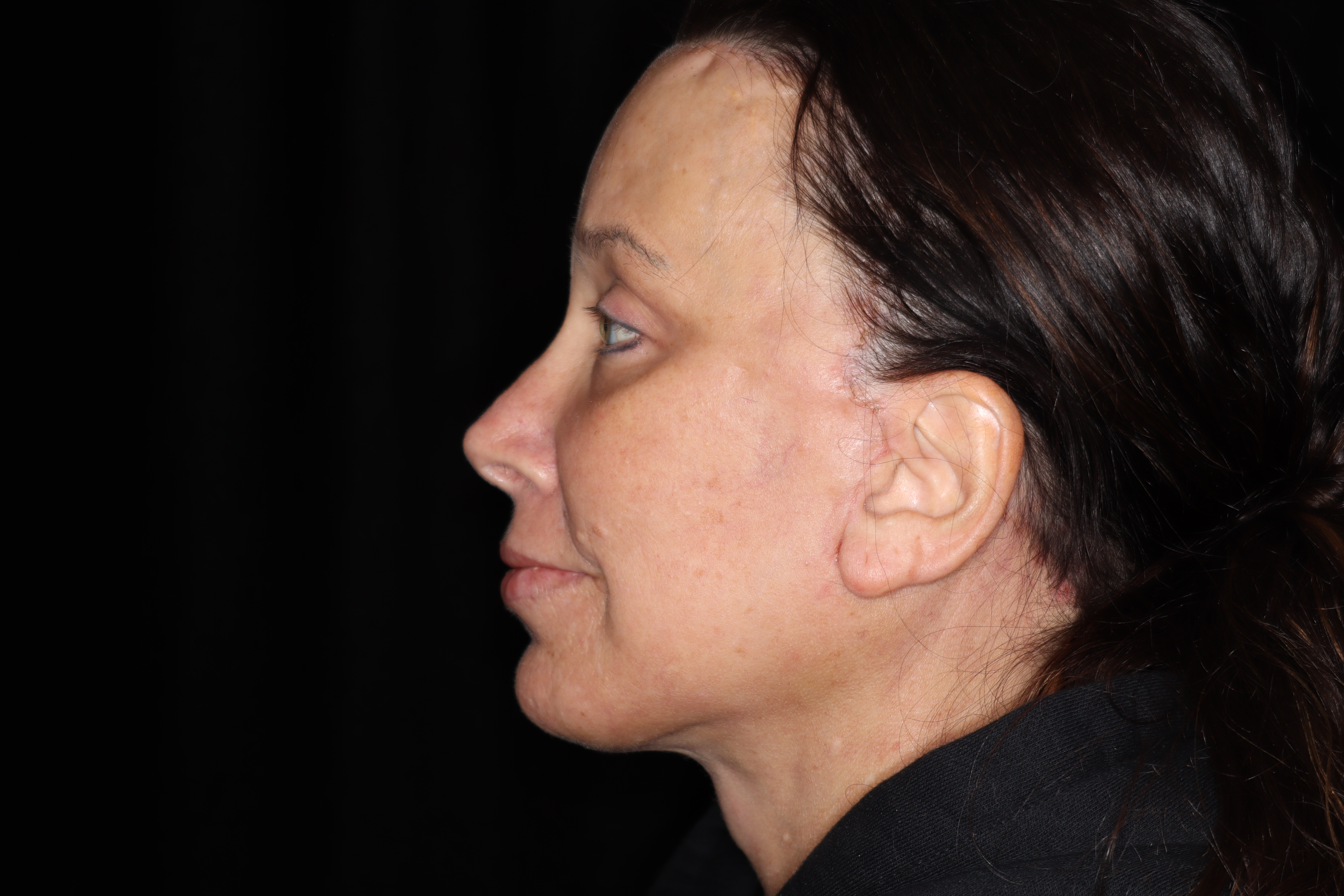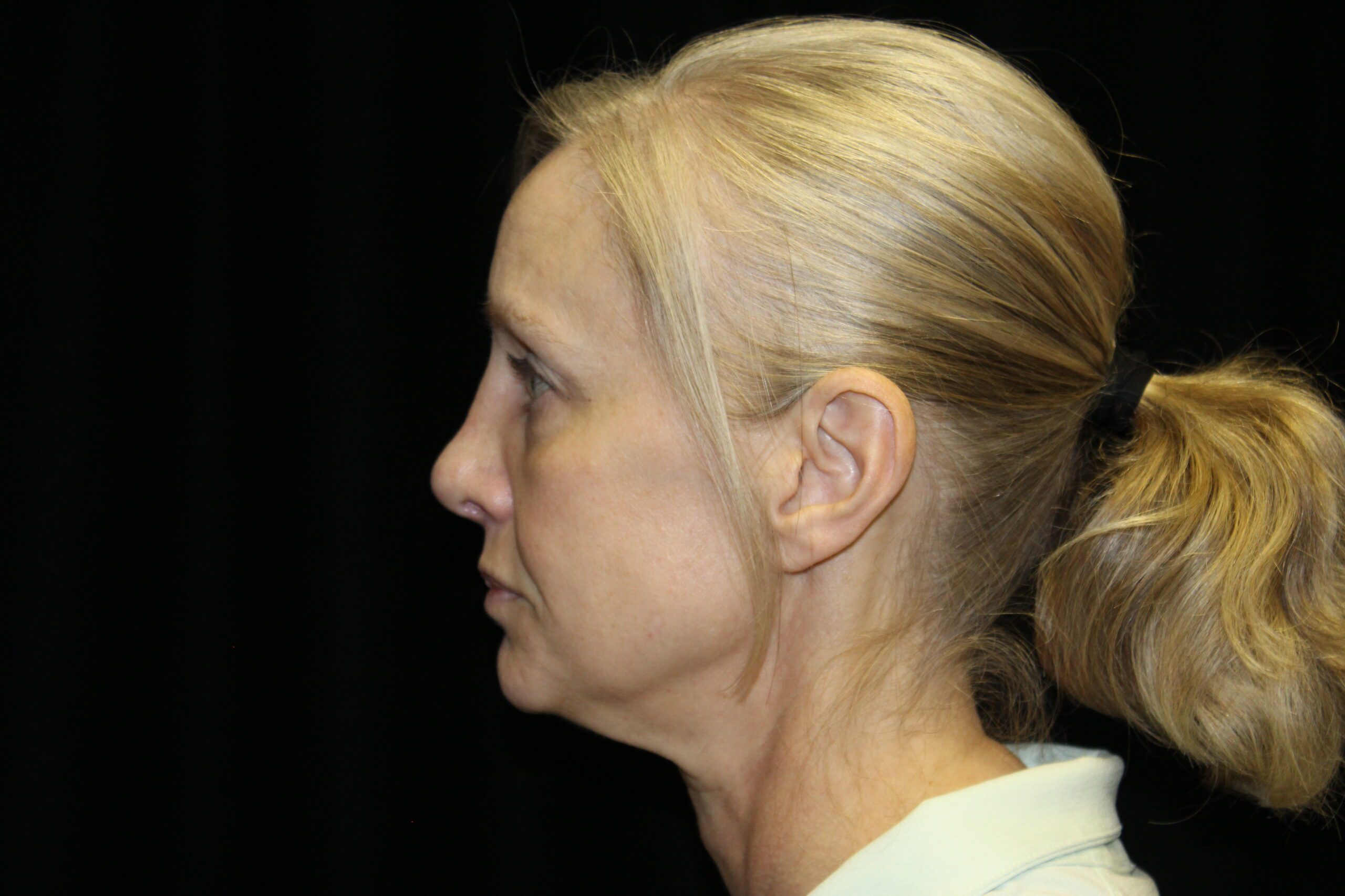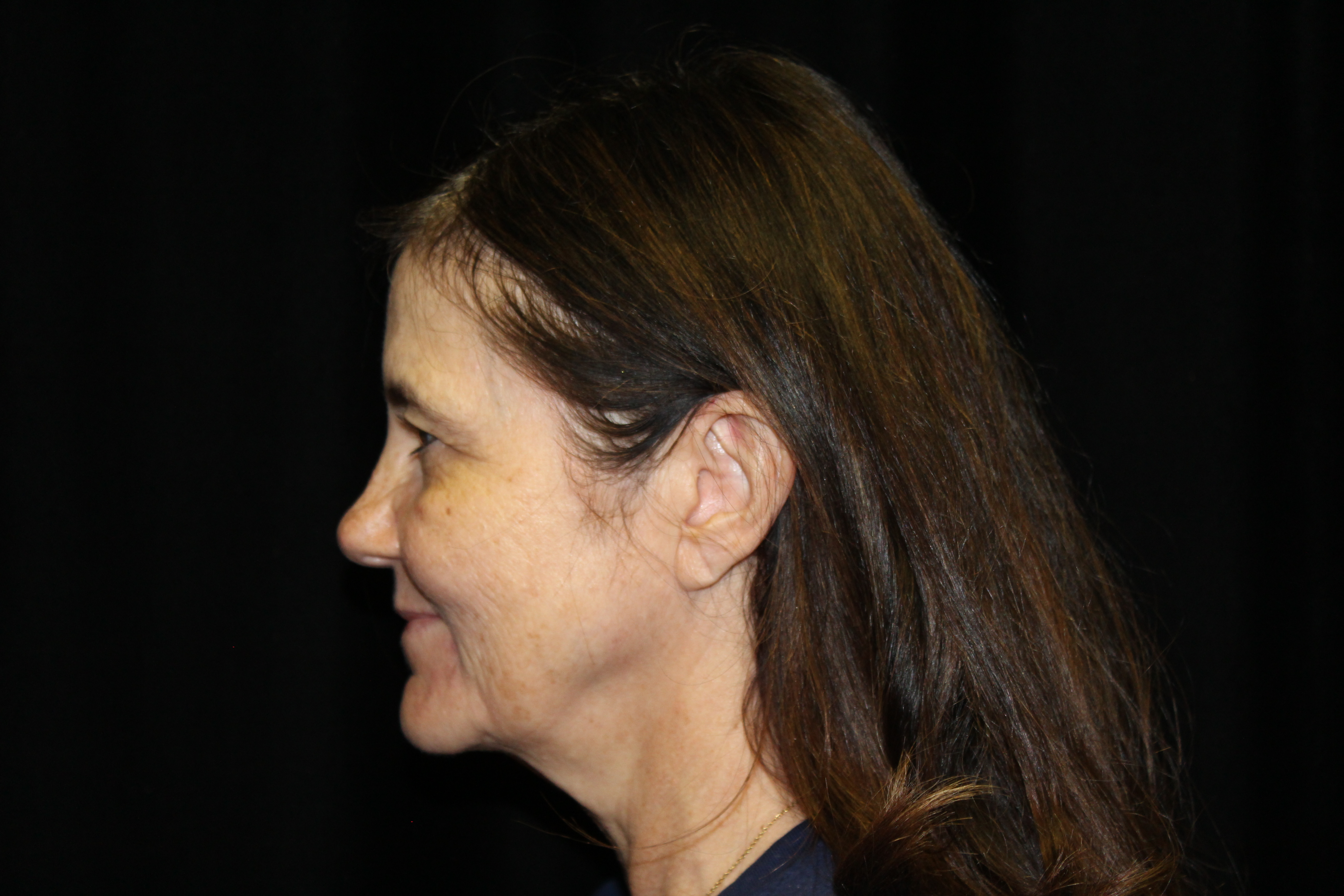 This is a 50YO lady that is starting to get some generalized looseness of her face and neck. She has lost the border of her mandible and had an obtuse angle to her neck. Ideally we like to have close to a right angle in the neck going up to the chin area.