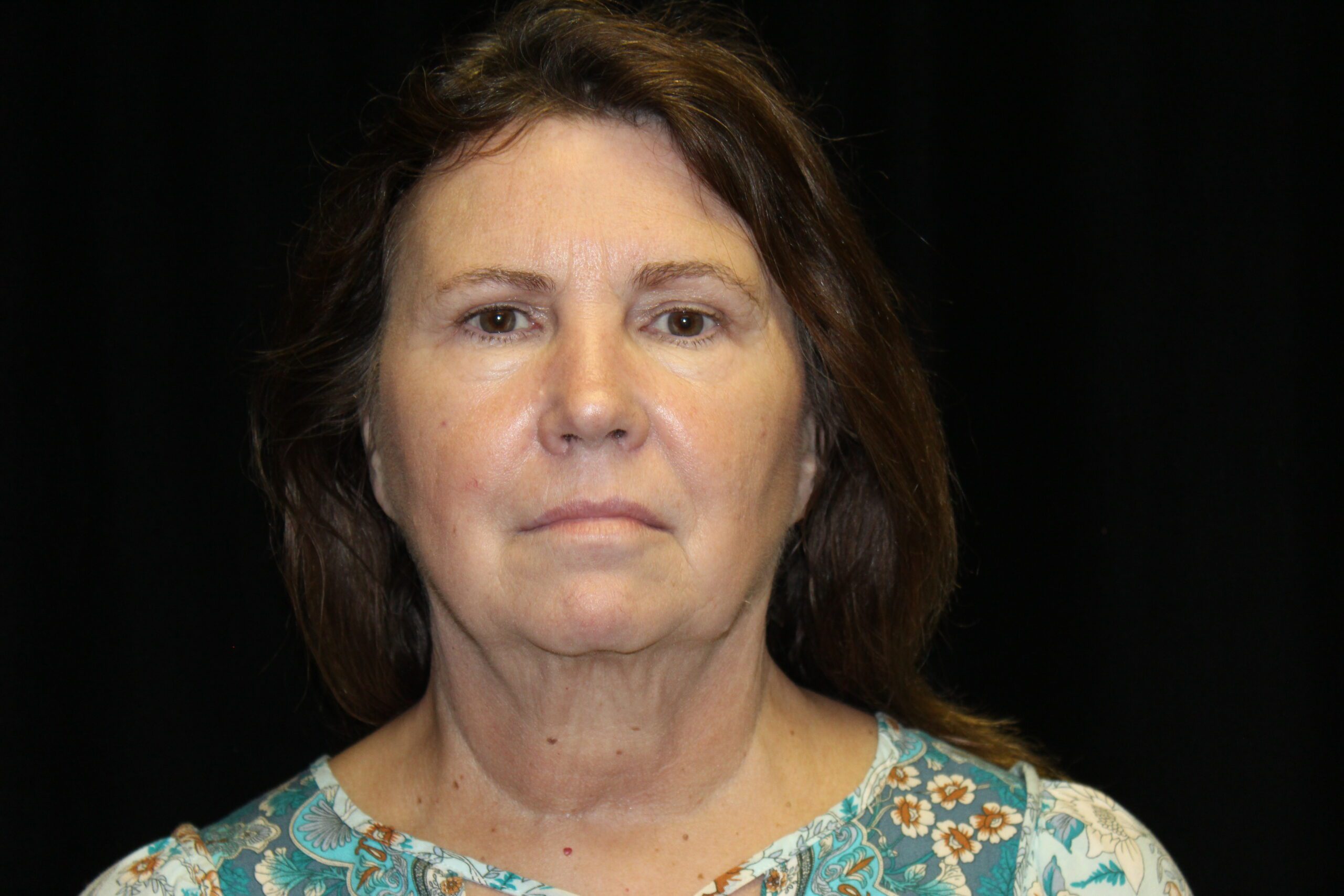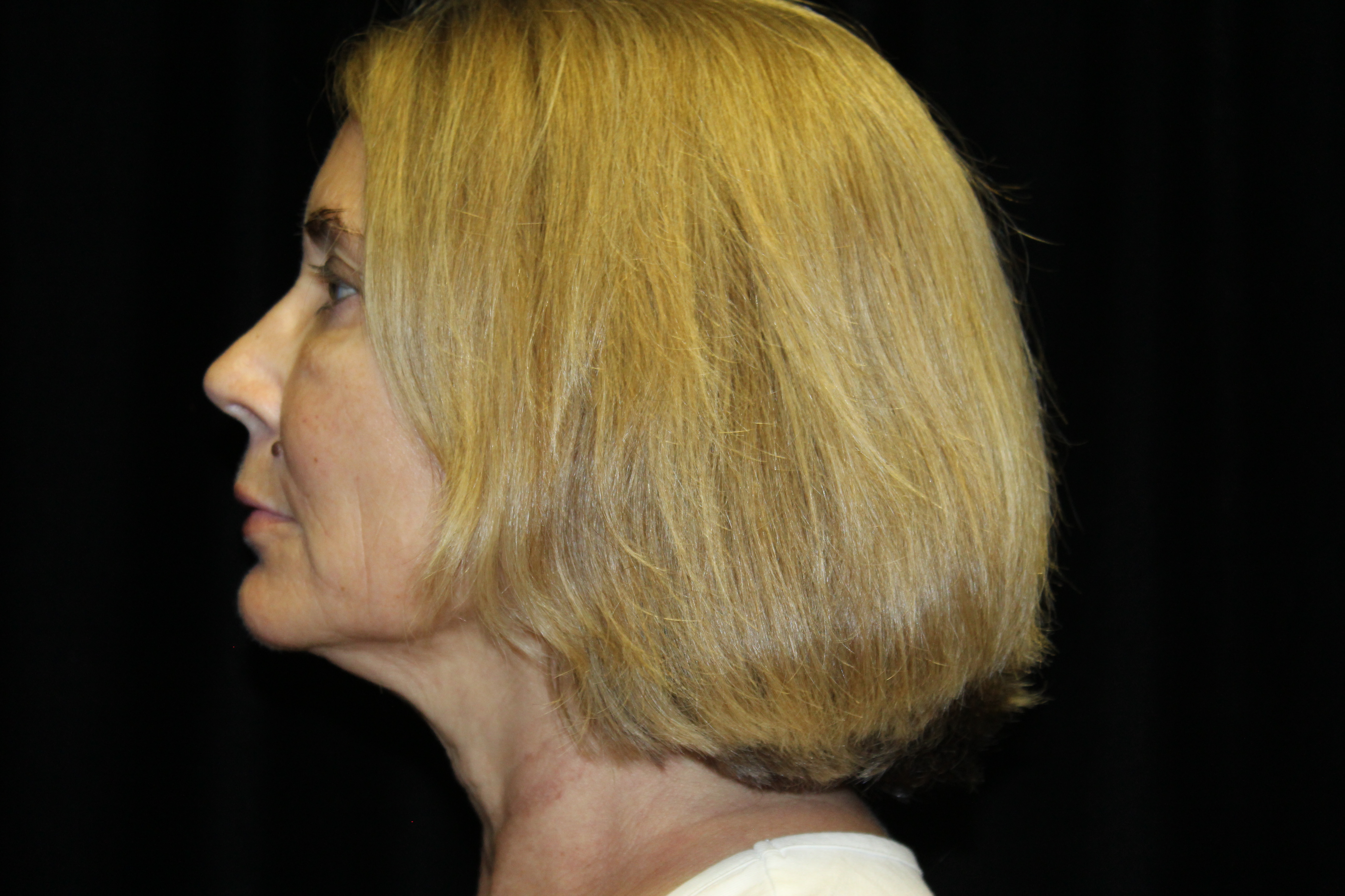 This is a lady that desired some facial and neck rejuvenation. When I examined her preoperatively, she had banding in the neck and loss of the mandibular border. She has some jowling and loss of fat between the chin and jowl. There is generalized looseness of her face and neck with low brows. She underwent face, neck, and brow rejuvenation. She now has a defined mandibular border and a more youthful appearance. This procedure is done in the office with IV sedation.