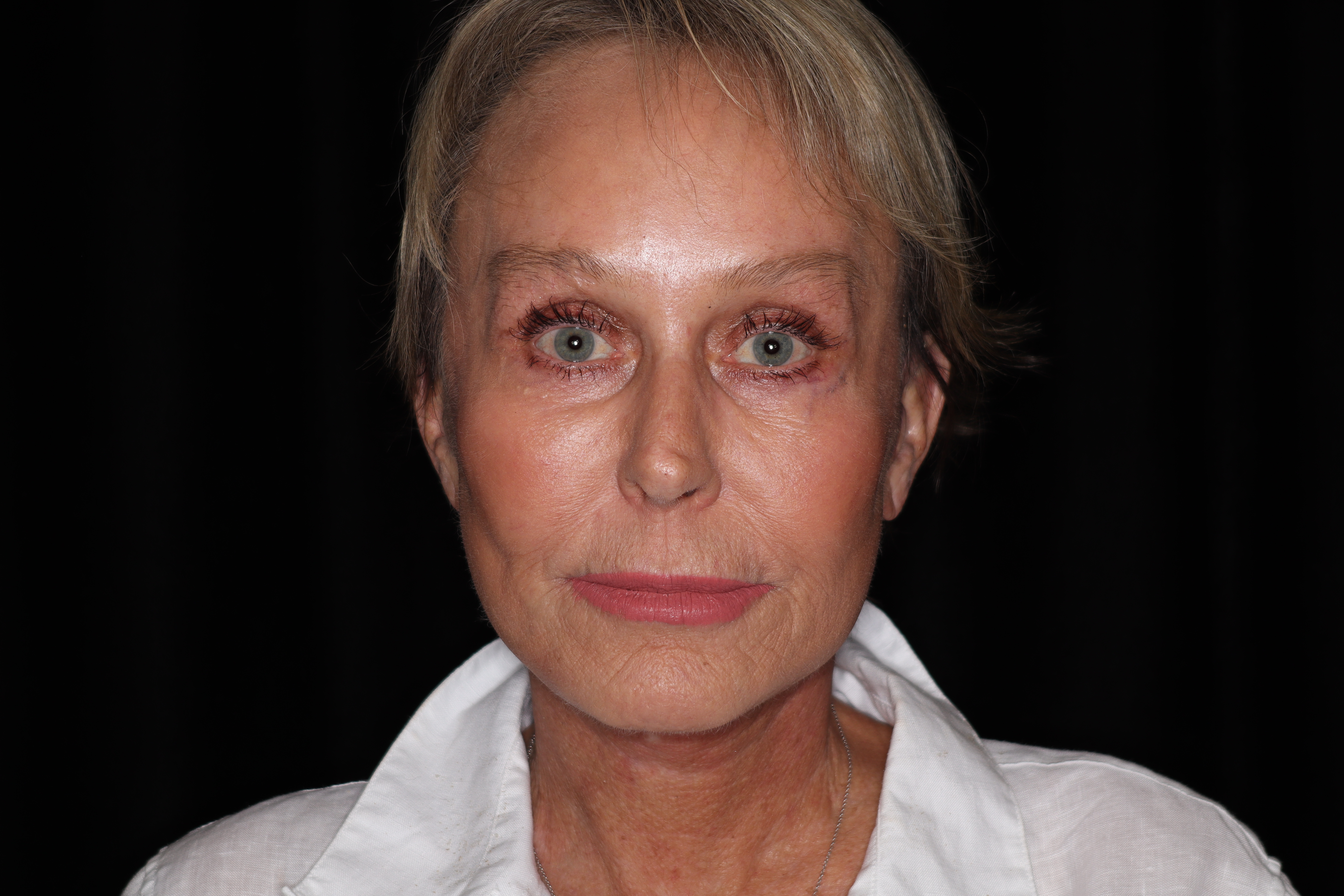 This is a lady that had really puffy lower eyelids with loss of fat below the puffy fat in the lower lids. She also had some extra skin in her upper lids and extra fat in the inside part of the upper eyelids. She underwent and upper and lower lid blepharoplasty with fat grafting. Postoperatively she looks much more vibrant and more youthful. She has gotten numerous complaints on her youthful appearance and is very pleased with her results. This procedure is done in the office with IV sedation.