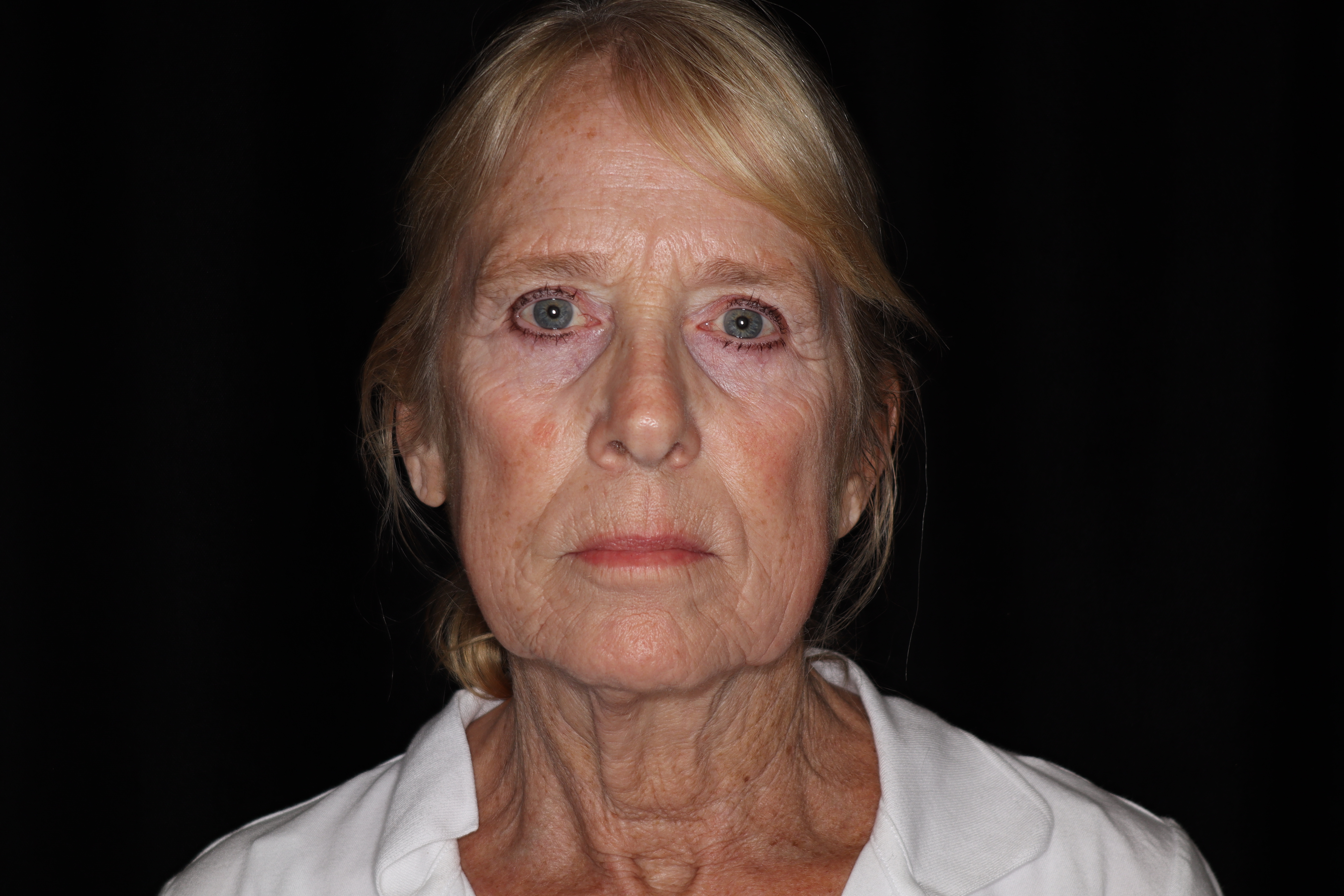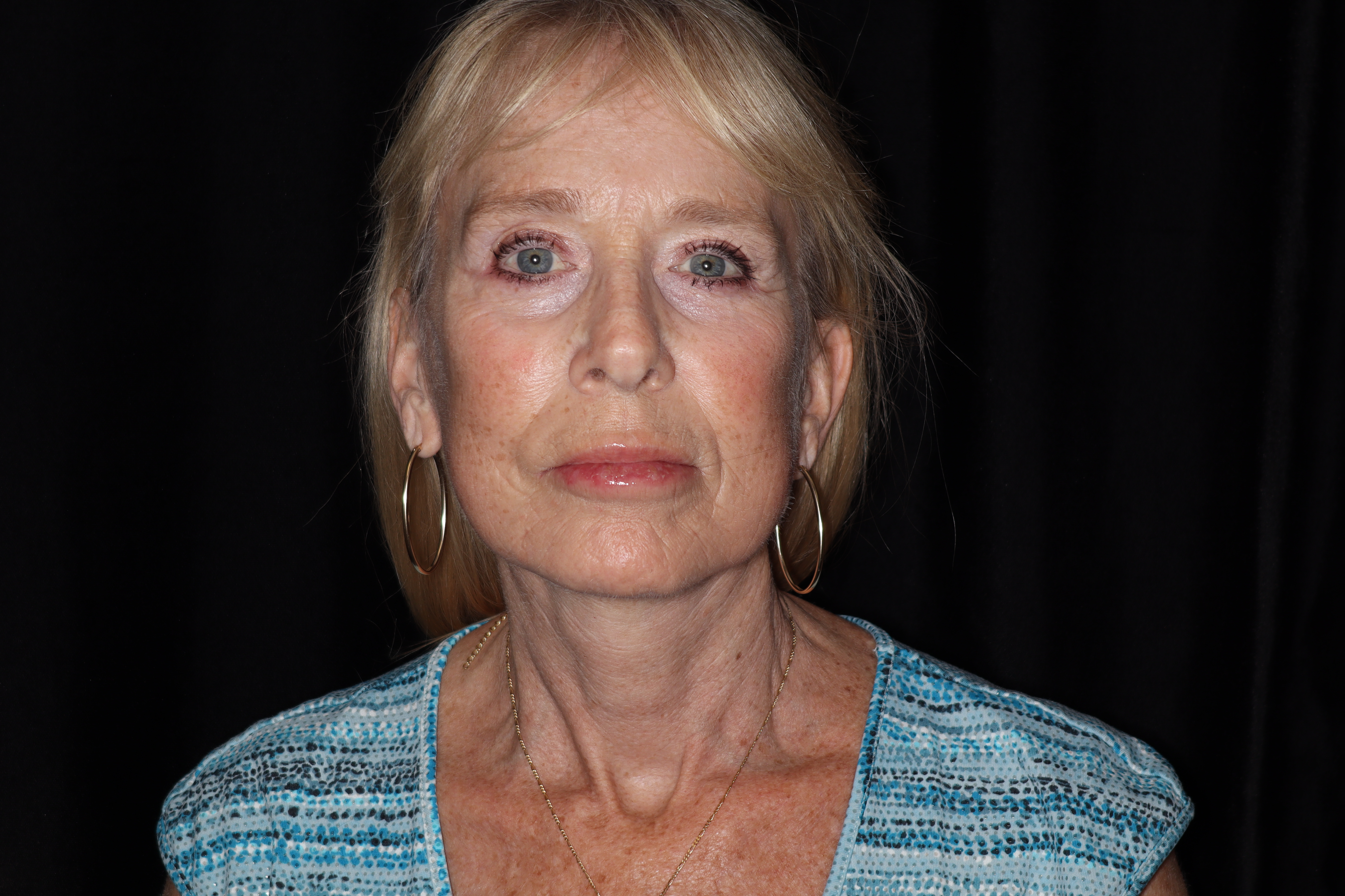This is a 56 year old lady who has a lot of looseness in her face. She has prominent banding in her neck, this is playtsmal banding. She has some fallen fat in the buccal area that has fallen inferiorly. There is generalized looseness of the face and brow. She has some ringing around the lower eyelid which is called marginalis. She underwent face, neck, and brow rejuvenation. I also did some fat grafting to the face to fill out the lips, prejowl area, and also underneath the eyelids. This procedure is done in the office with IV sedation.